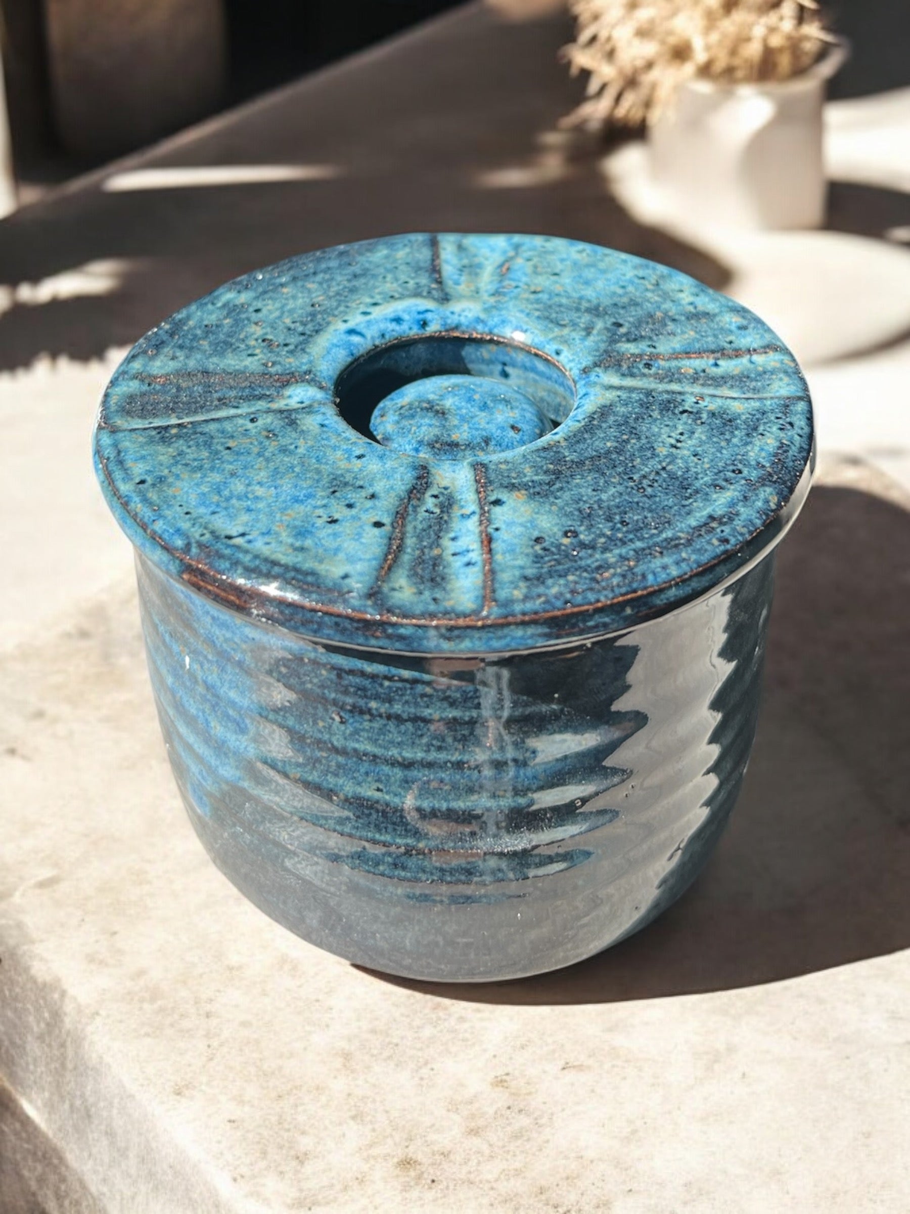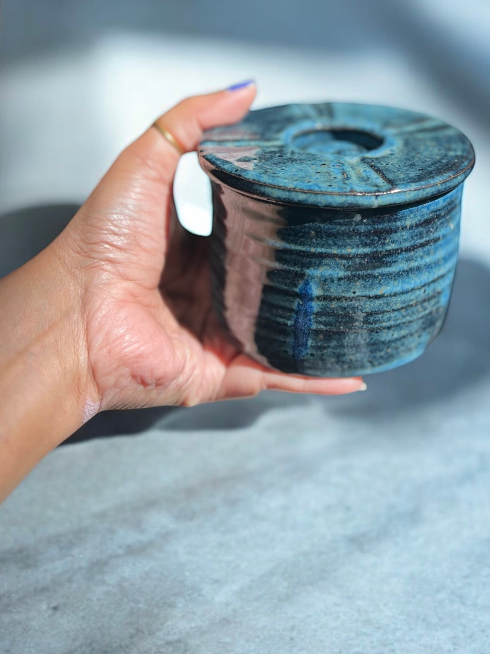 This Ash tray is thrown in two parts and trimmed on the wheel. It comes with a lid. This is available in different colors.