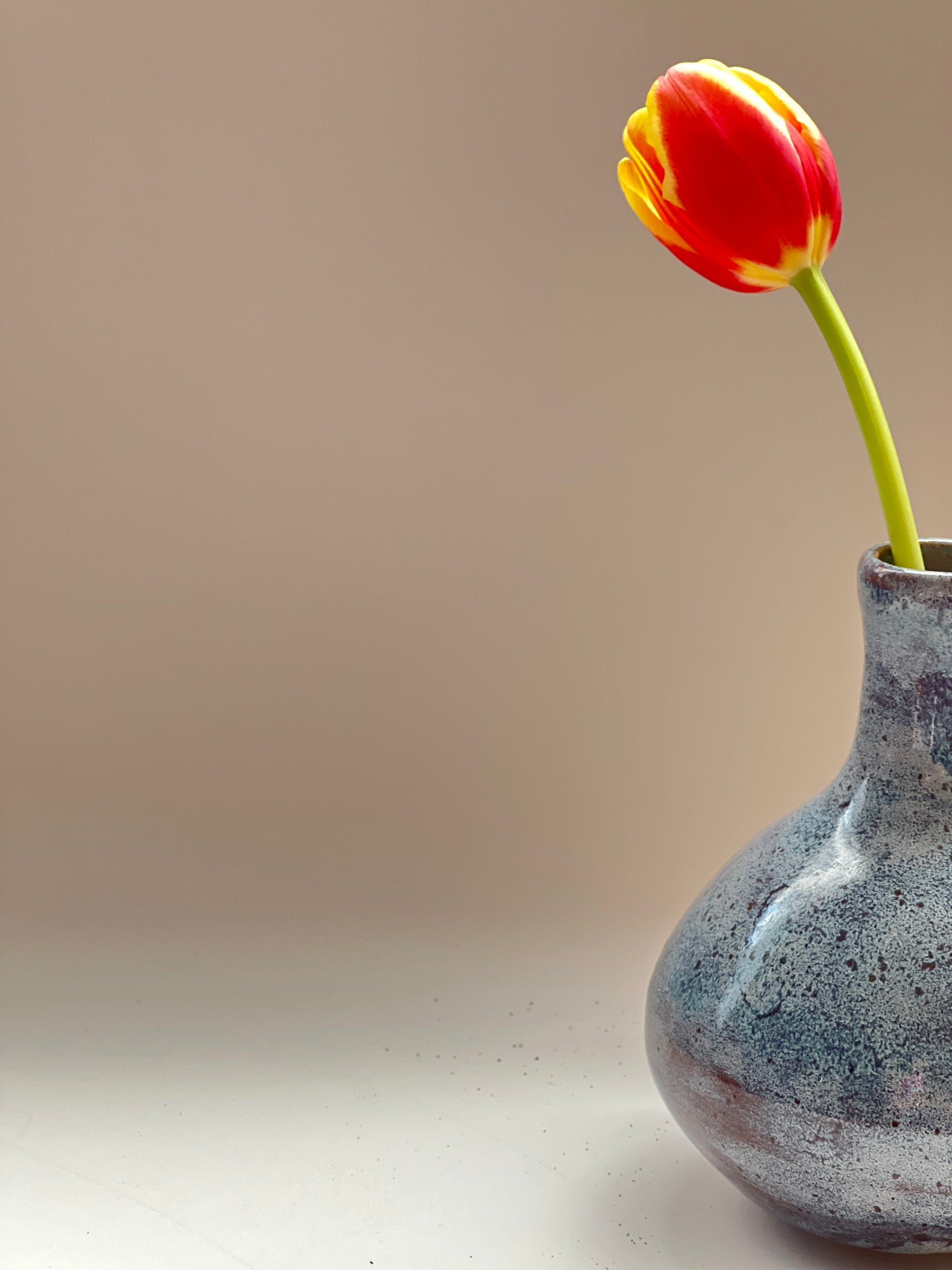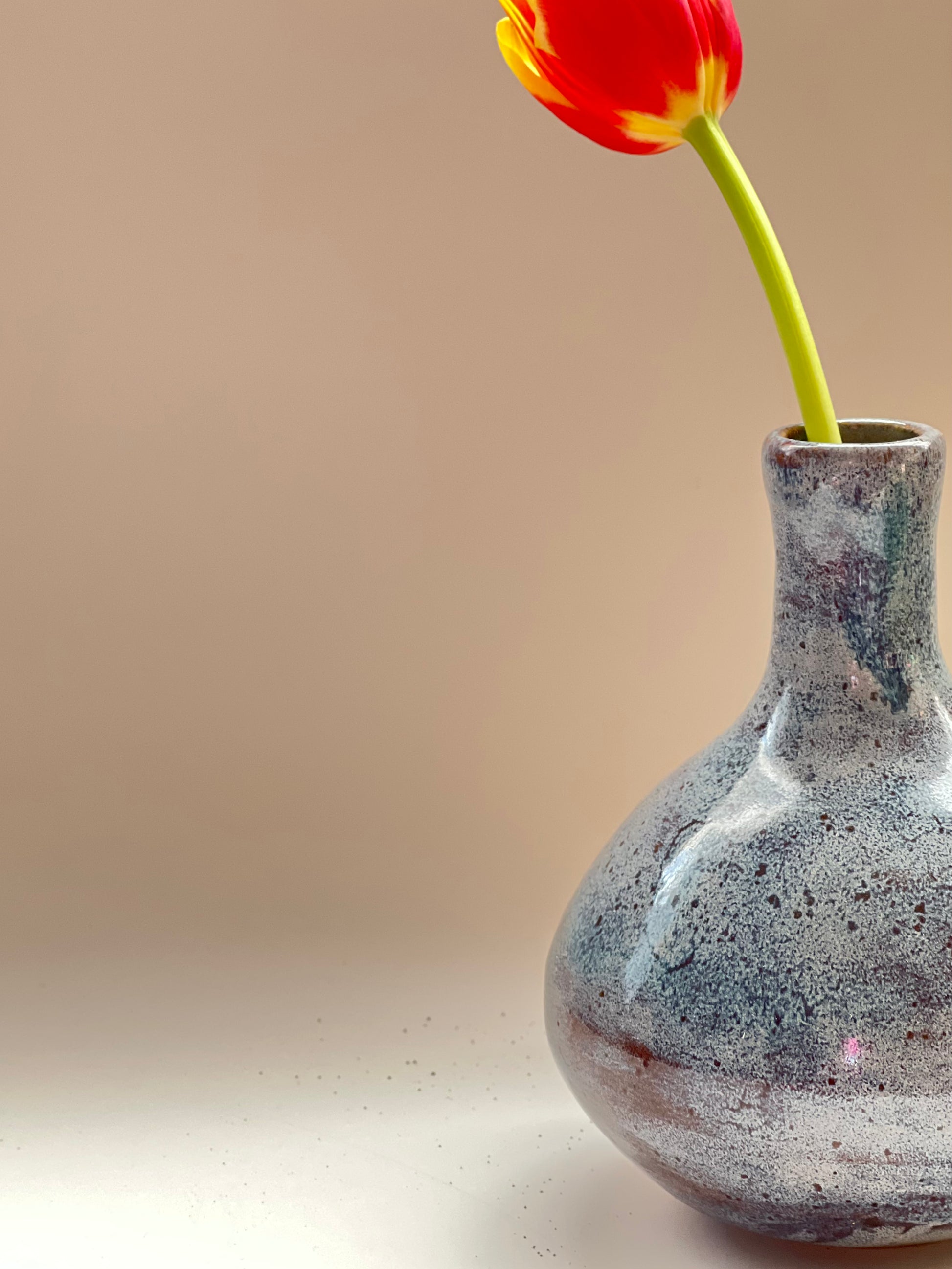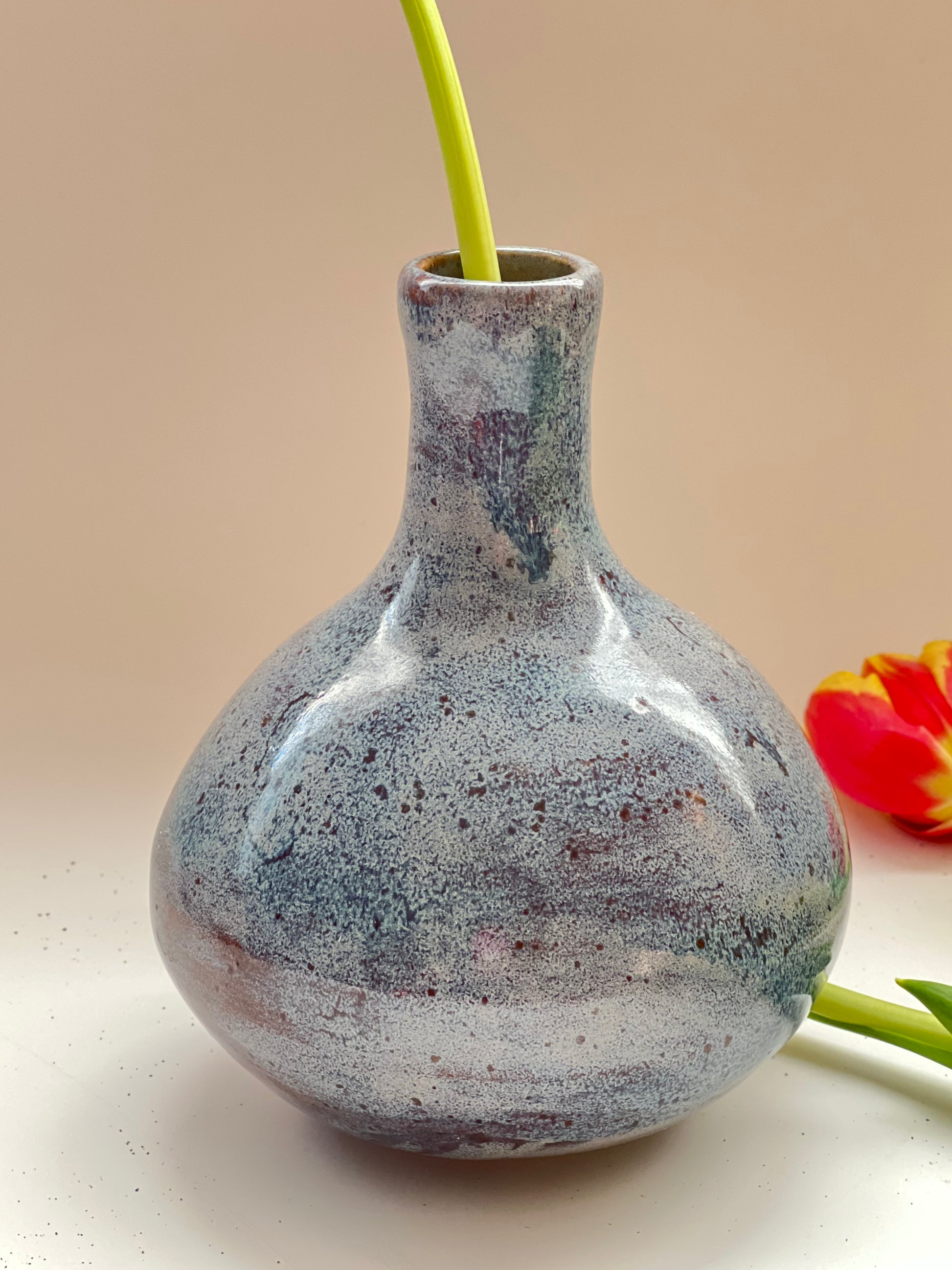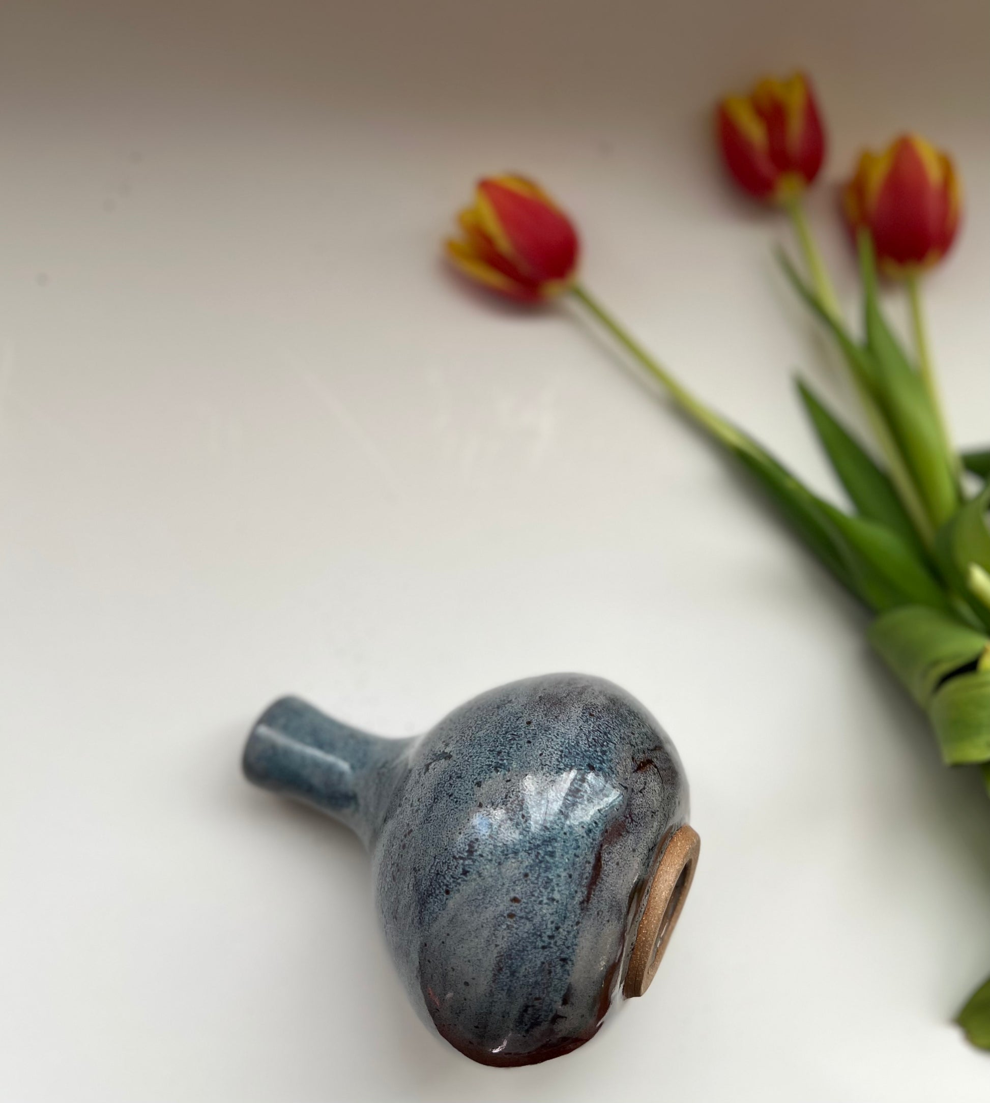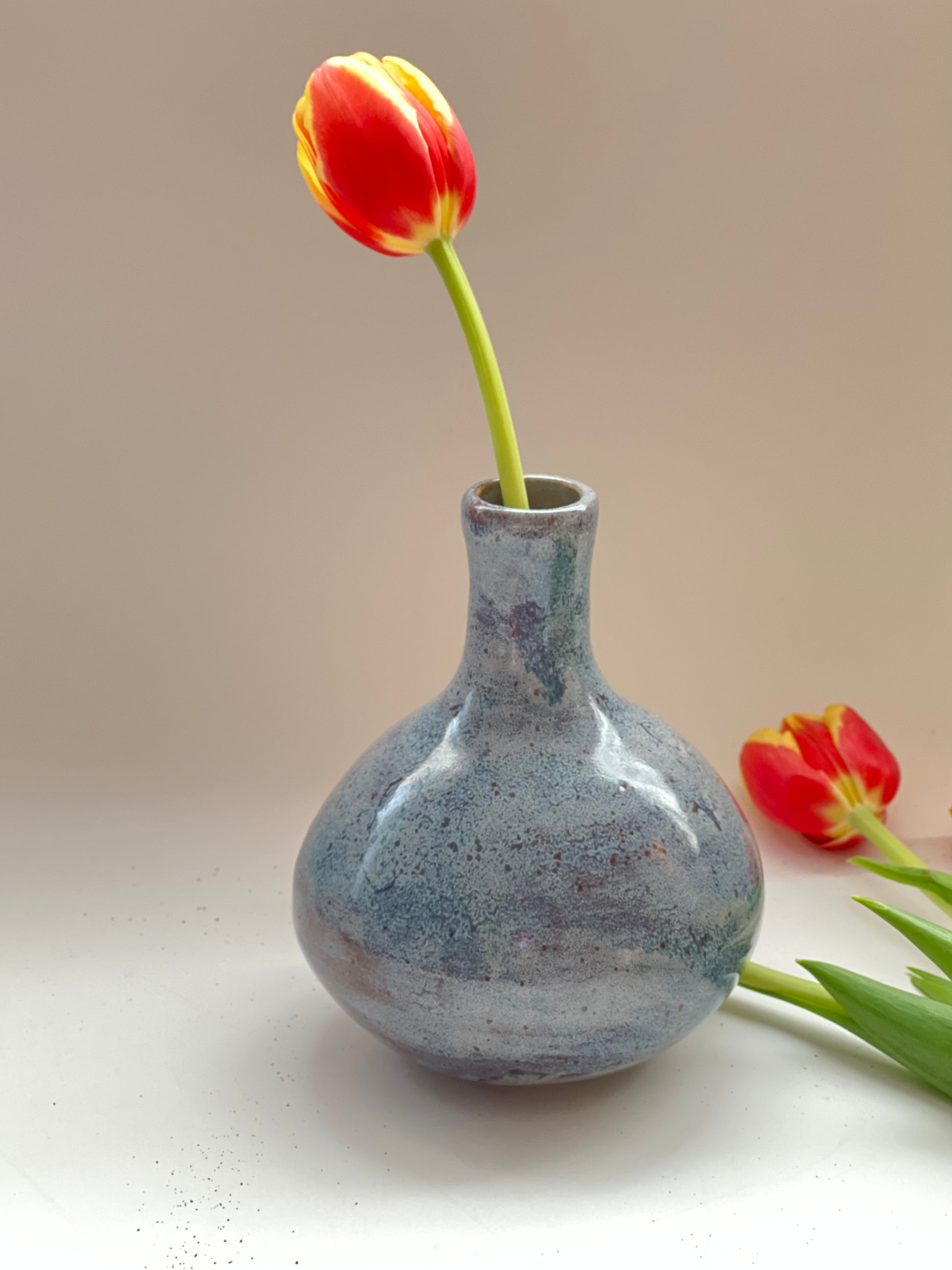 This one of a kind vase is made of brown stoneware clay. Thrown on the wheel ,trimmed and fired to a higher temperature. All my pots are glazed in and out for being functional. This beautiful blue vase has two glazes over it. The brown speckles that's seen is the result of layering two glazes together.