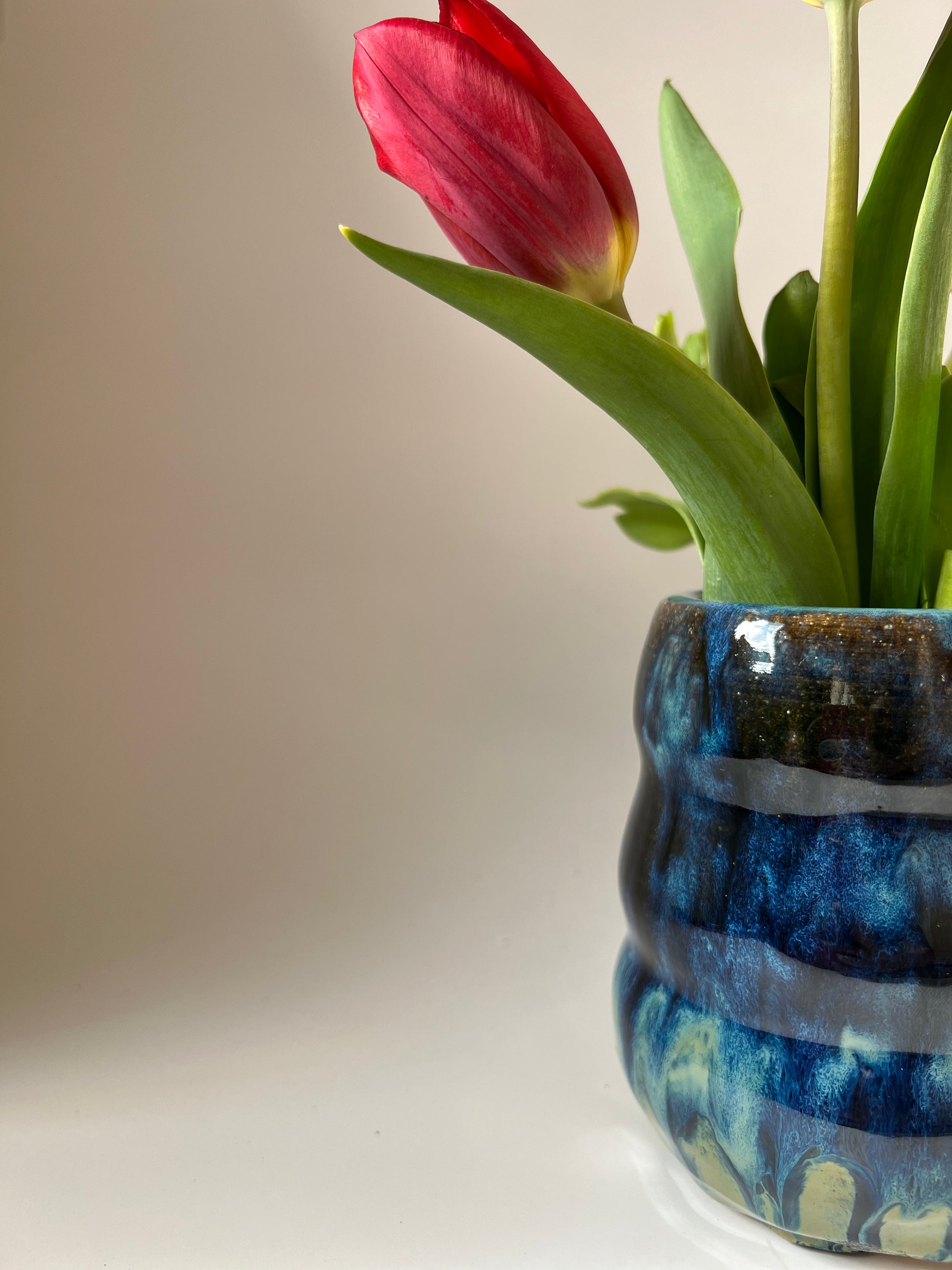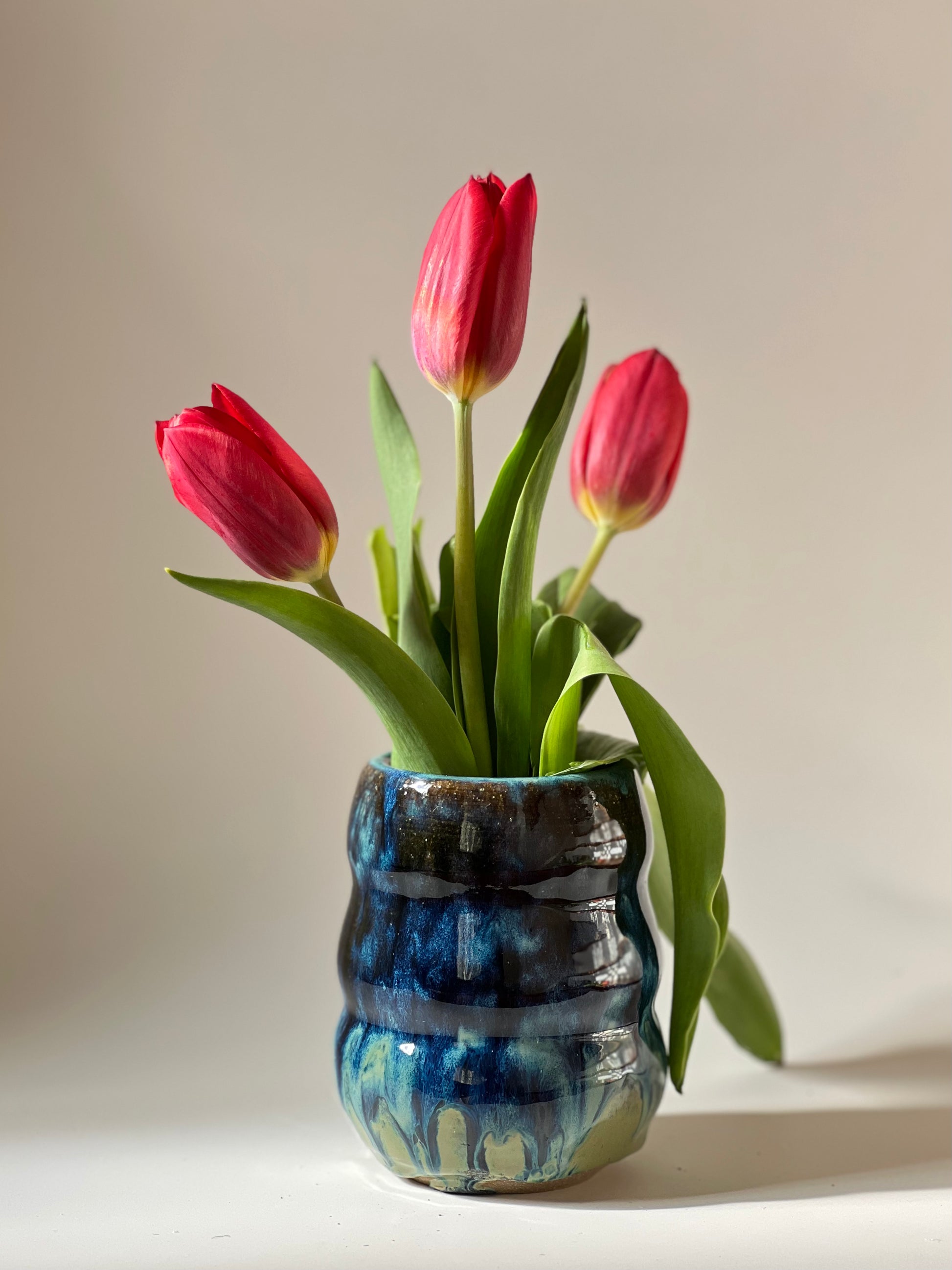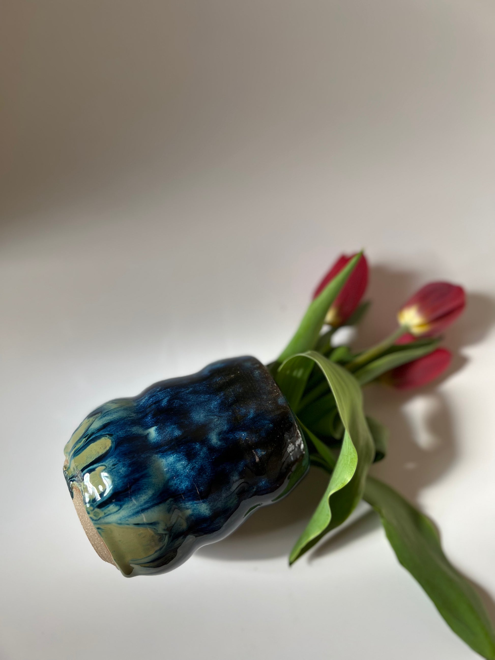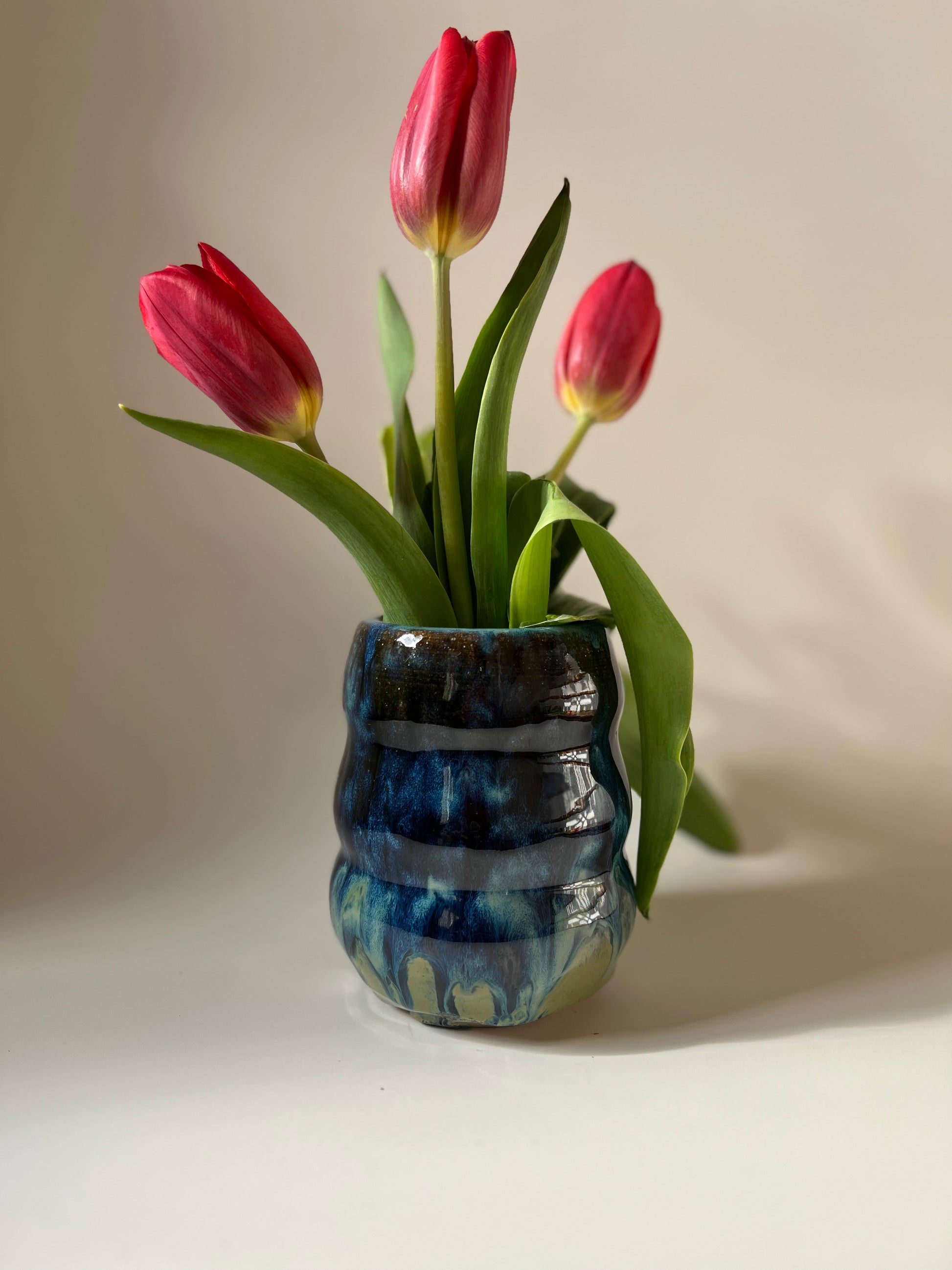 This beautiful blue bubble vase is made of brown stoneware clay. It is layered with multiple glazes on the inside and outside, which makes it waterproof . It is thrown on the wheel , trimmed and fired at a higher temperature.