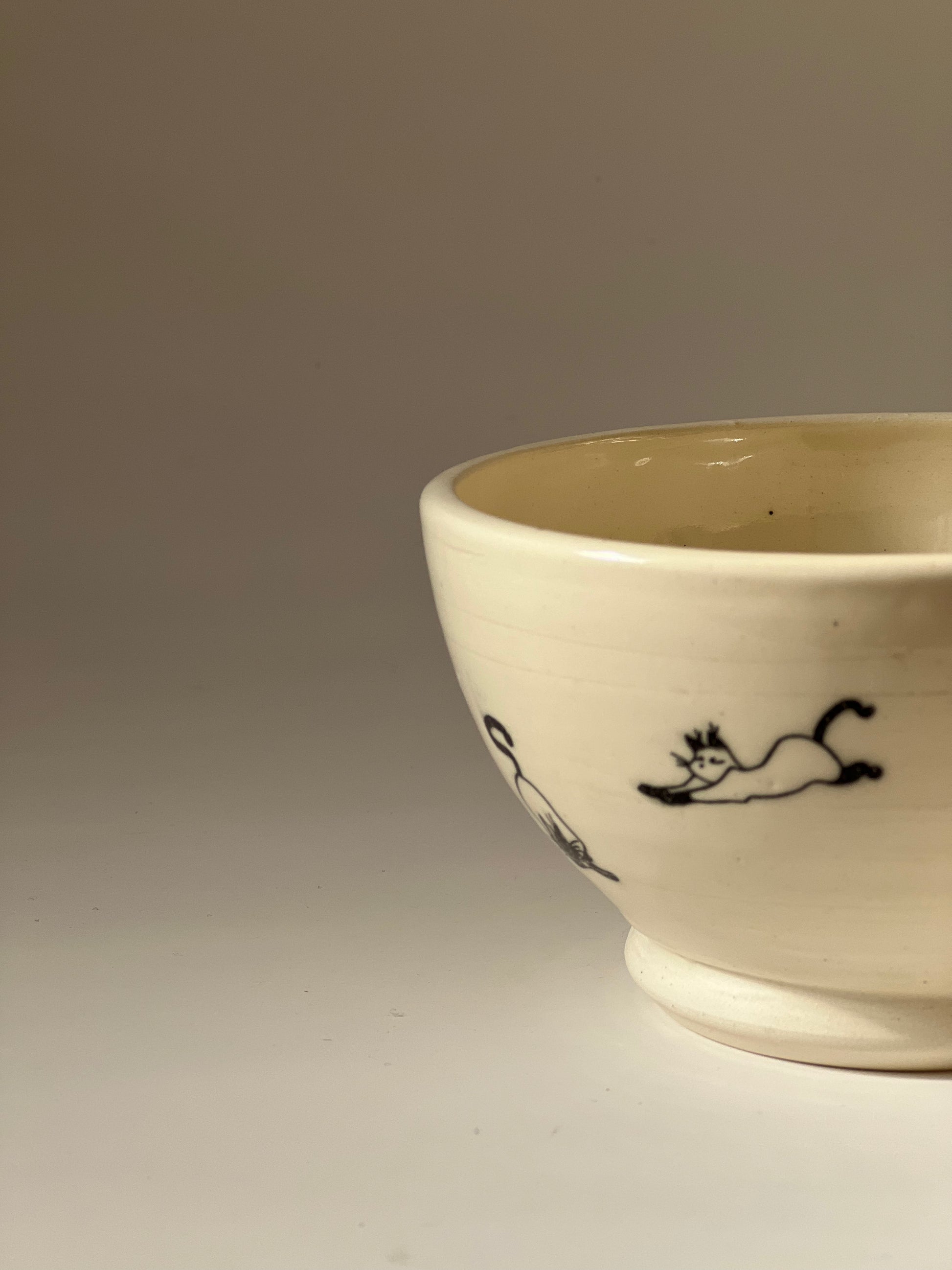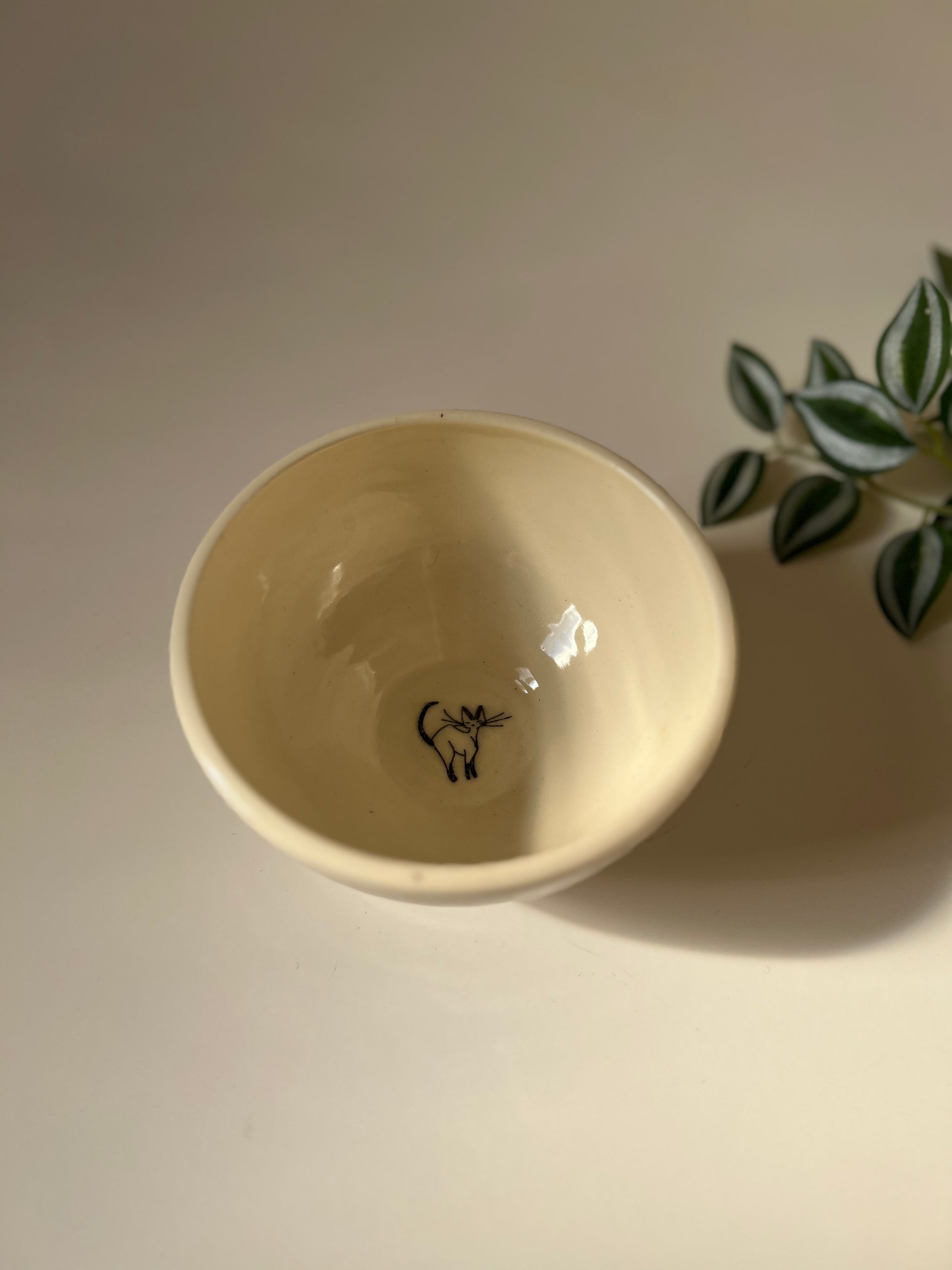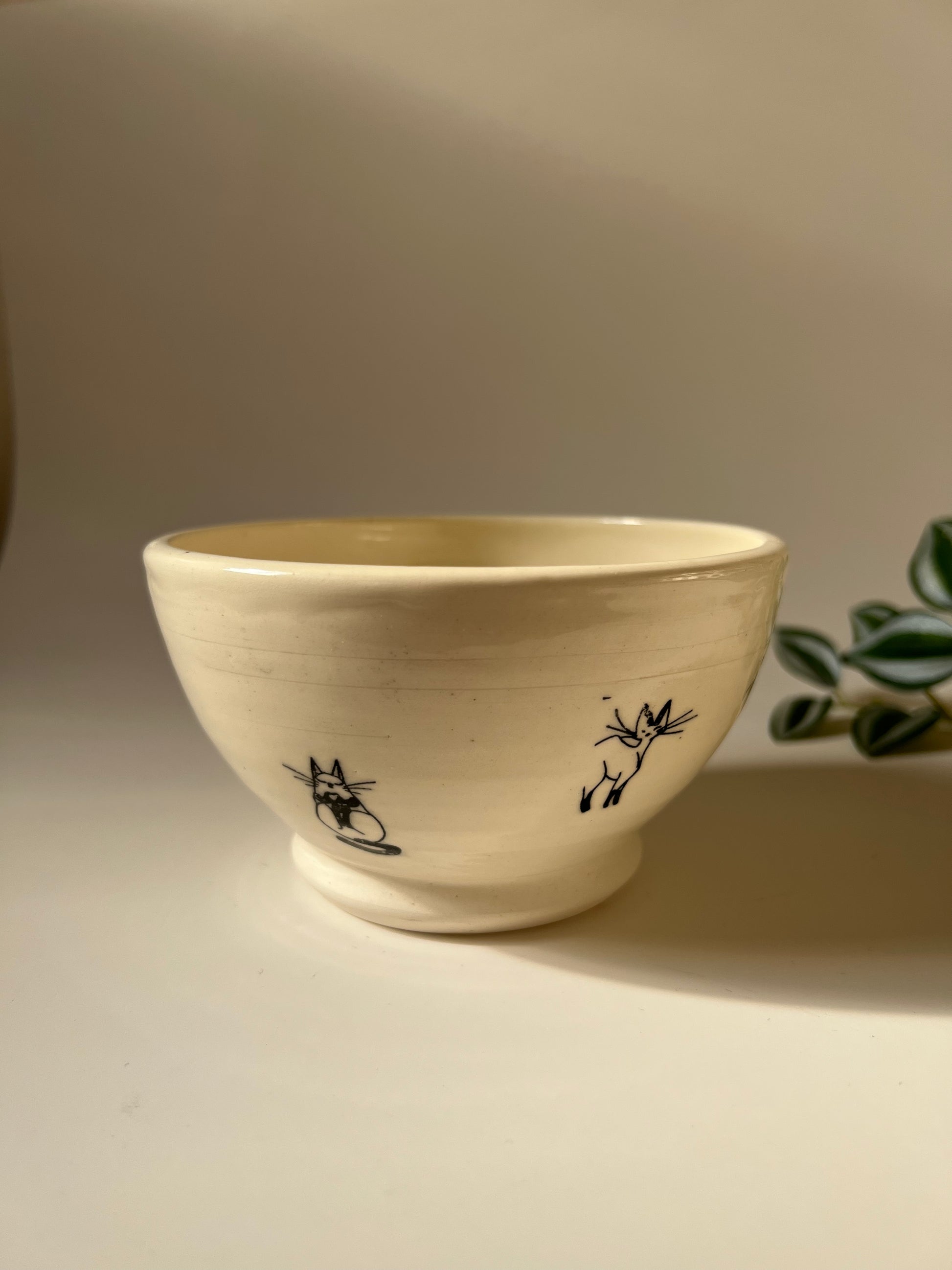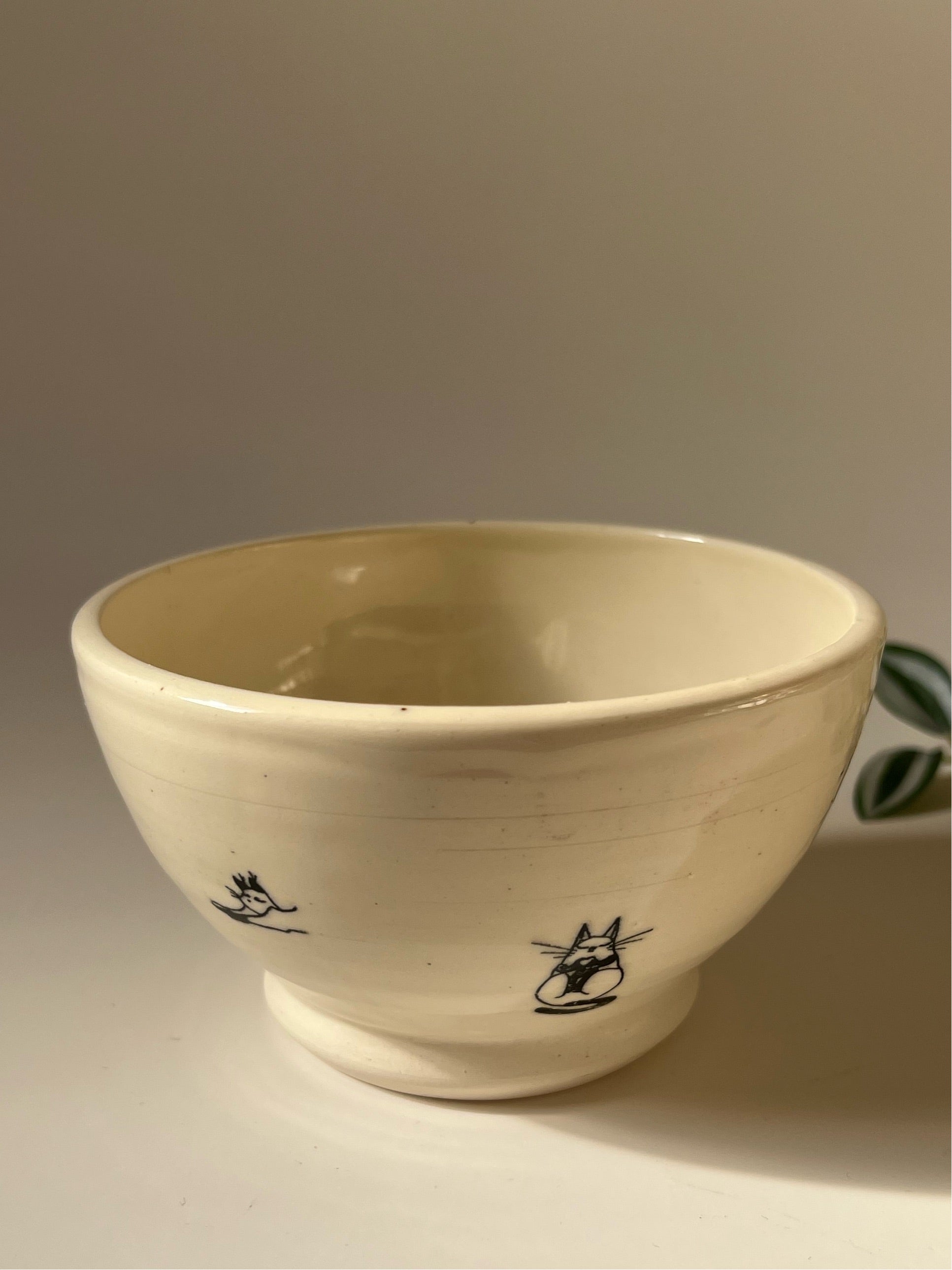 This simple cute bowl is made of white stoneware with cat drawing on it and is perfect for cat lovers. It has a single liner glaze with cat prints fired at a higher temperature. All of the pots are food safe, microwave safe and dishwasher safe. Although handwashing is recommended to make it last long.