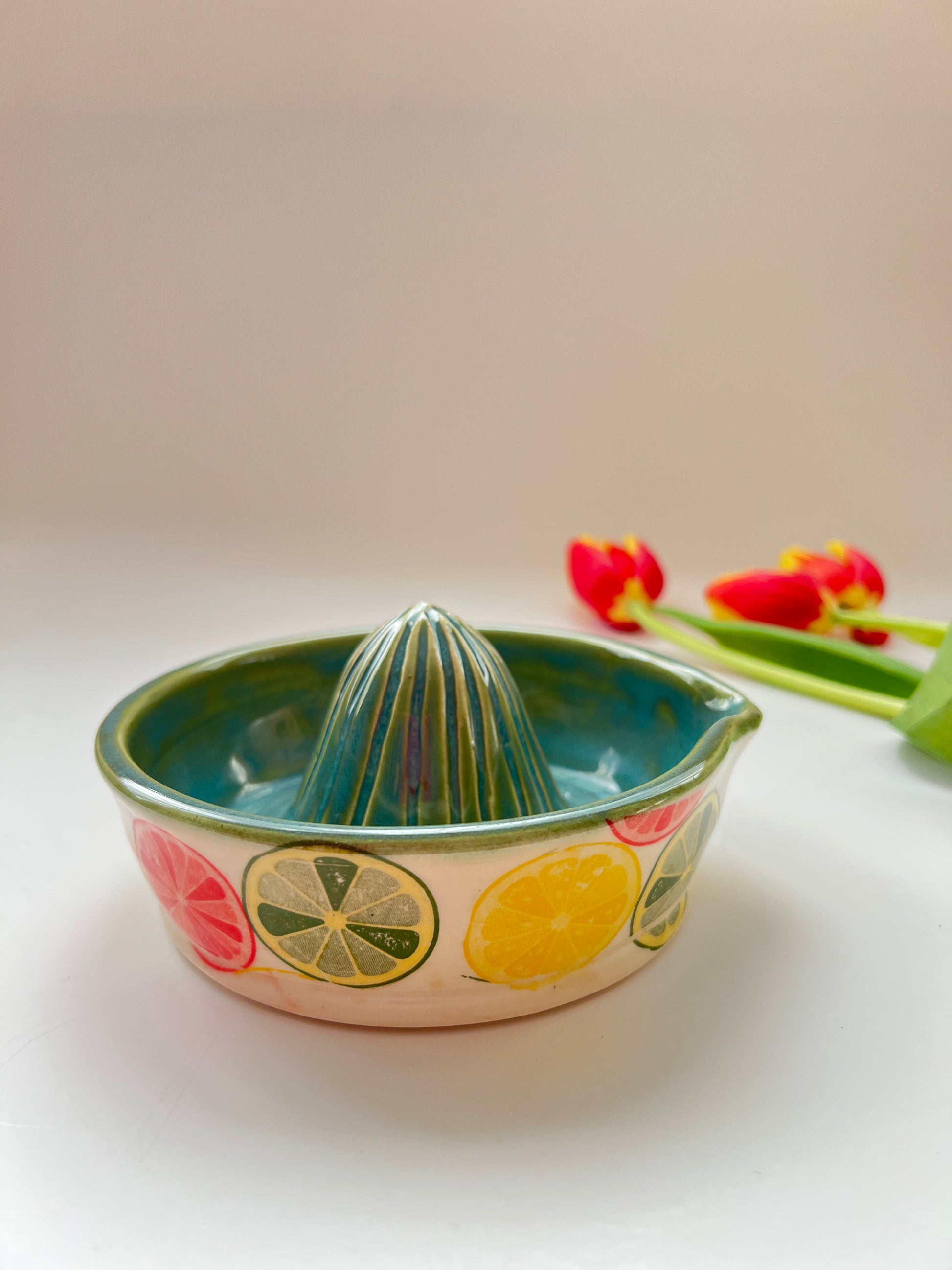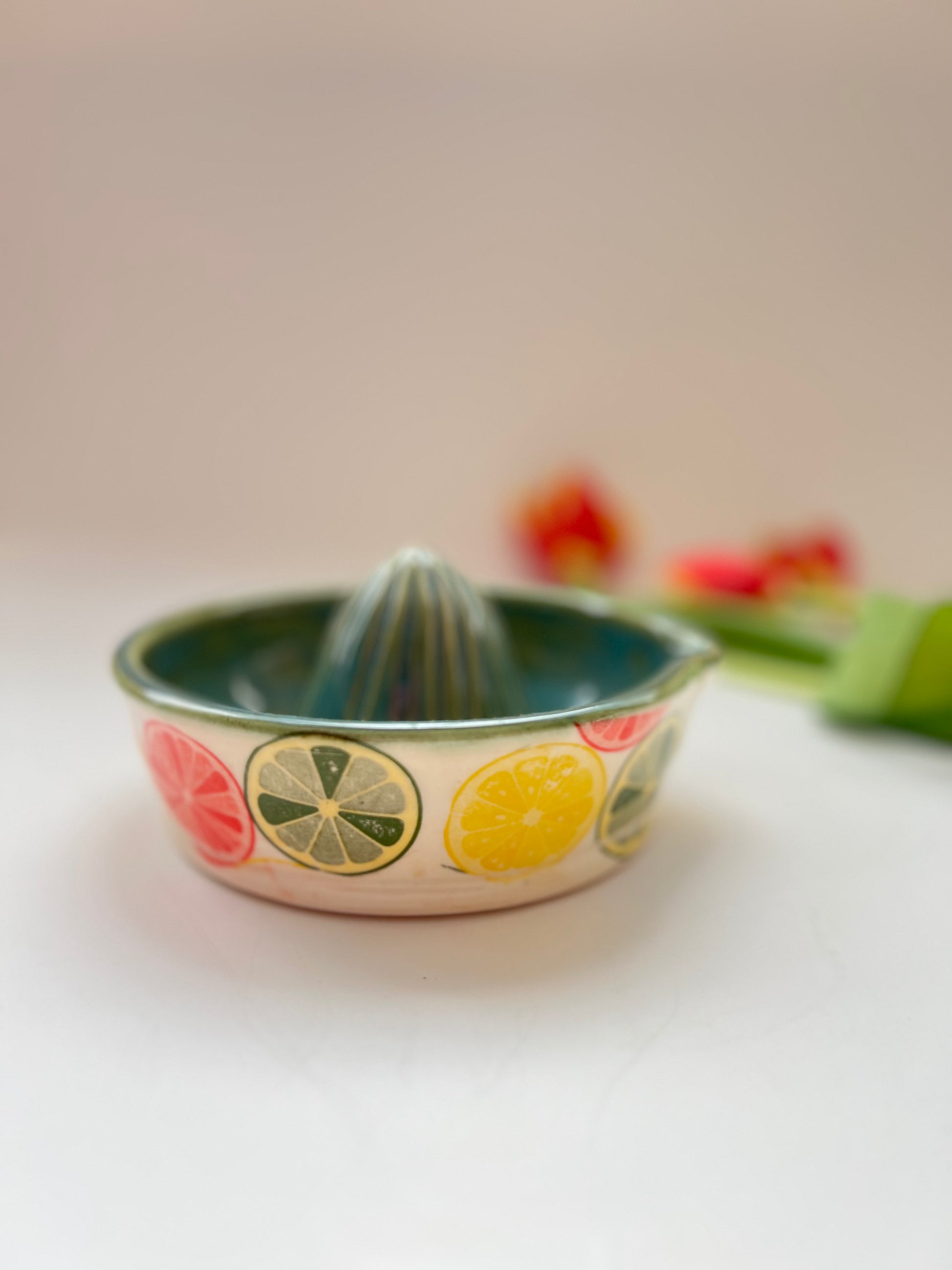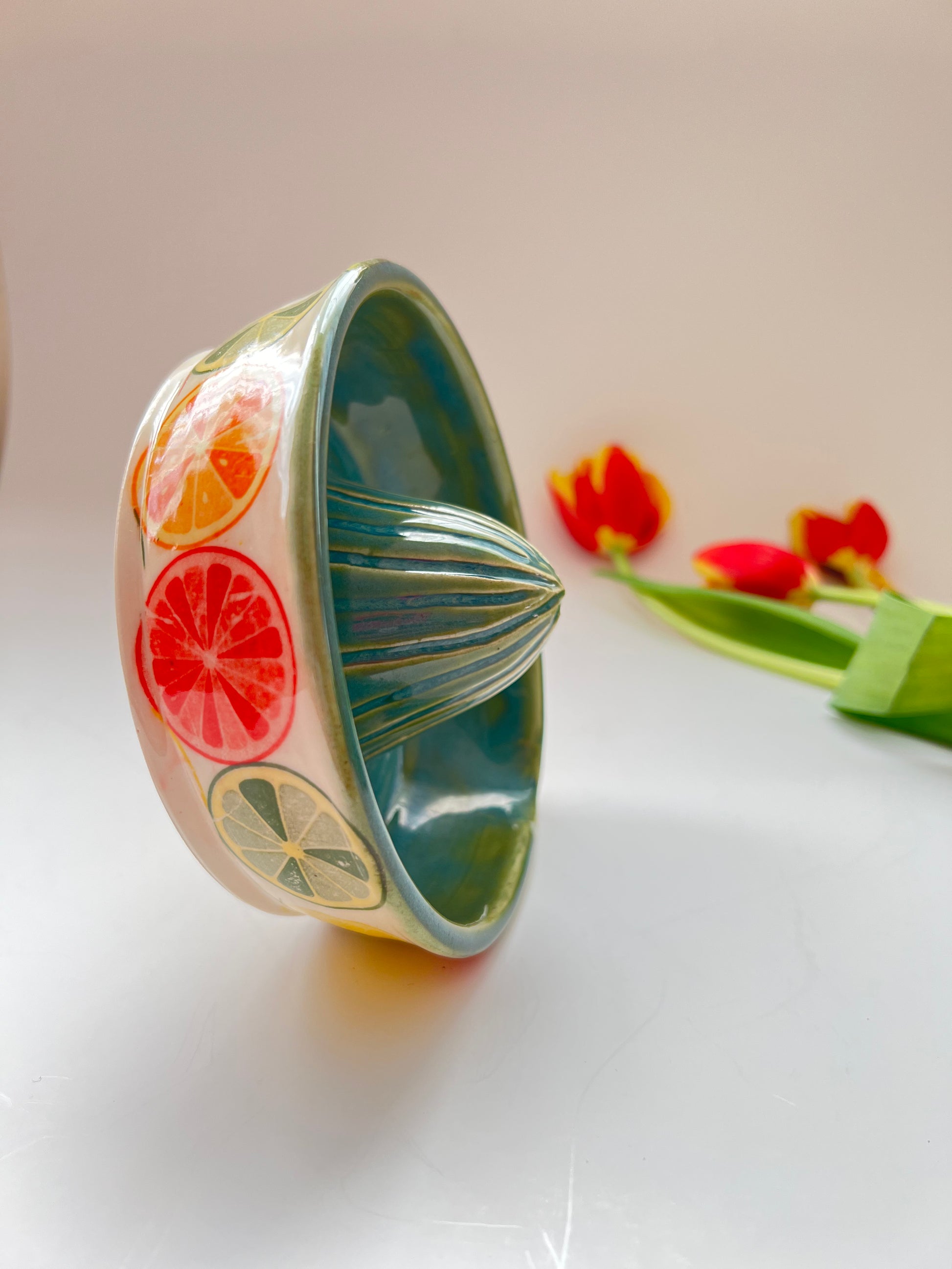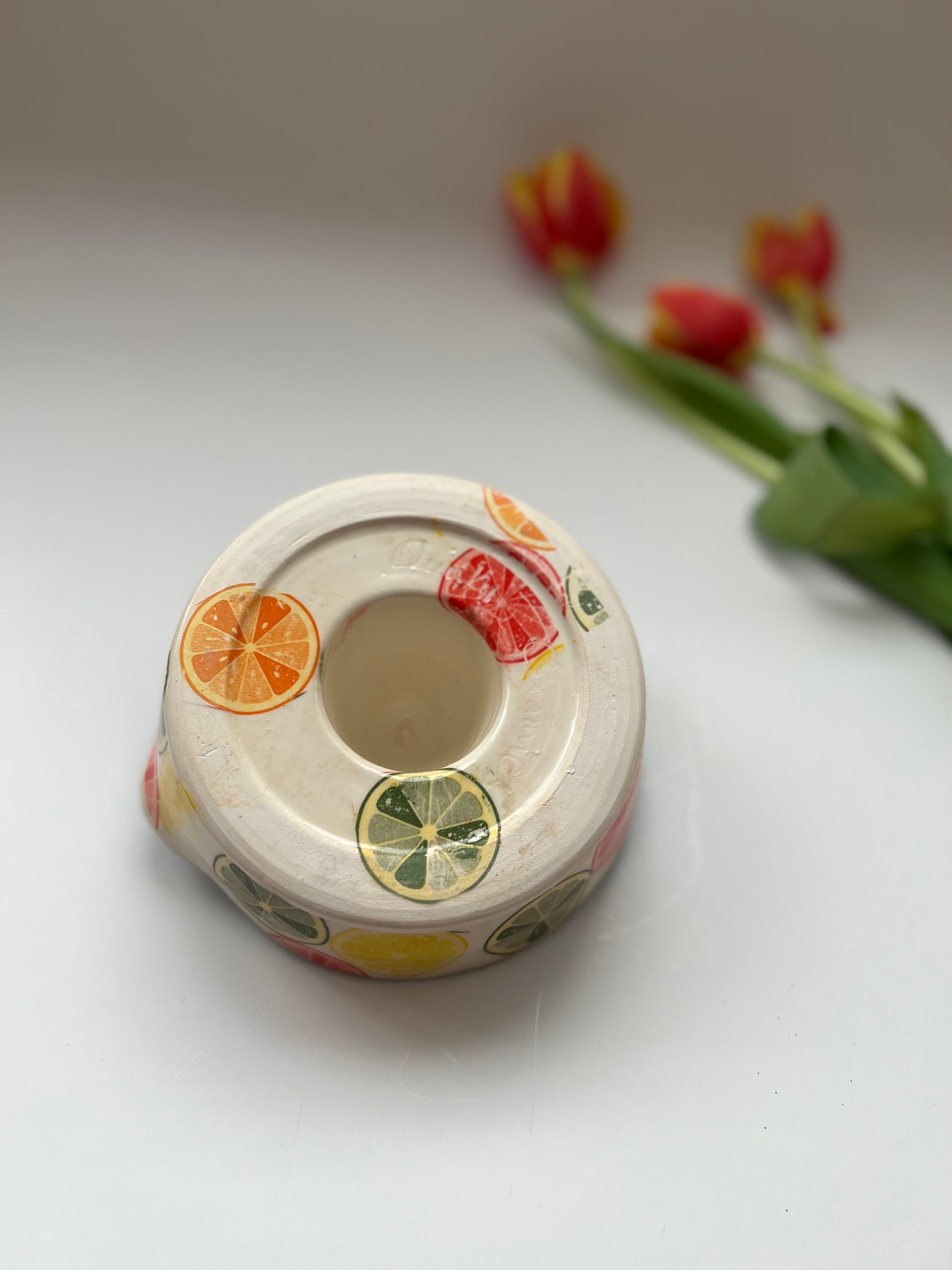 This unique piece is made of white stoneware. It is thrown on the wheel, trimmed, decorated with cute designs and then fired at a higher temperature. It has two different glazes and is a one of a kind which makes a great addition to your collection. All of the pots are food safe, microwave safe and dishwasher safe. Although handwashing is recommended to make it last long.