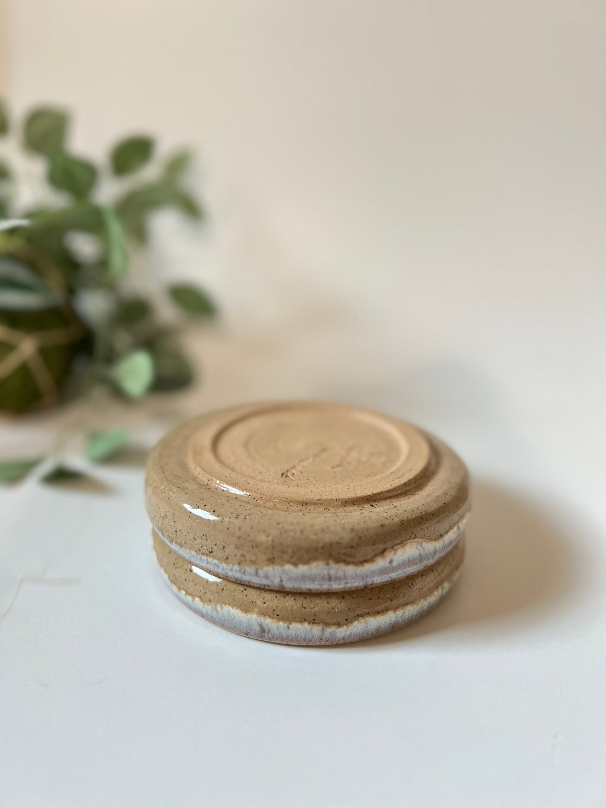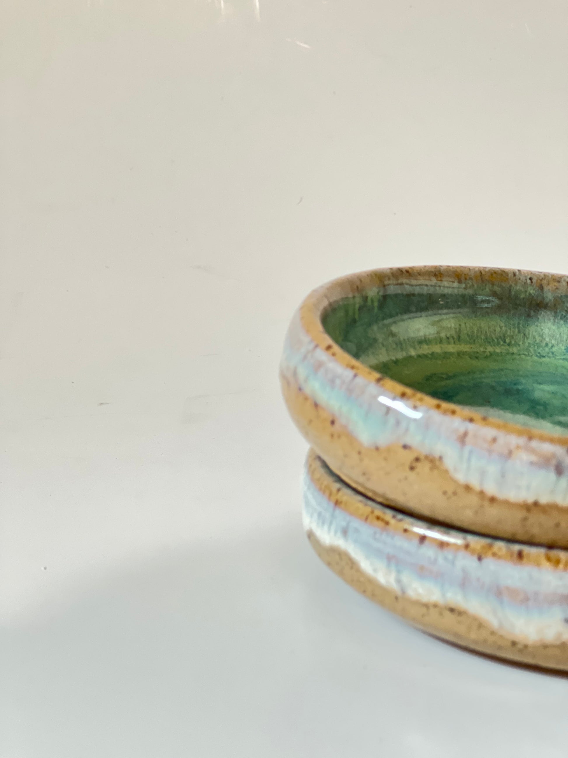 These little beach themed dish are made of speckled brown clay . Thrown on the wheel ,trimmed and then fired to a higher temperature. It has multiple glazes layered on it. It can be used a snack plate as well . All of the pots are food safe, microwave safe and dishwasher safe . Although handwashing is recommended to make it last long.