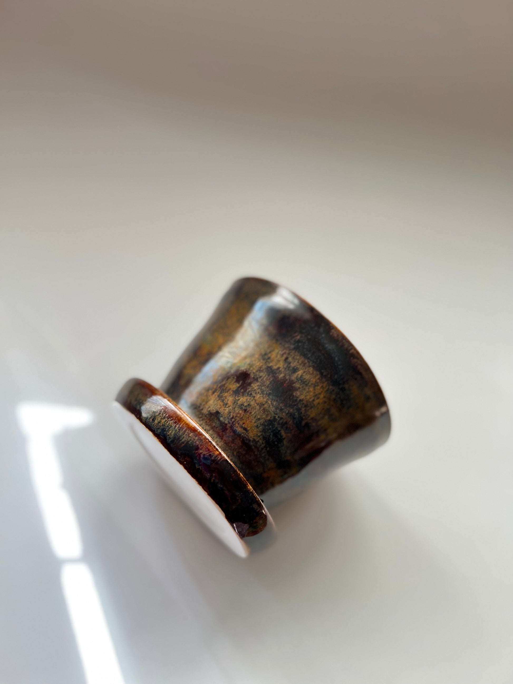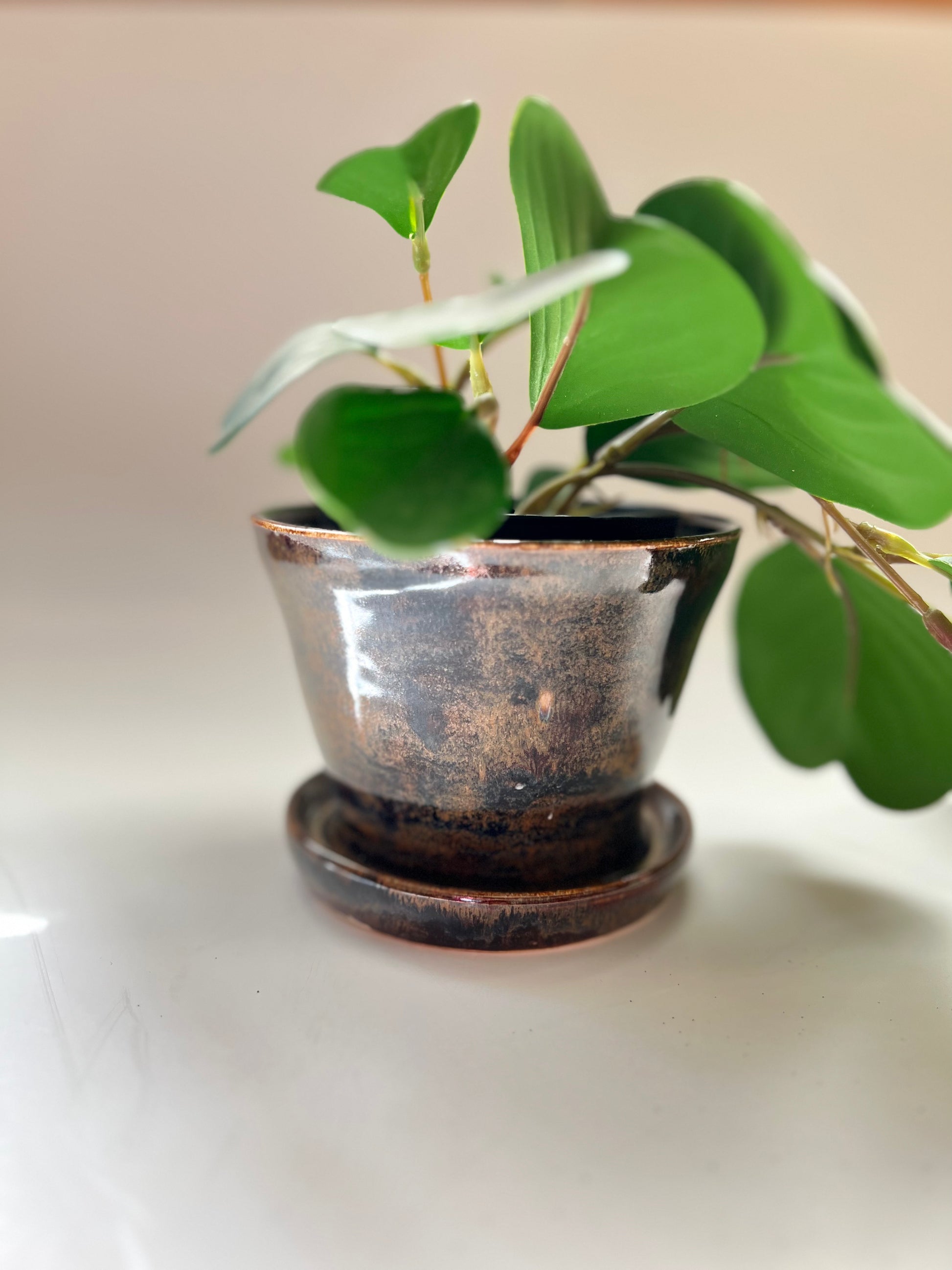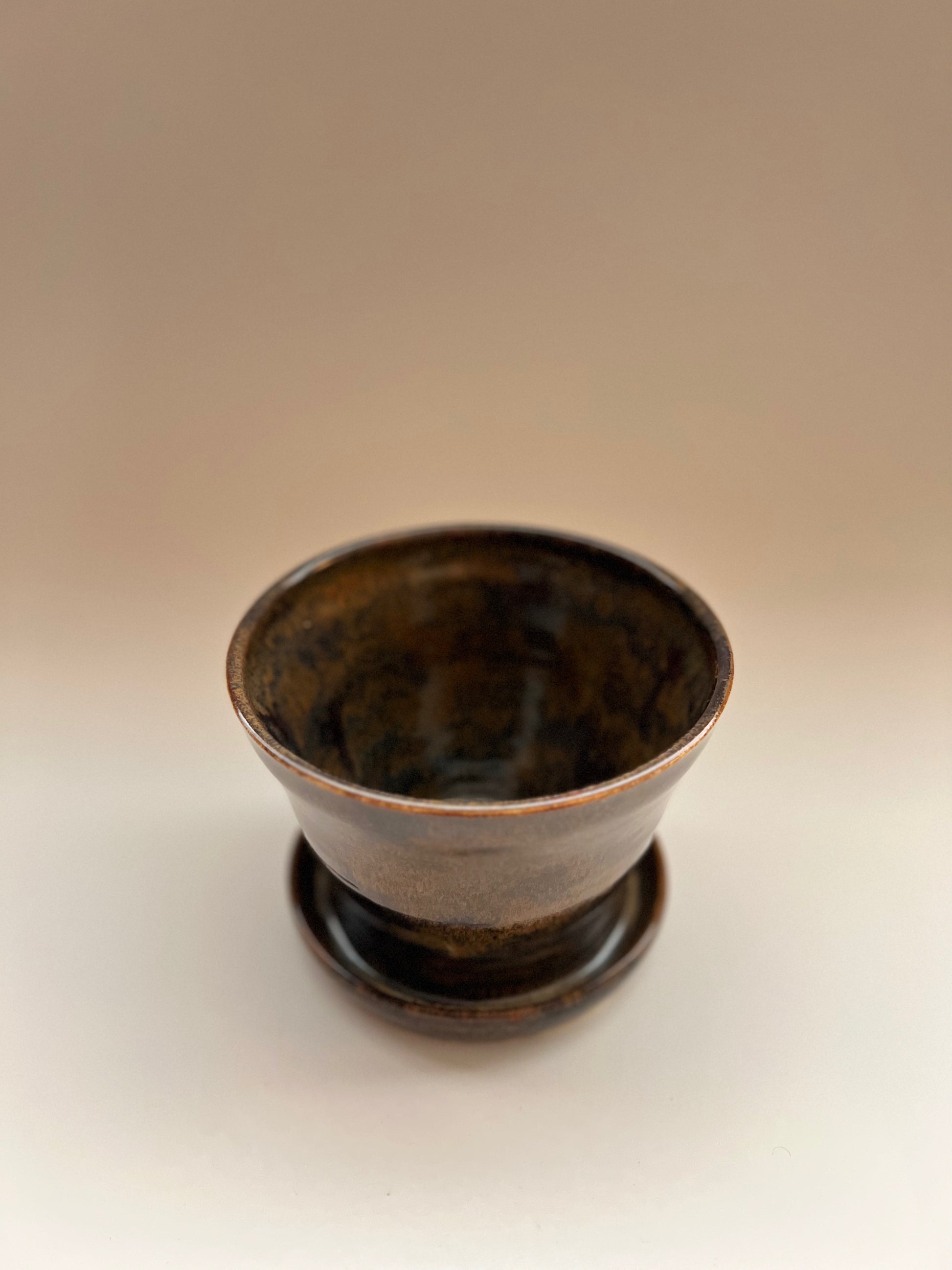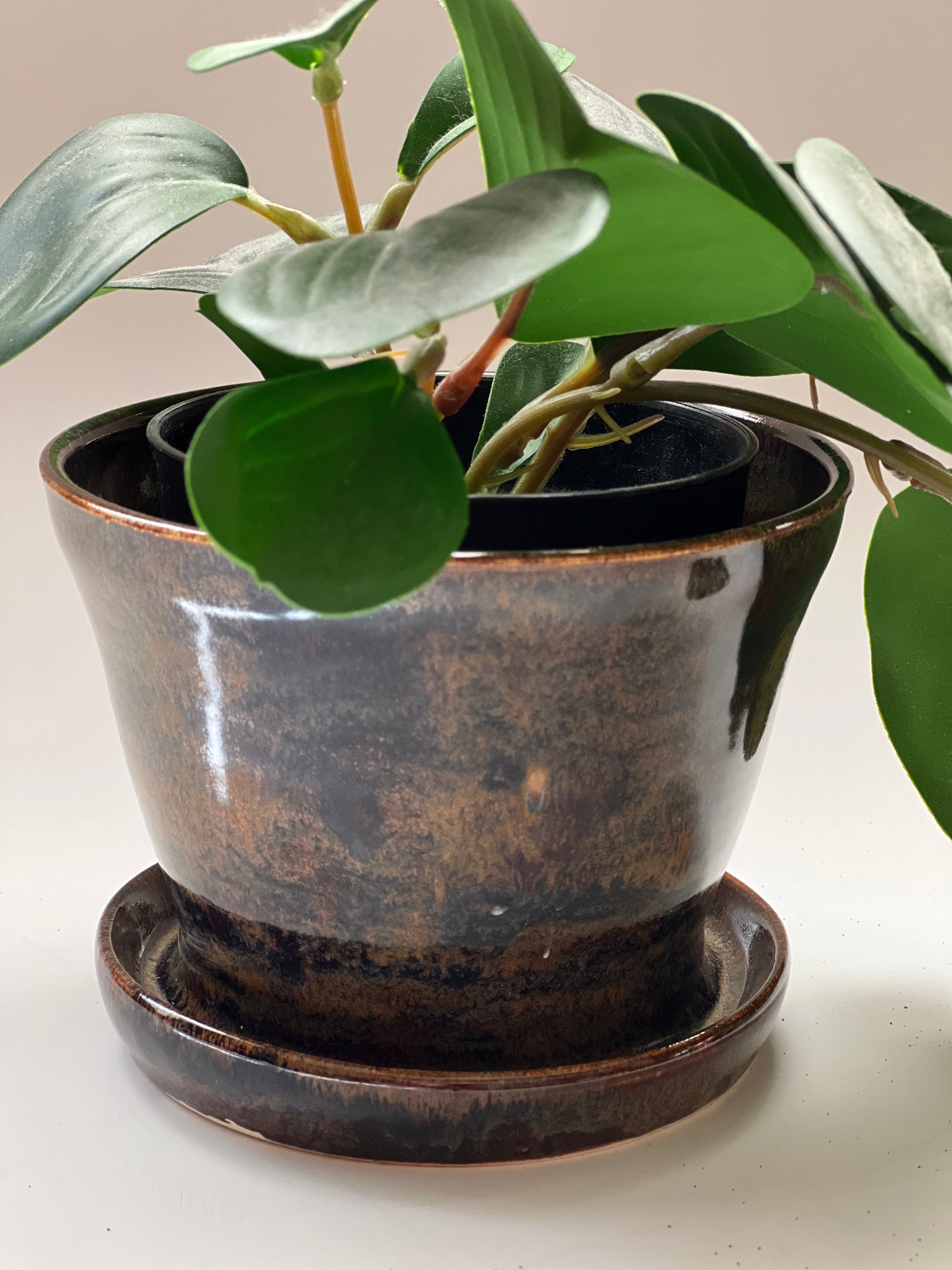 This planter is made of white stoneware. This pot is wheel-thrown and trimmed . This is a one piece planter which has a drip plate plate along with it. It has been glazed with single rich brown glaze inside and out and fired at a higher temperature.