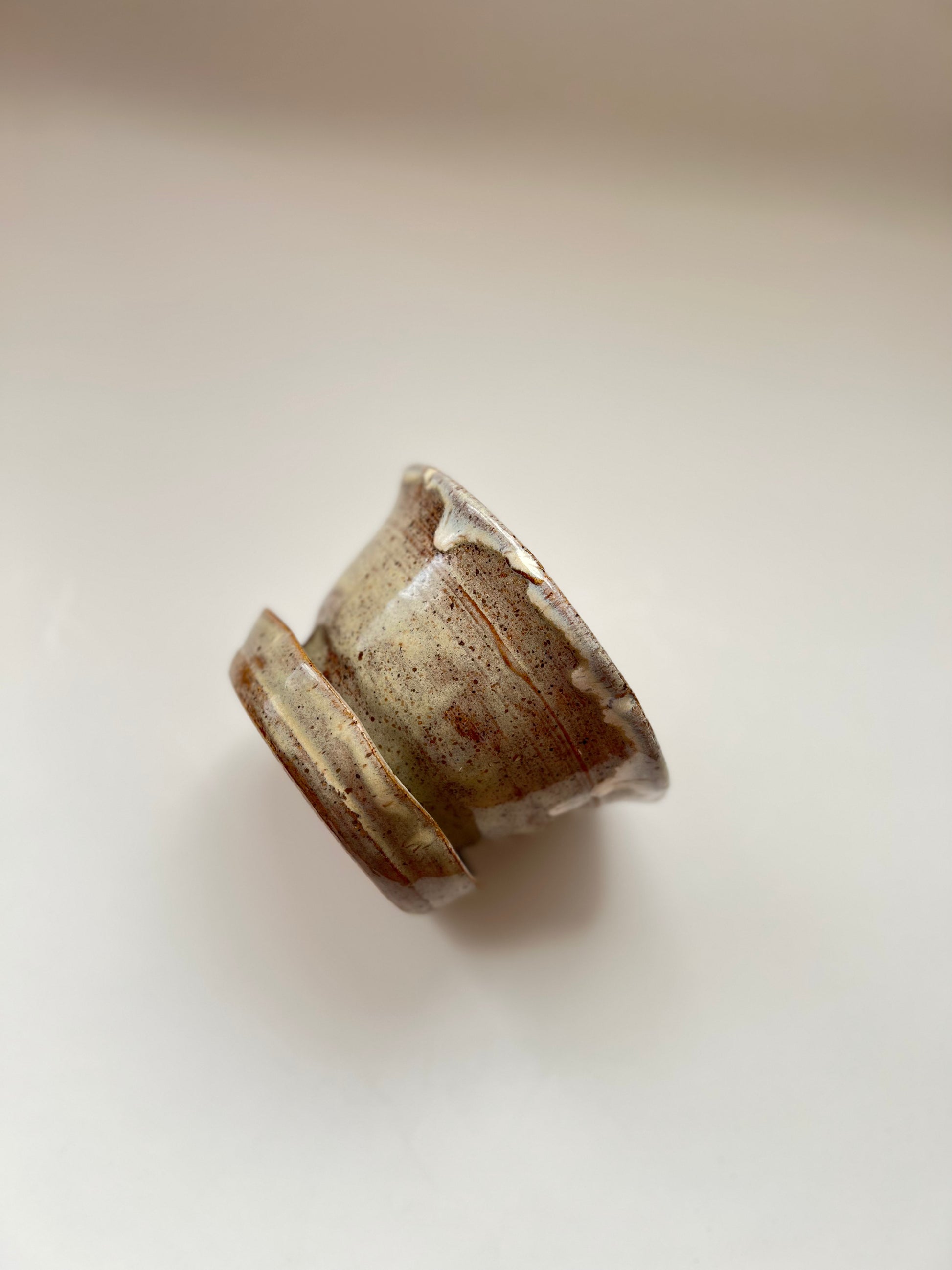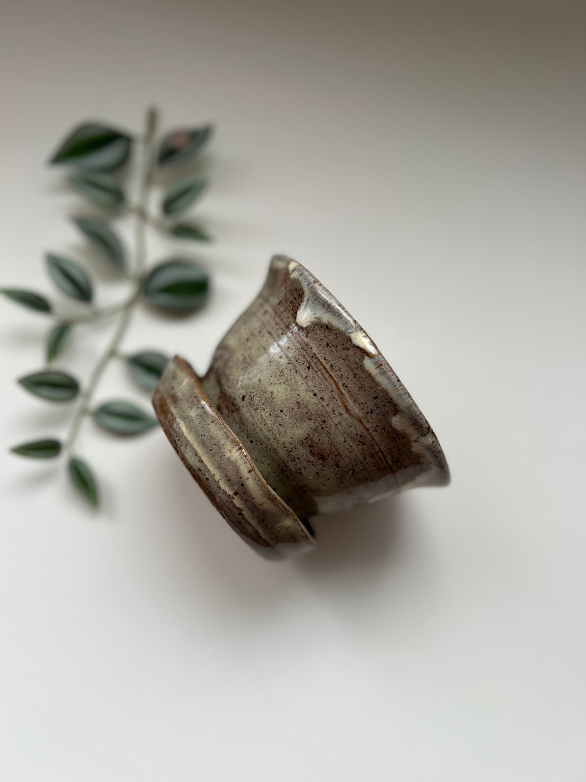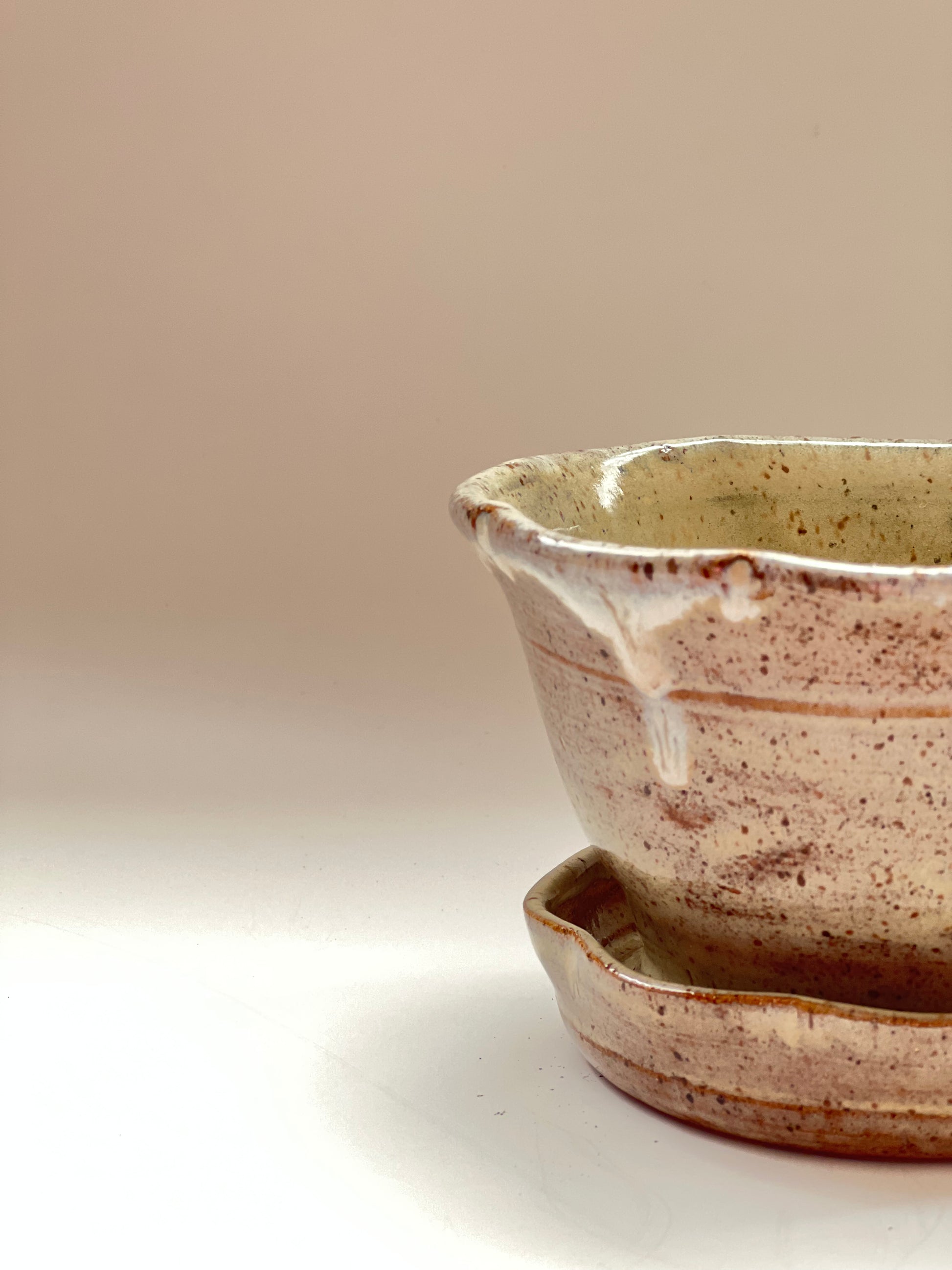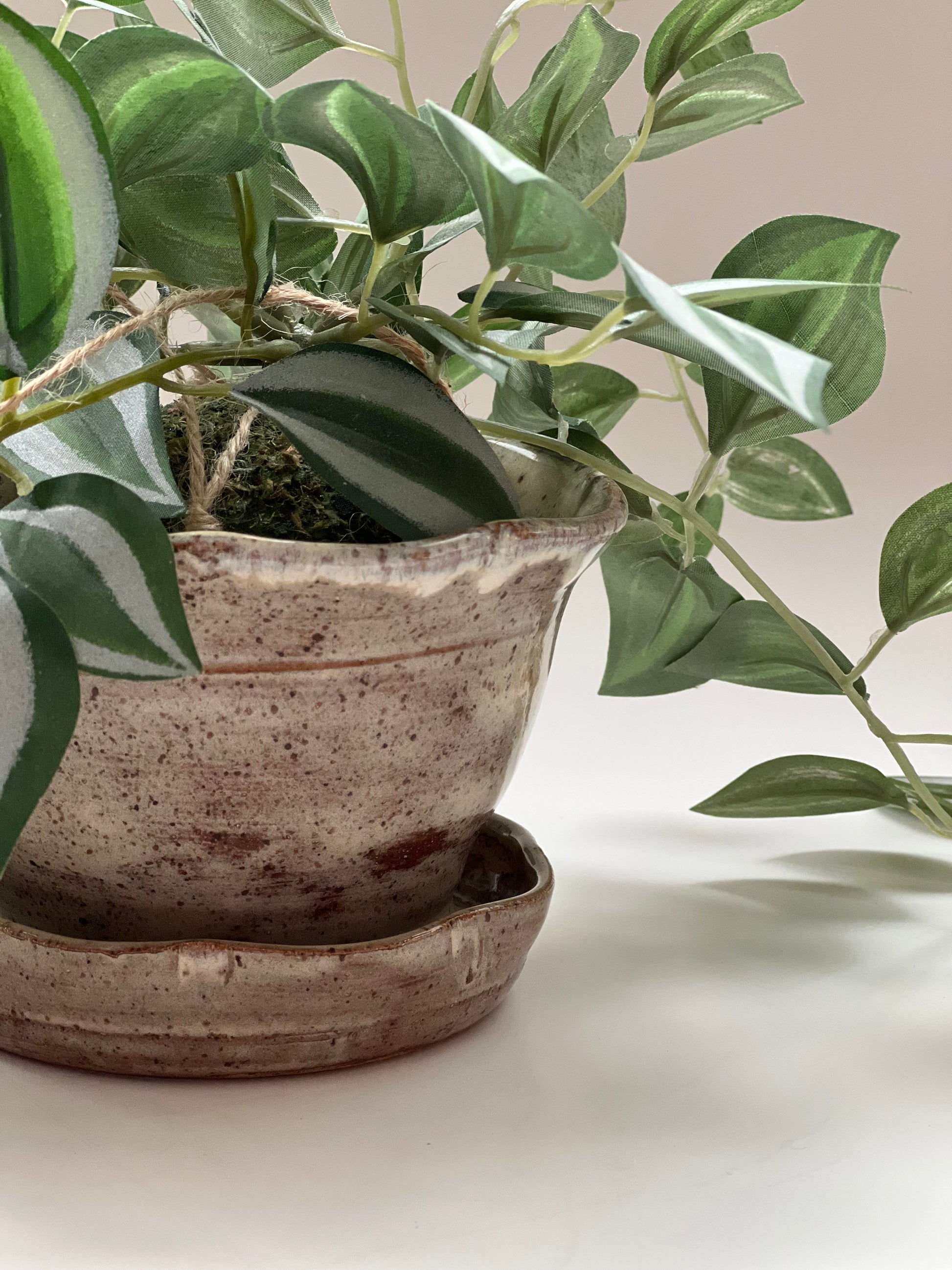 This planter is made of speckled clay .This pot is wheel-thrown, altered to a flower shape, trimmed . This is a one piece planter which has a drip plate plate along with it. It has been glazed with two glazes inside and out and fired at a higher temperature.