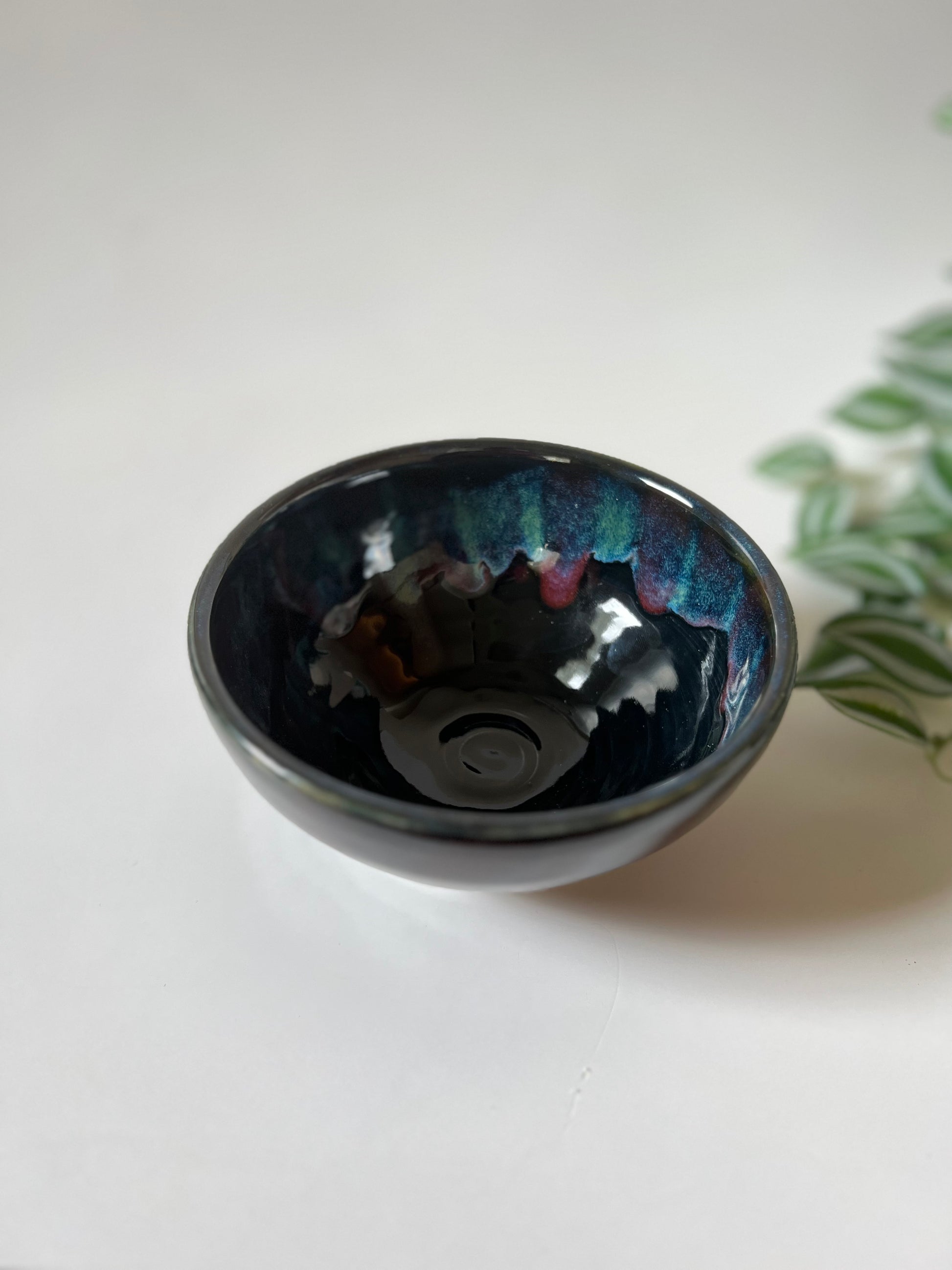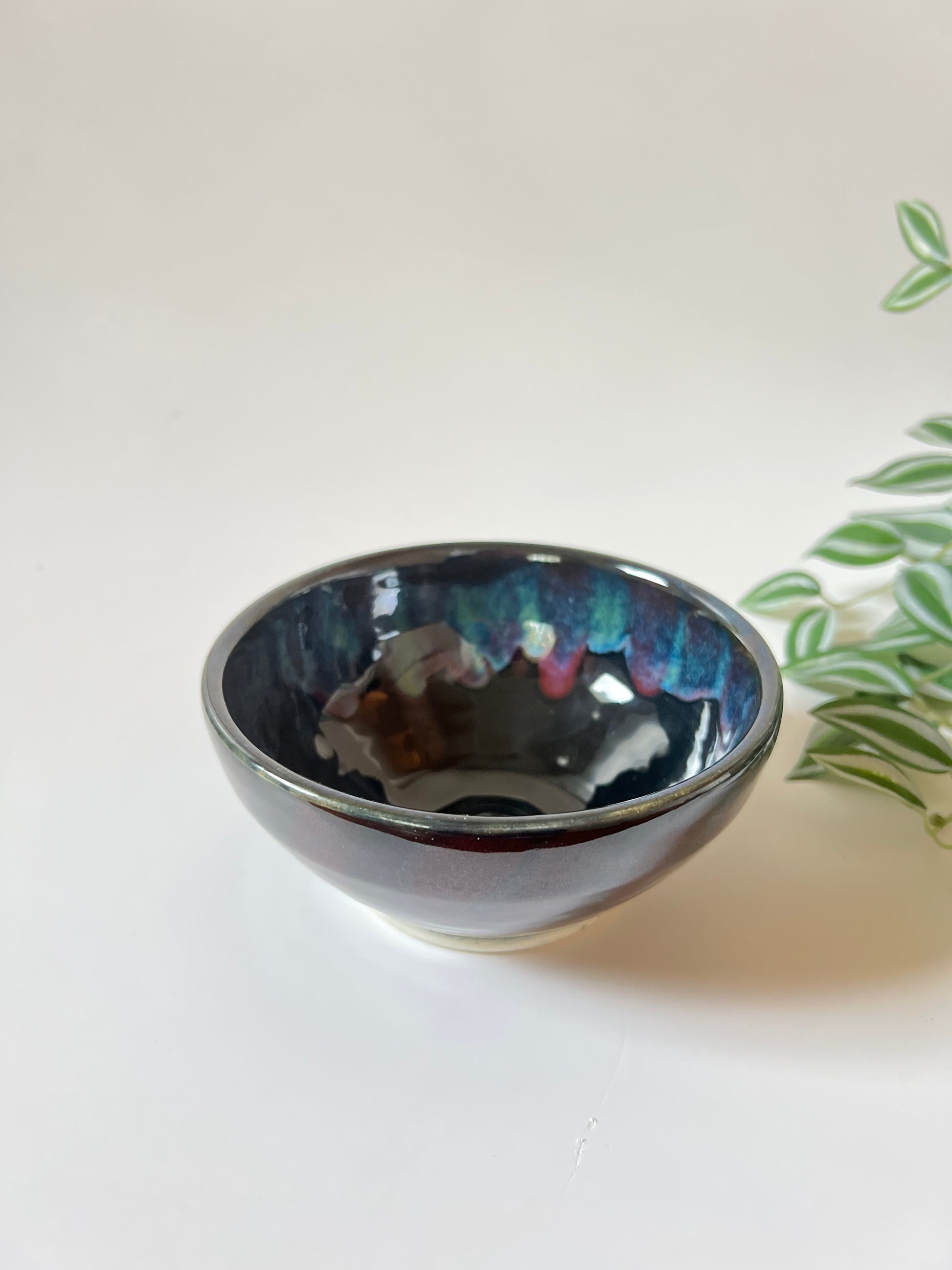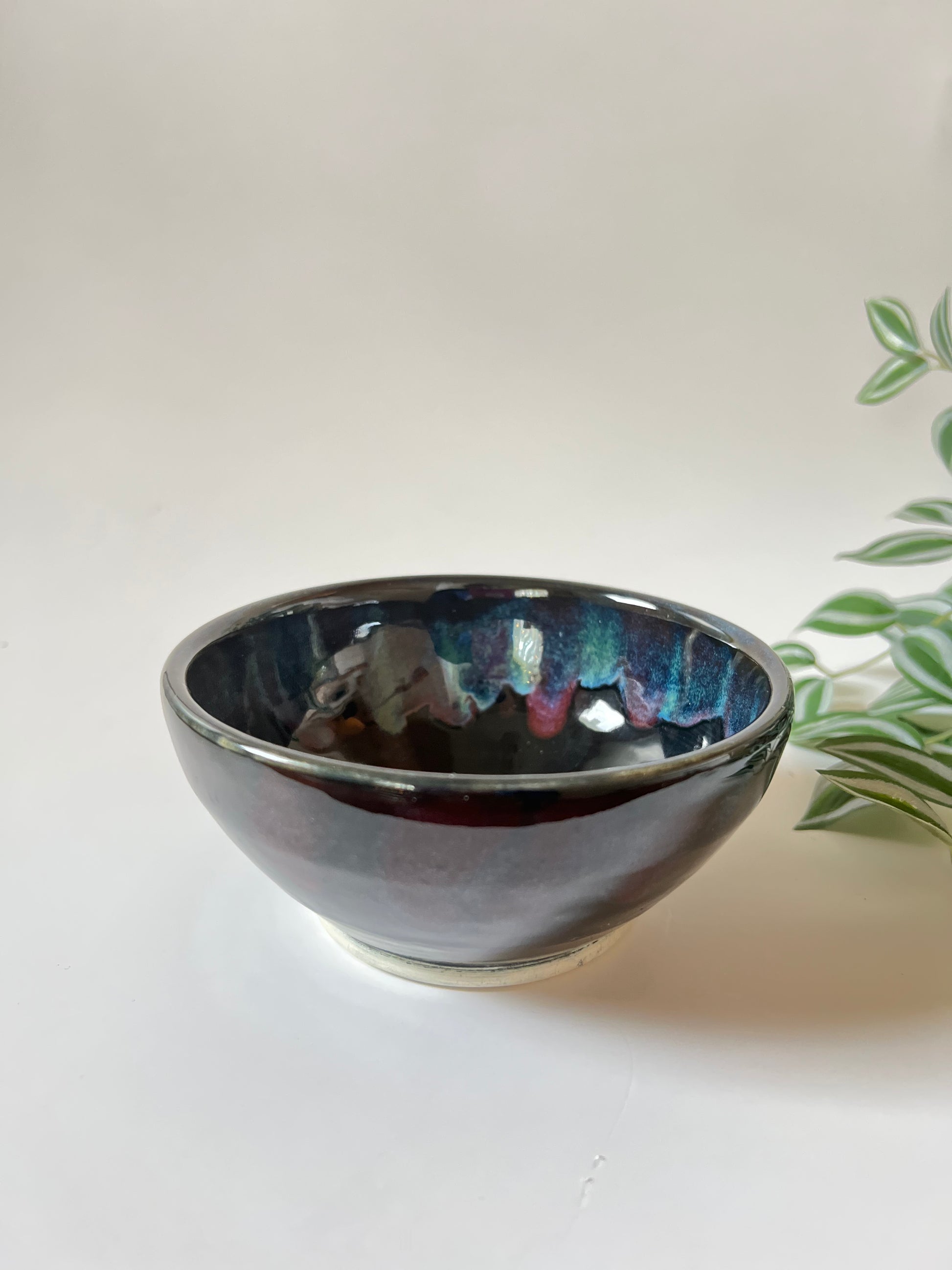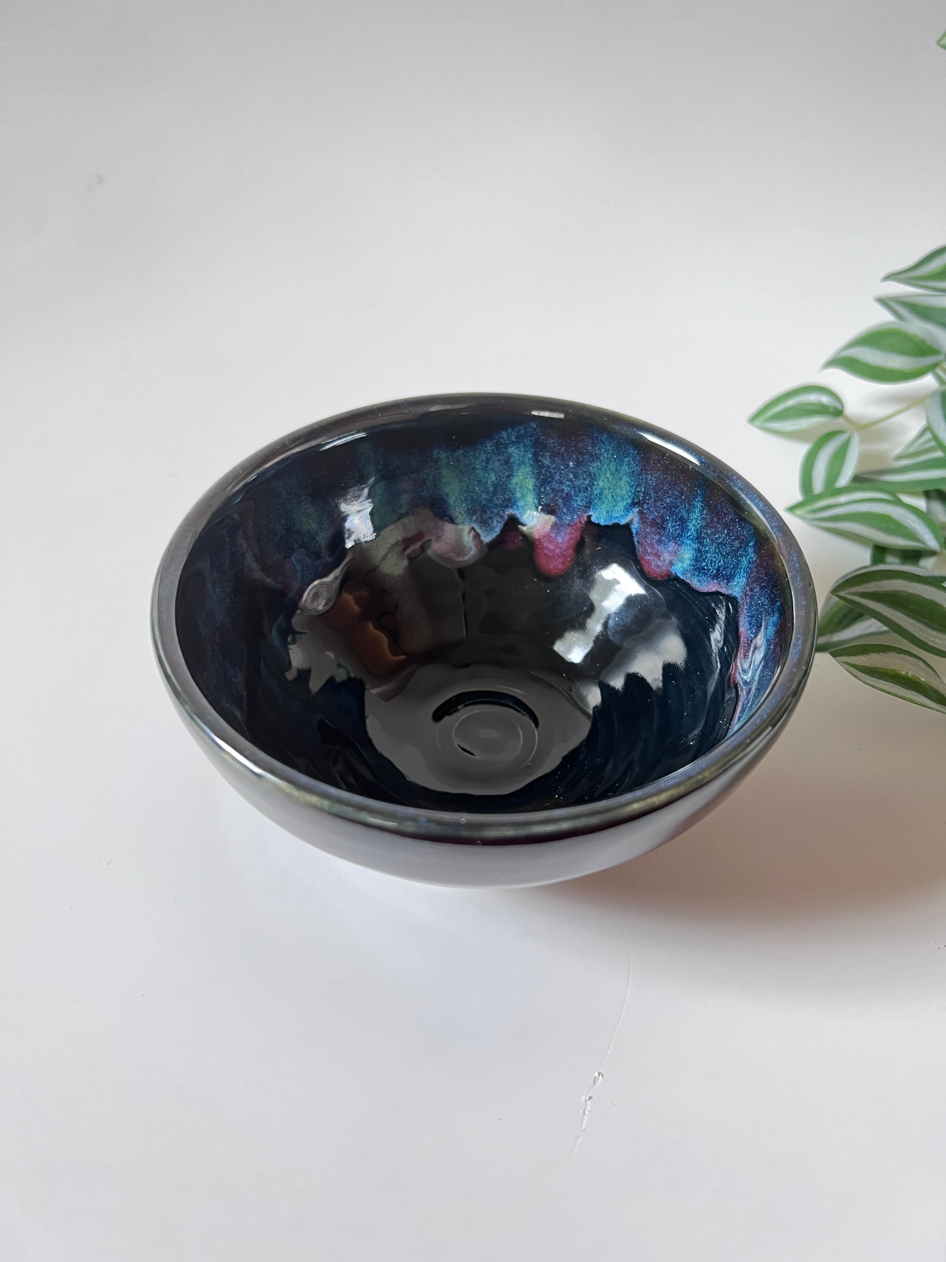 This bowl is made of white stoneware clay. It is thrown and trimmed on the wheel. it is glazed with multiple brush on glazes layered on to get the galaxy effect. All of the pots are food safe, microwave safe and dishwasher safe. Although handwashing is recommended to make it last long.
