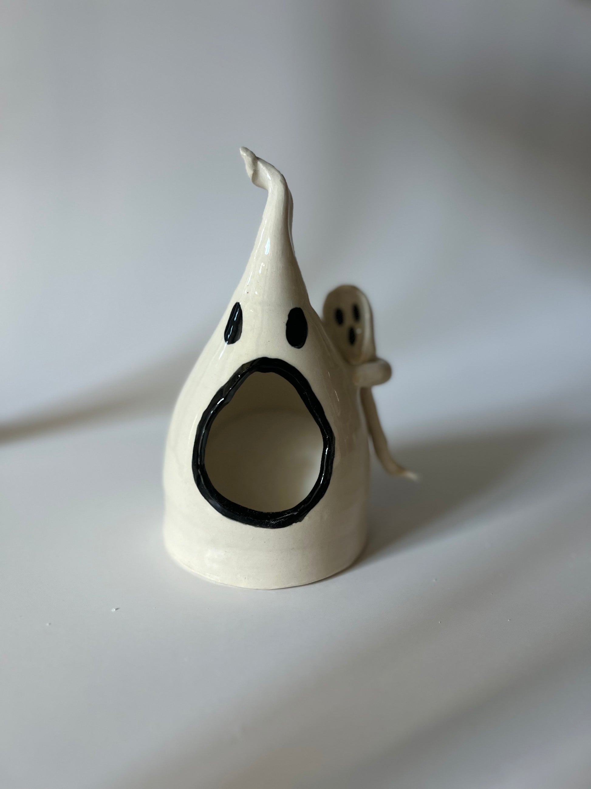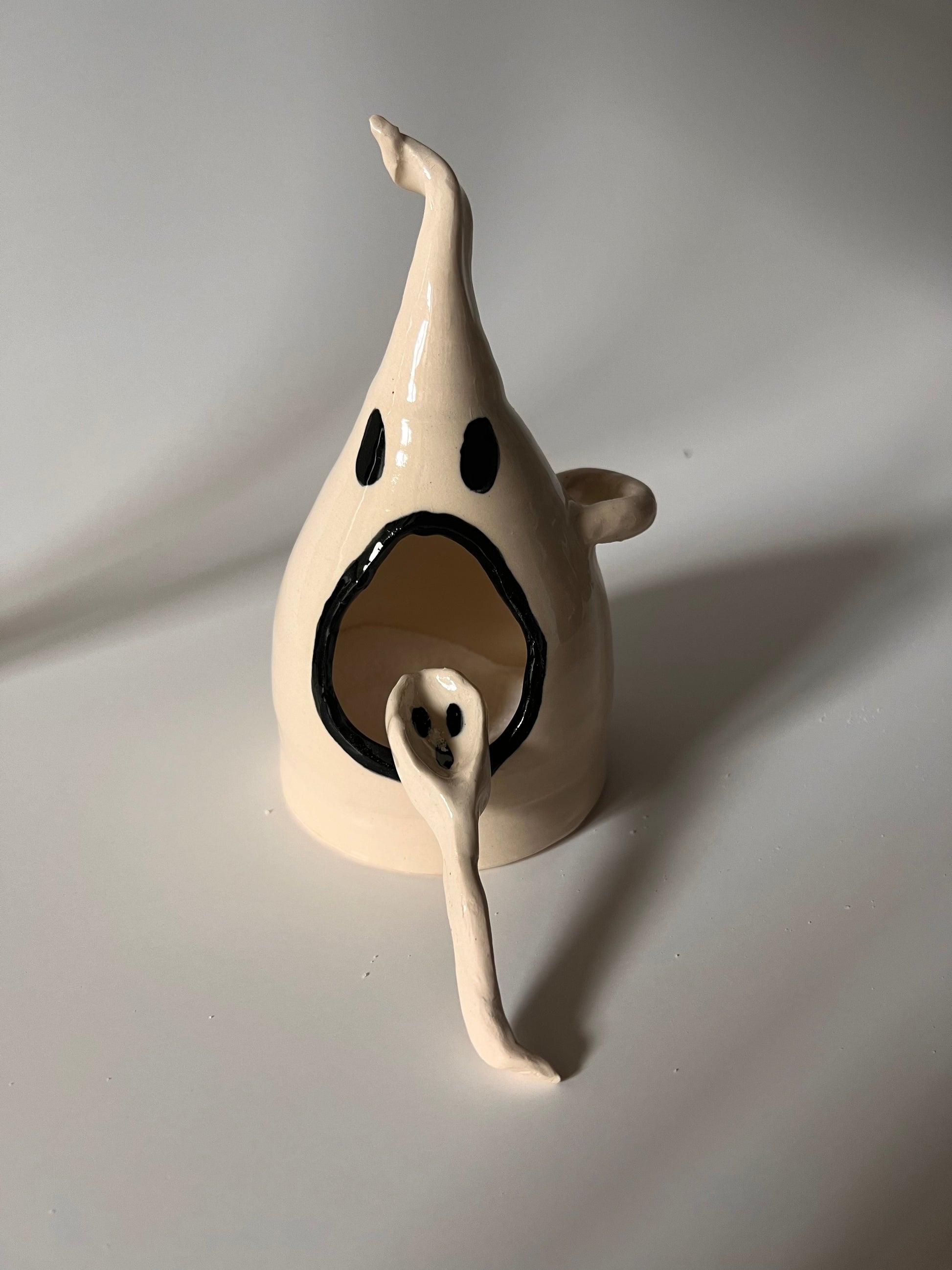 The ghost salt / sugar holder is made from porcelain clay body and comes with a holder and spoon on the side. IT is thrown and trimmed on the wheel and fired at Cone 6 with clear glaze