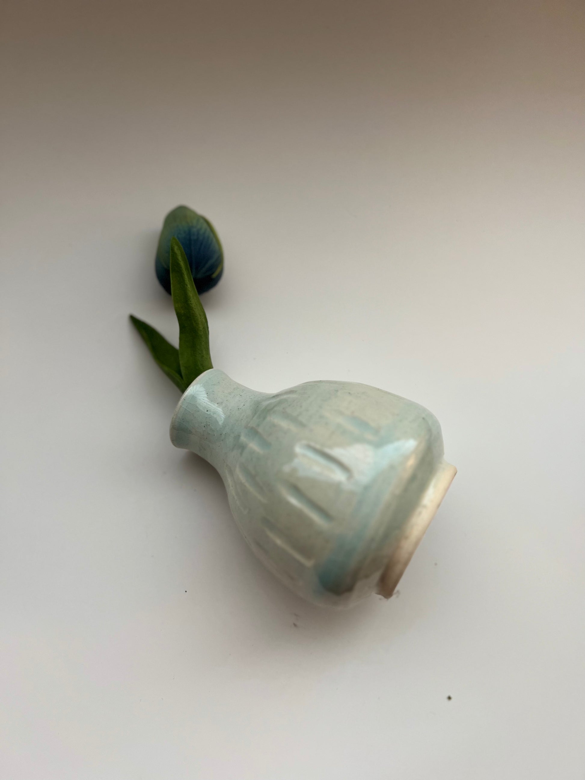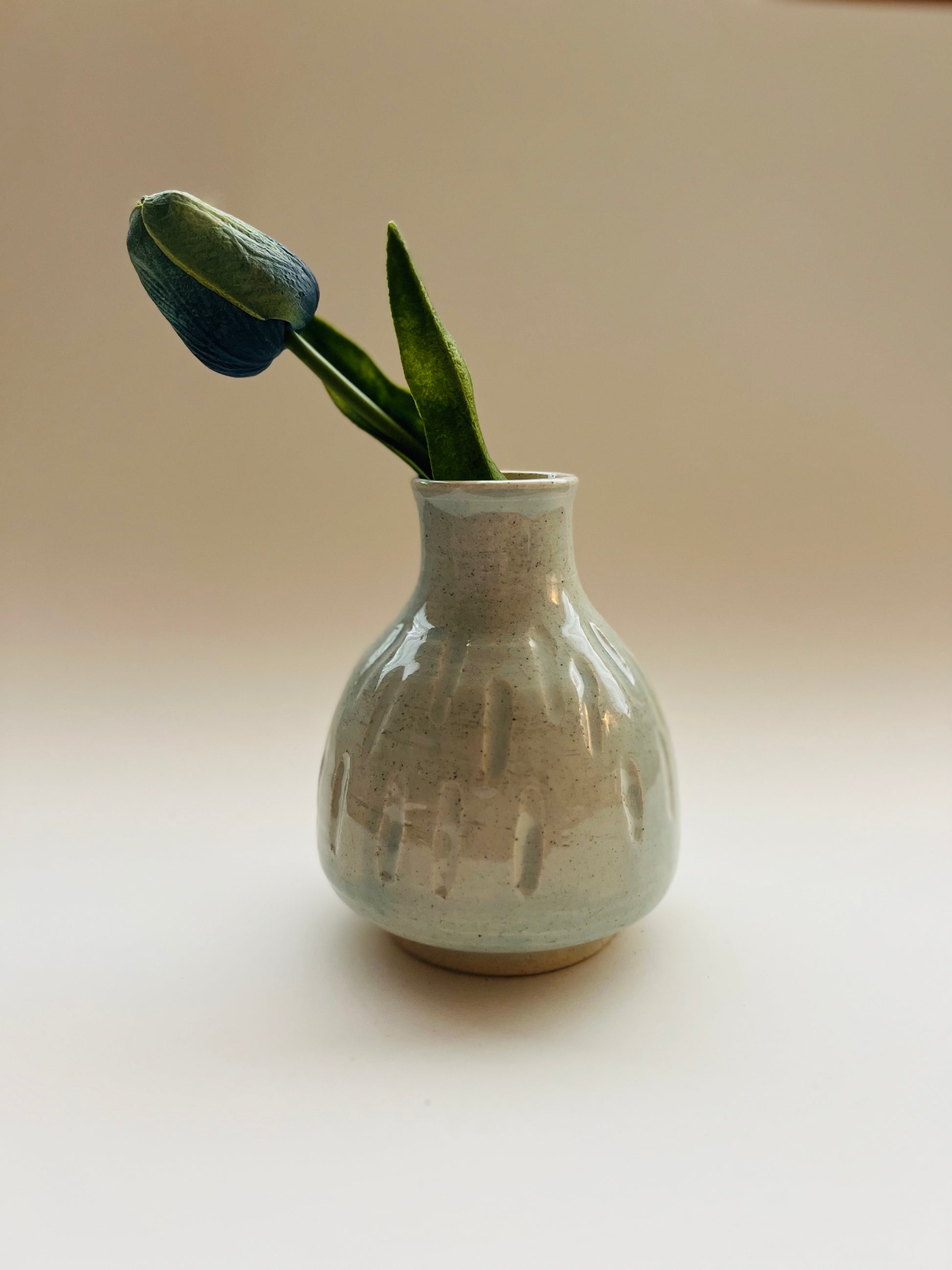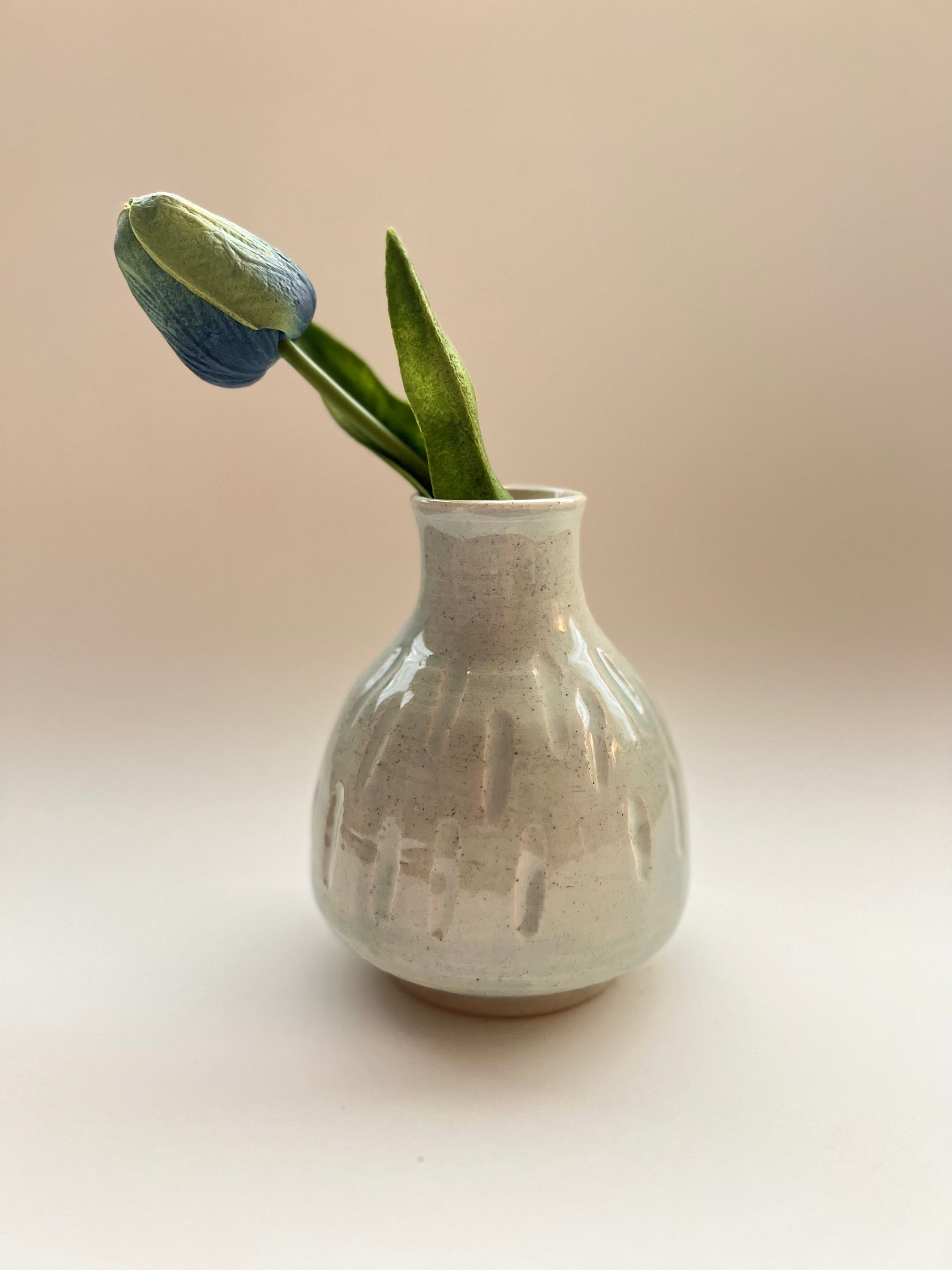 This cute bud vase is made of white stoneware and hand carved. It’s thrown and trimmed on the wheel. Outside is decorated with a subtle color . Inside is glazed with a liner glaze and fired to a higher temperature which makes it waterproof and functional.