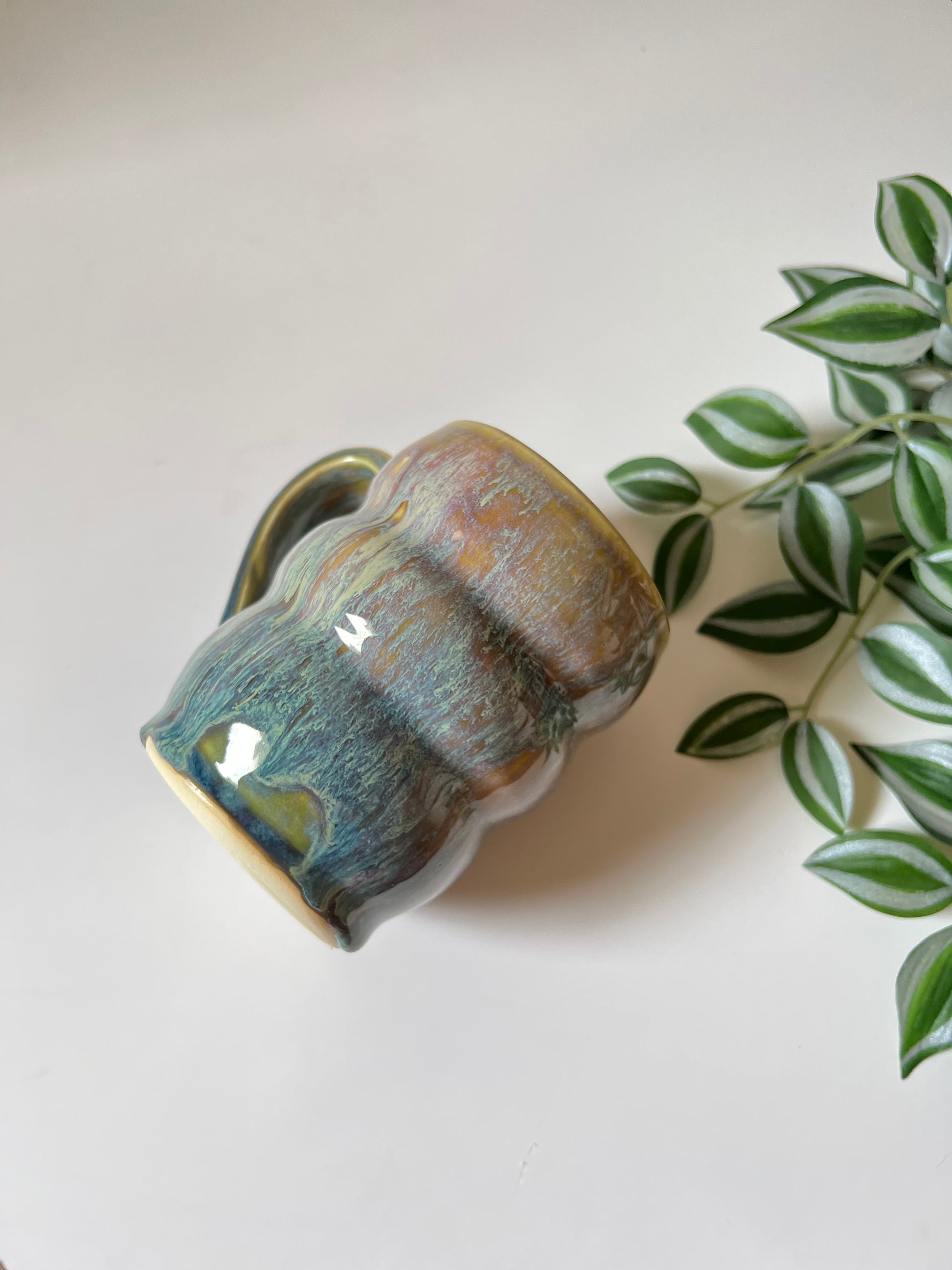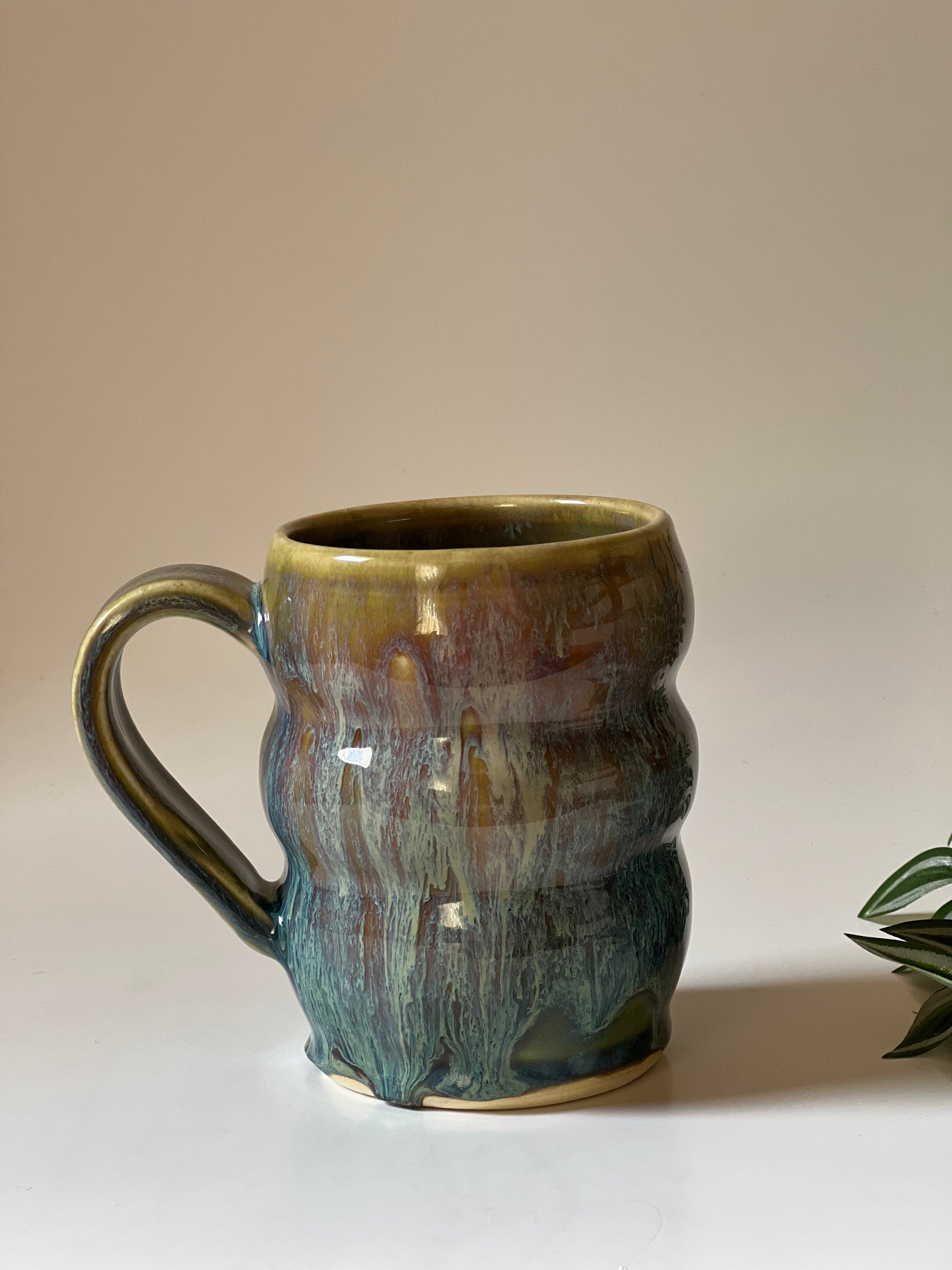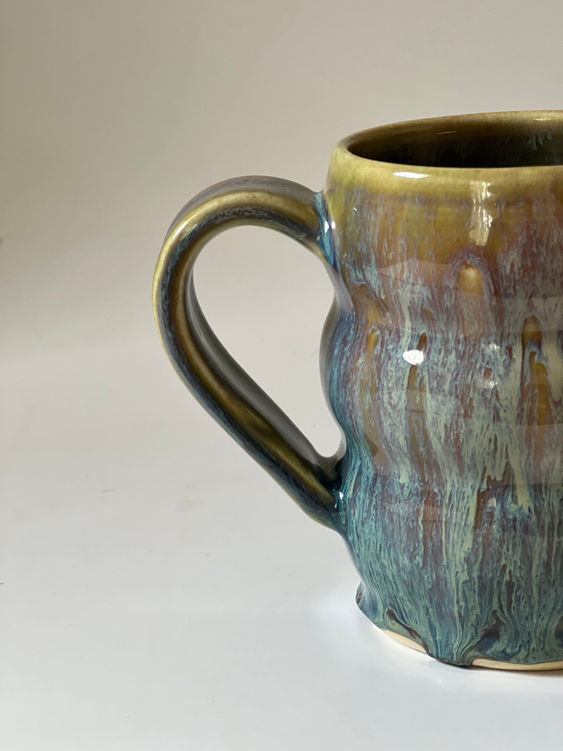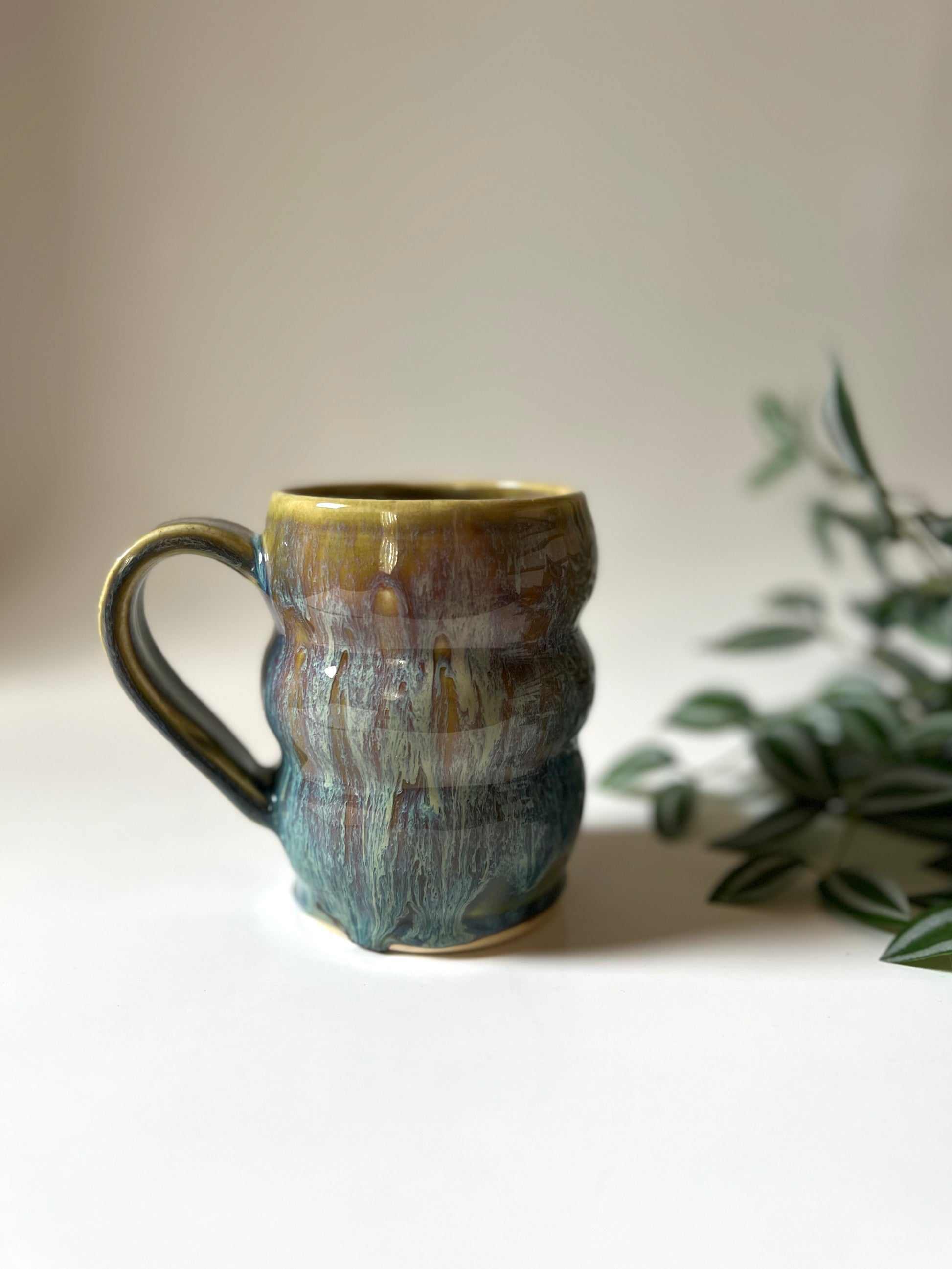 This bubble mug is made of white stoneware. It is thrown and trimmed on the wheel. The color used are inspired from nature .Glazed with multiple layers of brush on glazes in and out and fired to a higher temperature. All of the pots are food safe, microwave safe and dishwasher safe. Although handwashing is recommended to make it last long.