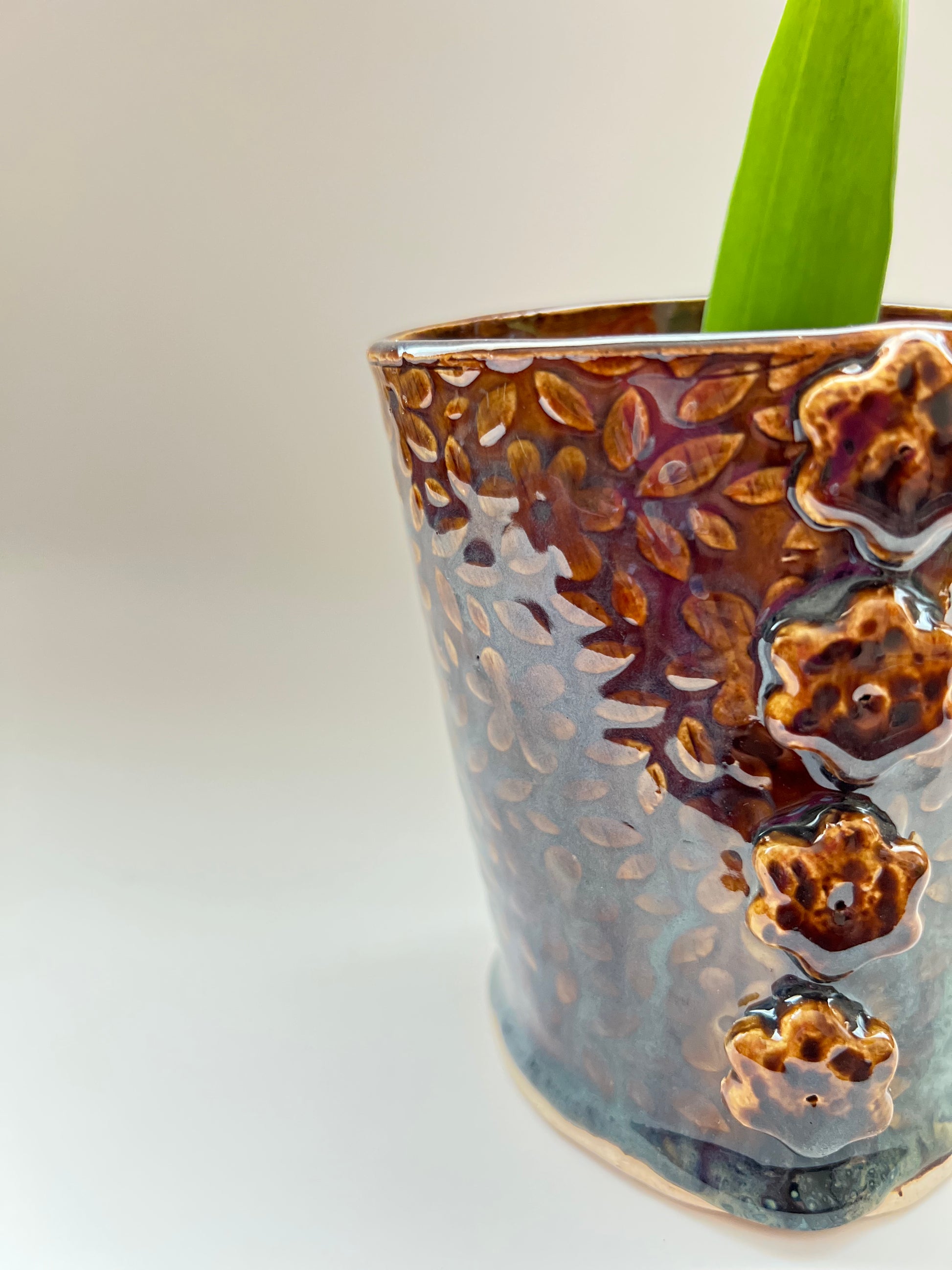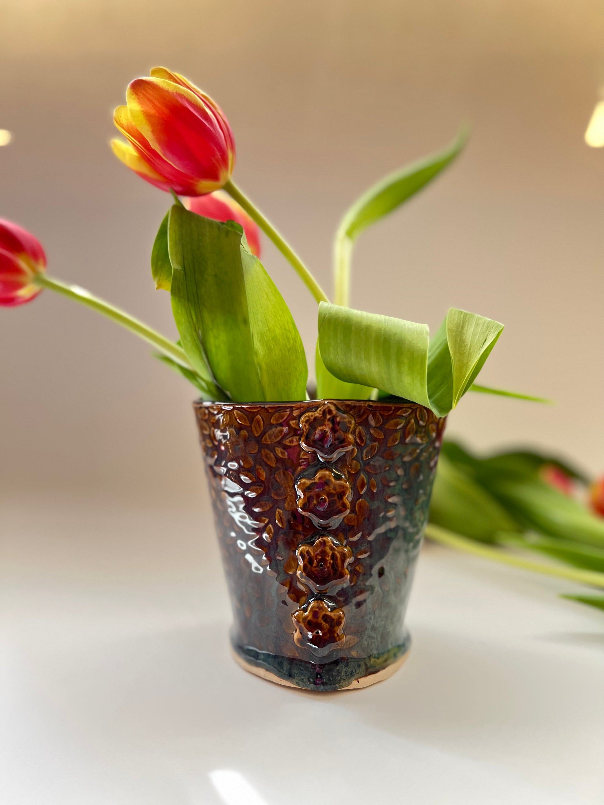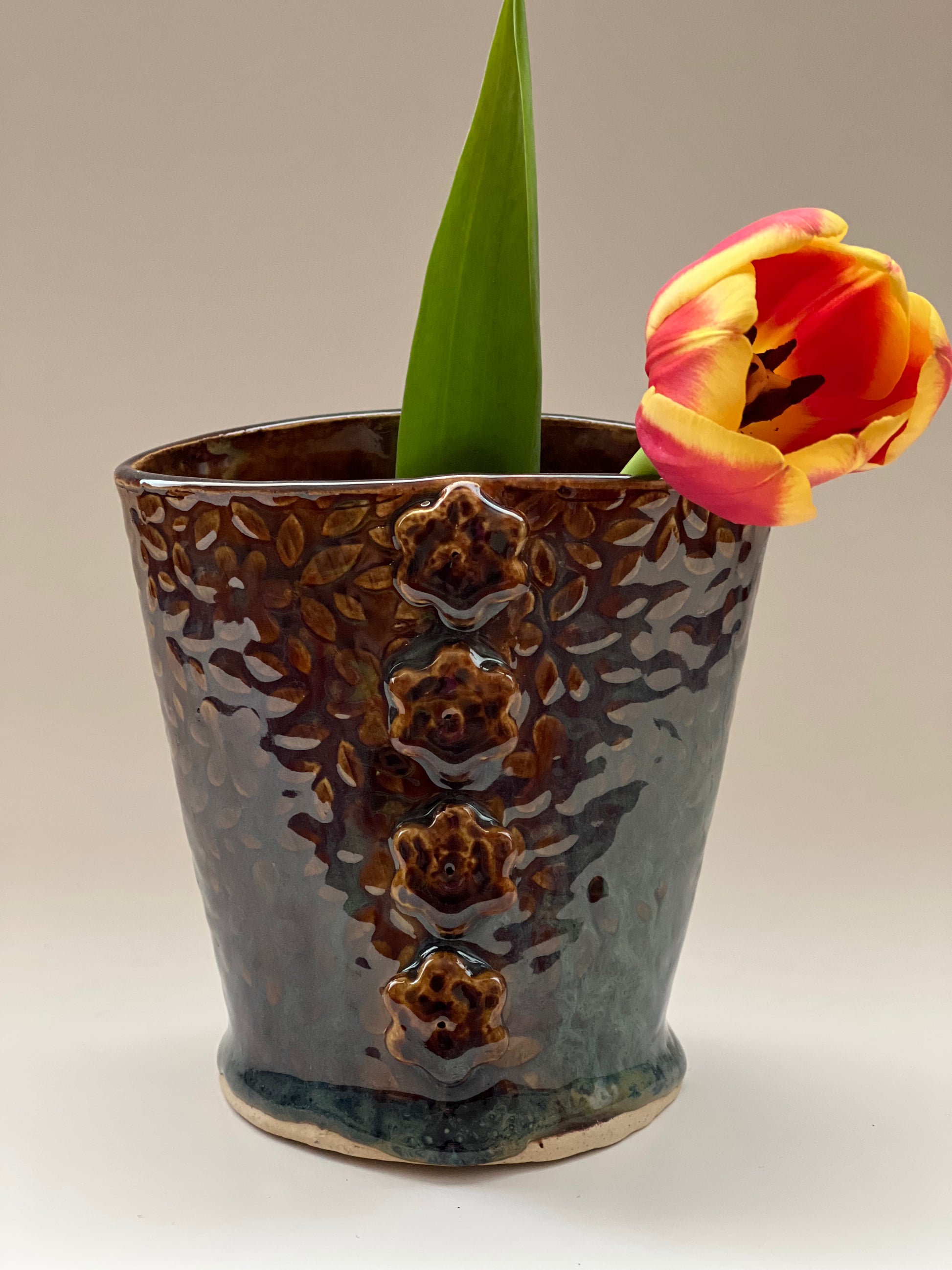 This beautiful spring vase is hand built from a slab of clay. It has unique textures of flowers all around the vase and has three different glazes in and out ,fired at a higher temperature which makes it waterproof and functional.