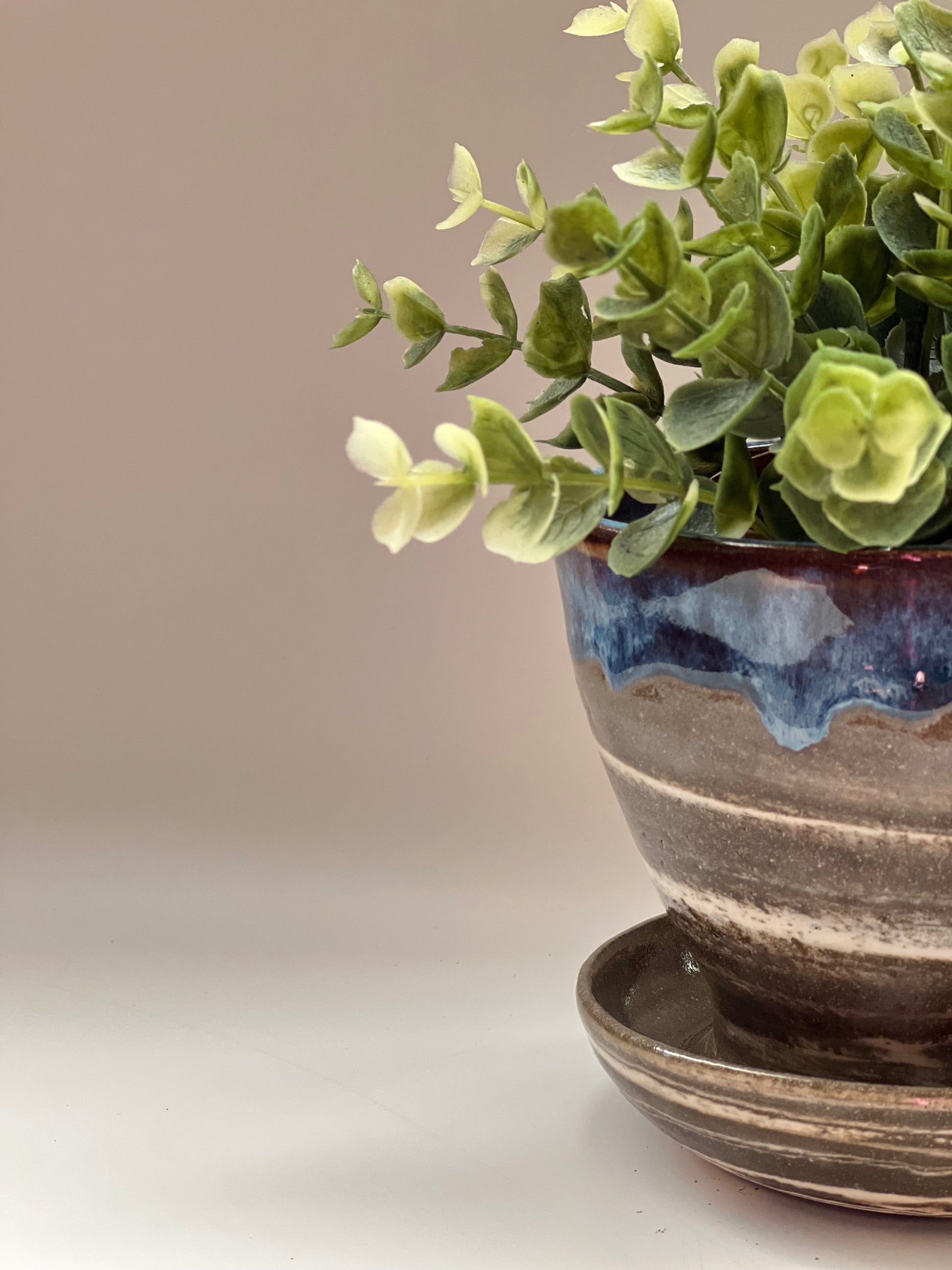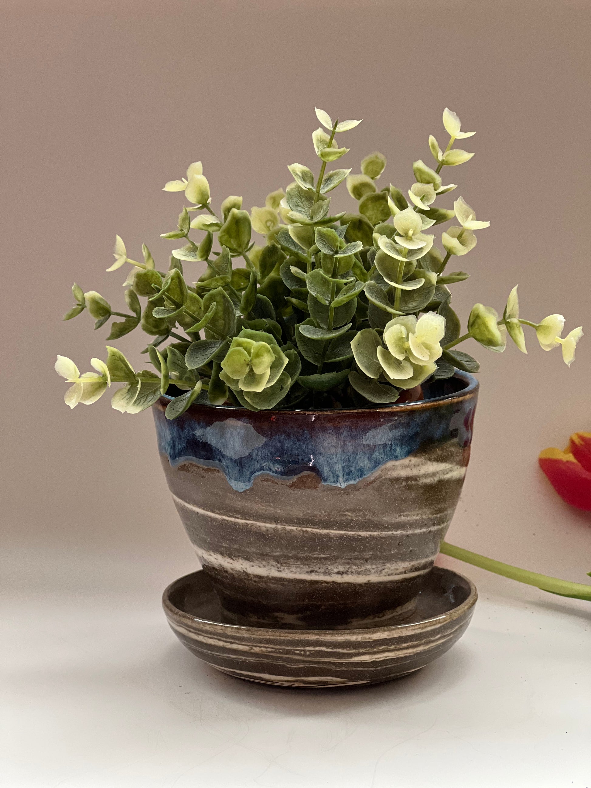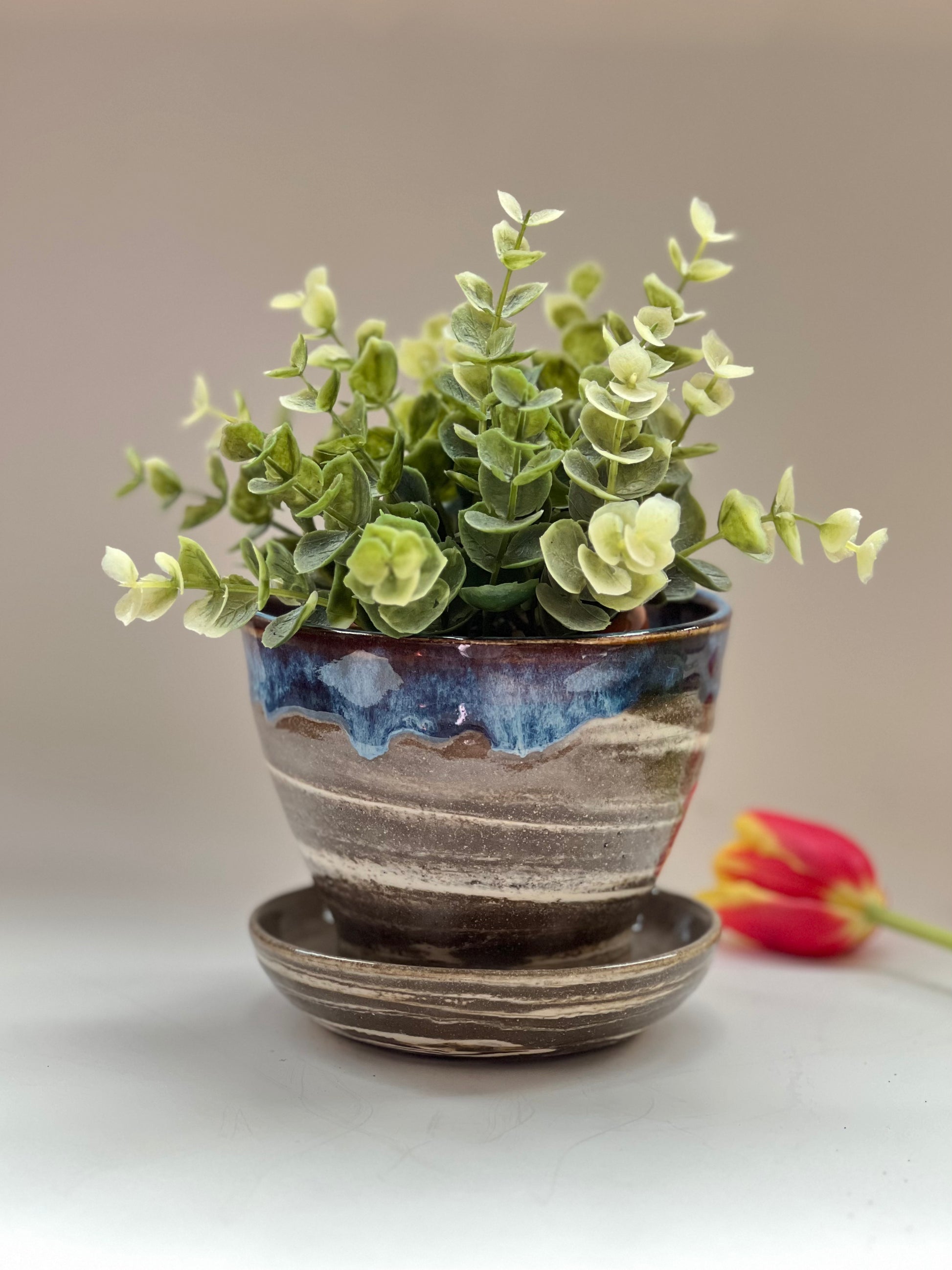 This planter is made of marbled clay ( Dark and white clay mixed together) . It is a one piece planter which has a drip plate attached to it. The inside is fully glazed and the outside is half glazed for the marbled clay body to be seen.