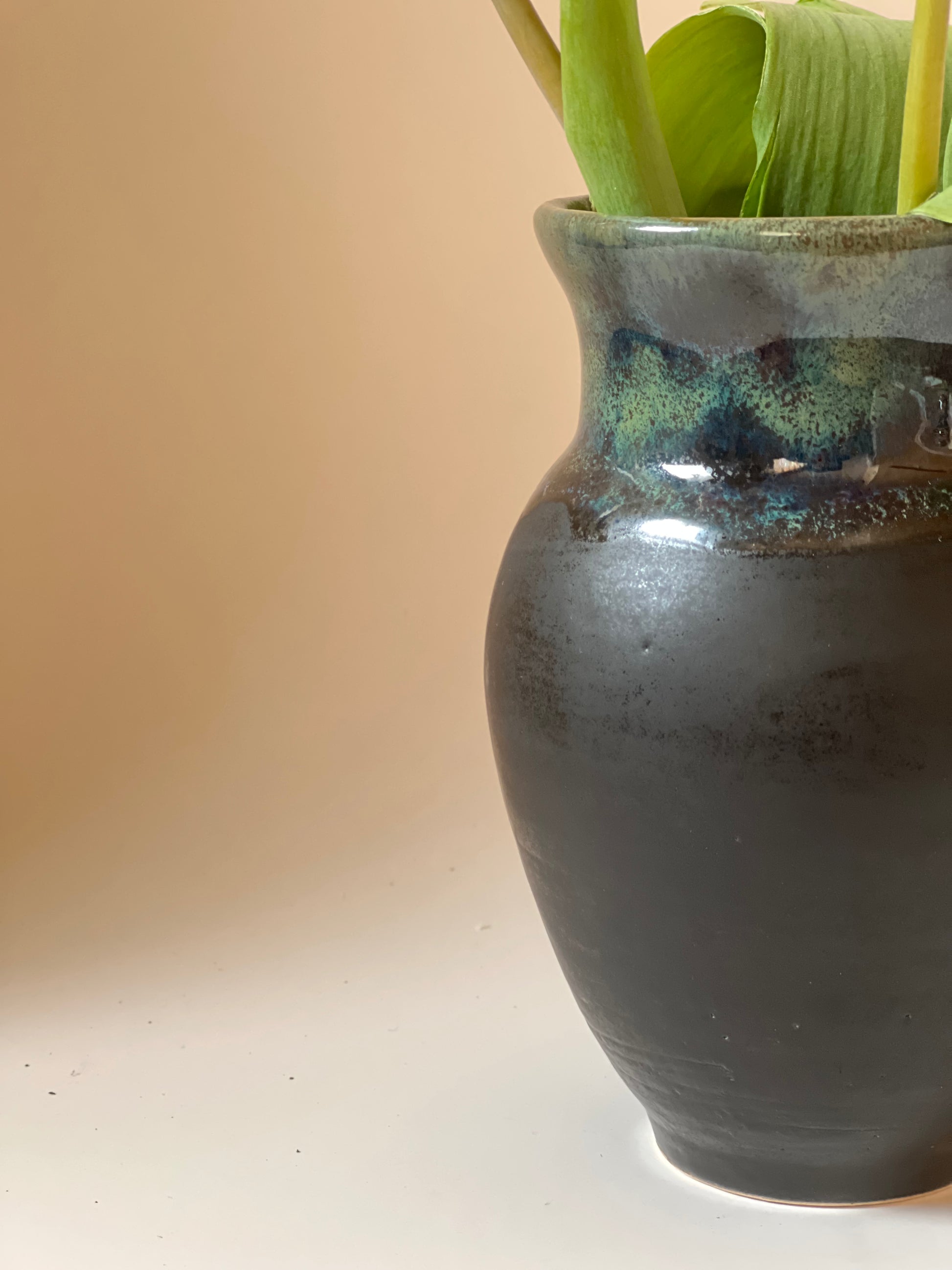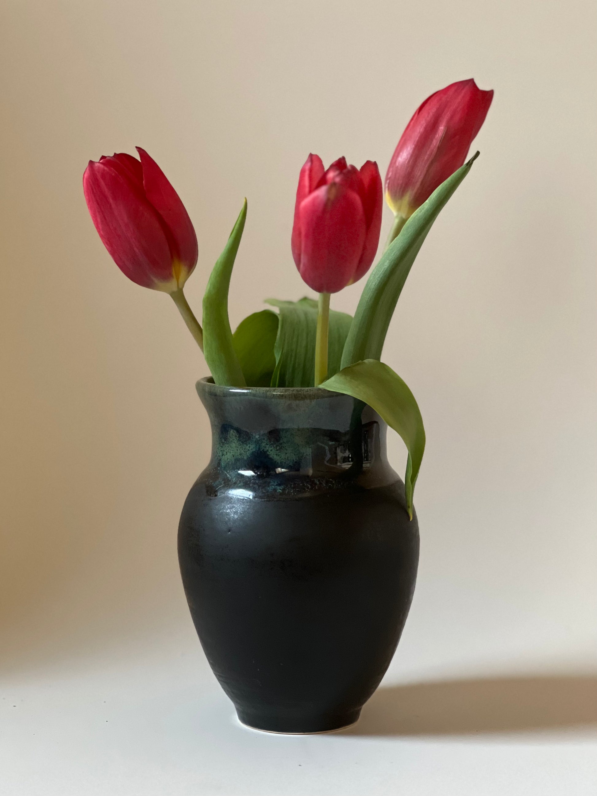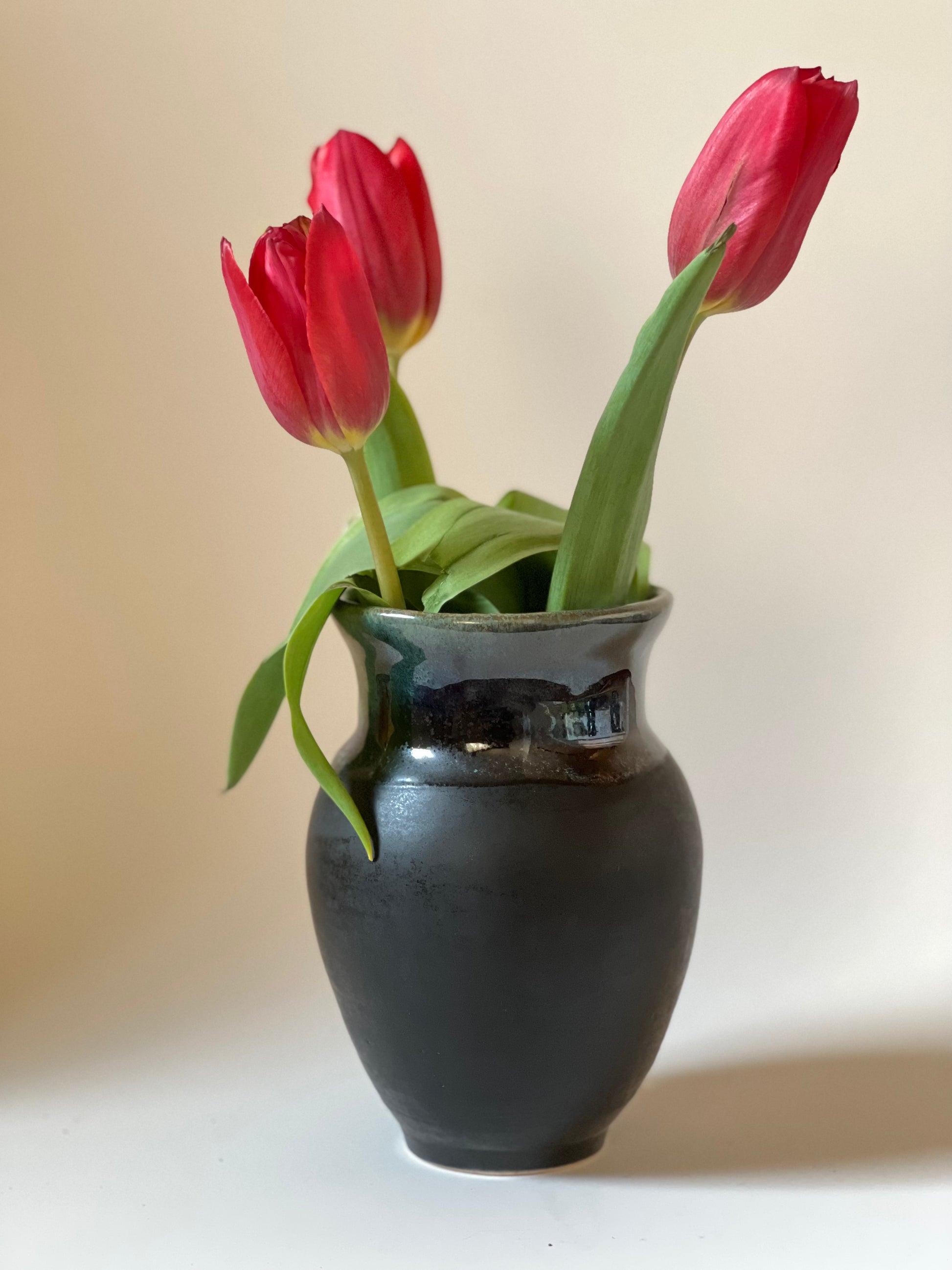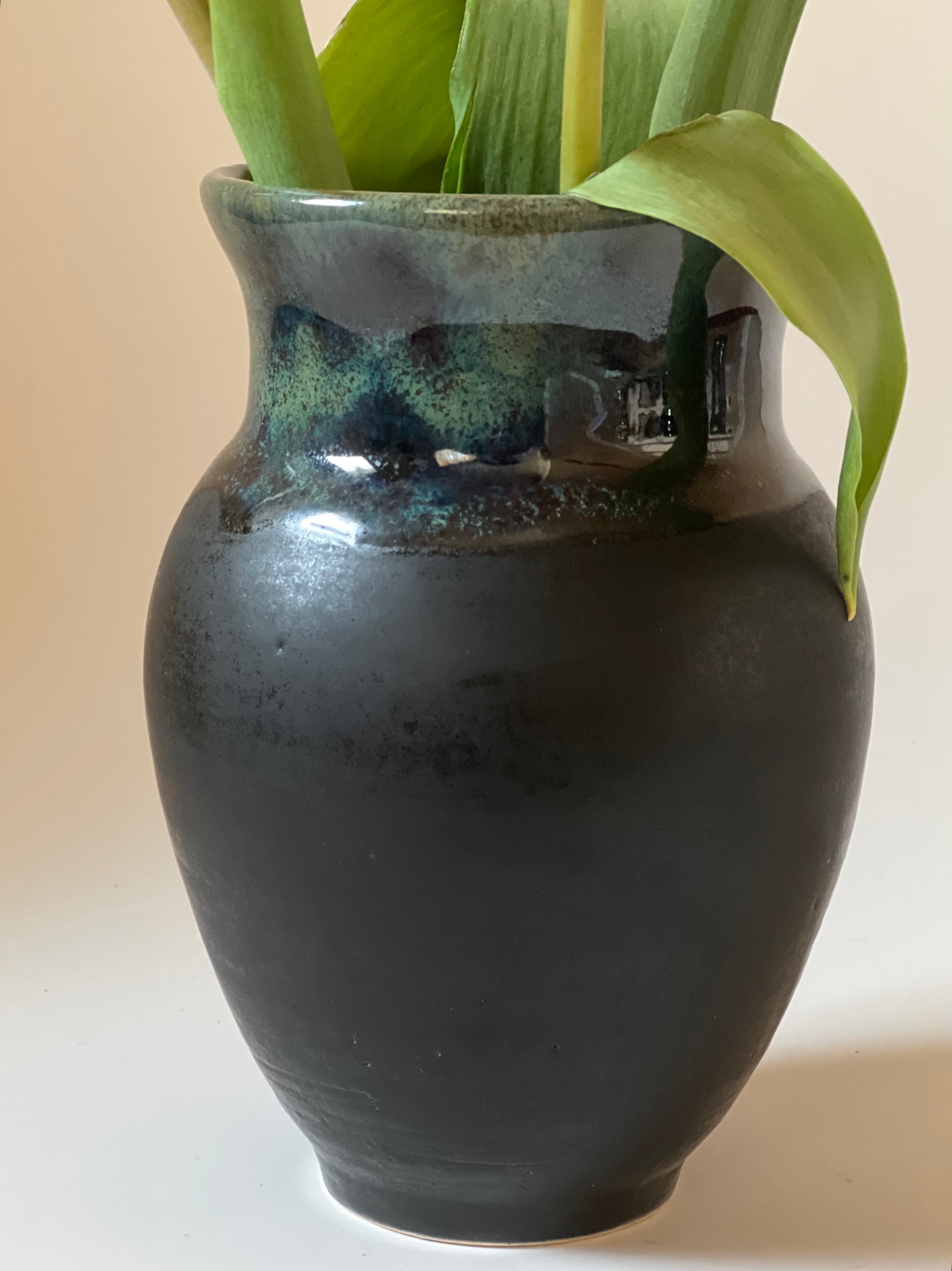 This classy black vase is made of white stoneware clay. It is layered with multiple glazes on the outside until the neck and matte black glaze is used on the body. Both the inside and outside is glazed which makes it waterproof. It is thrown on the wheel ,trimmed and fired to a higher temperature.