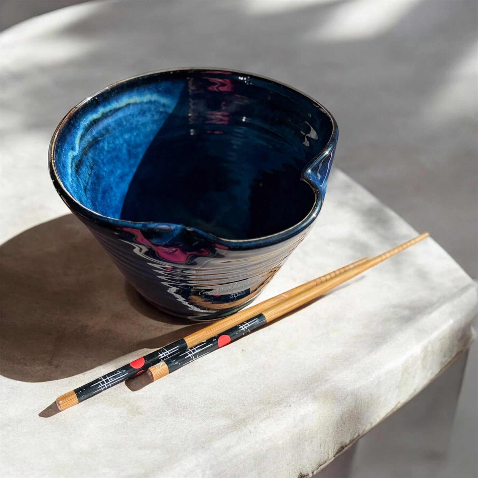 A hand made Ramen Bowl with a twist. Different from the classic bowl for better functionality and easy to use. Great for noodles or any cozy meals.
