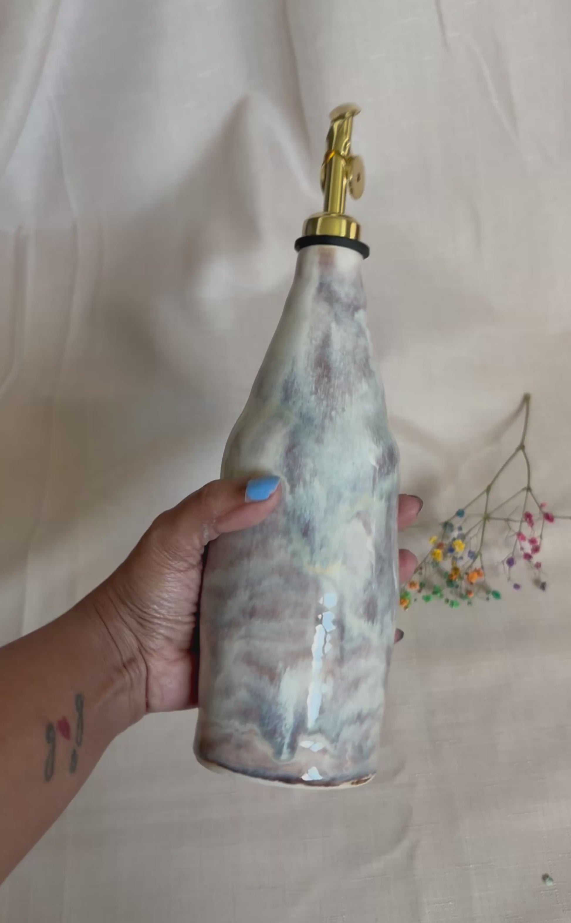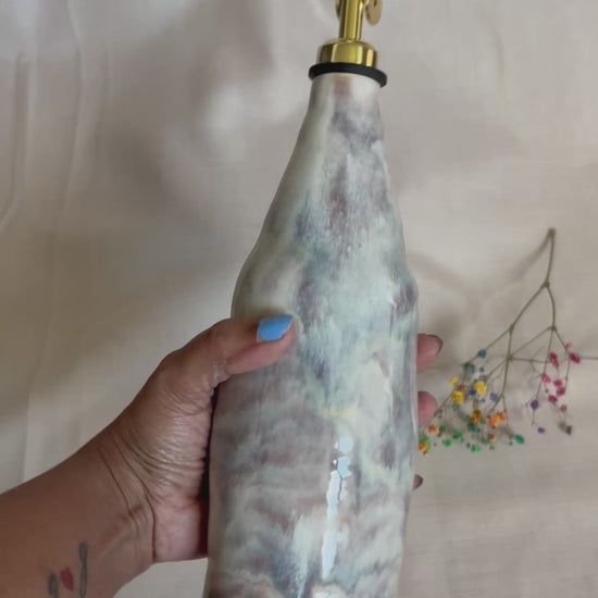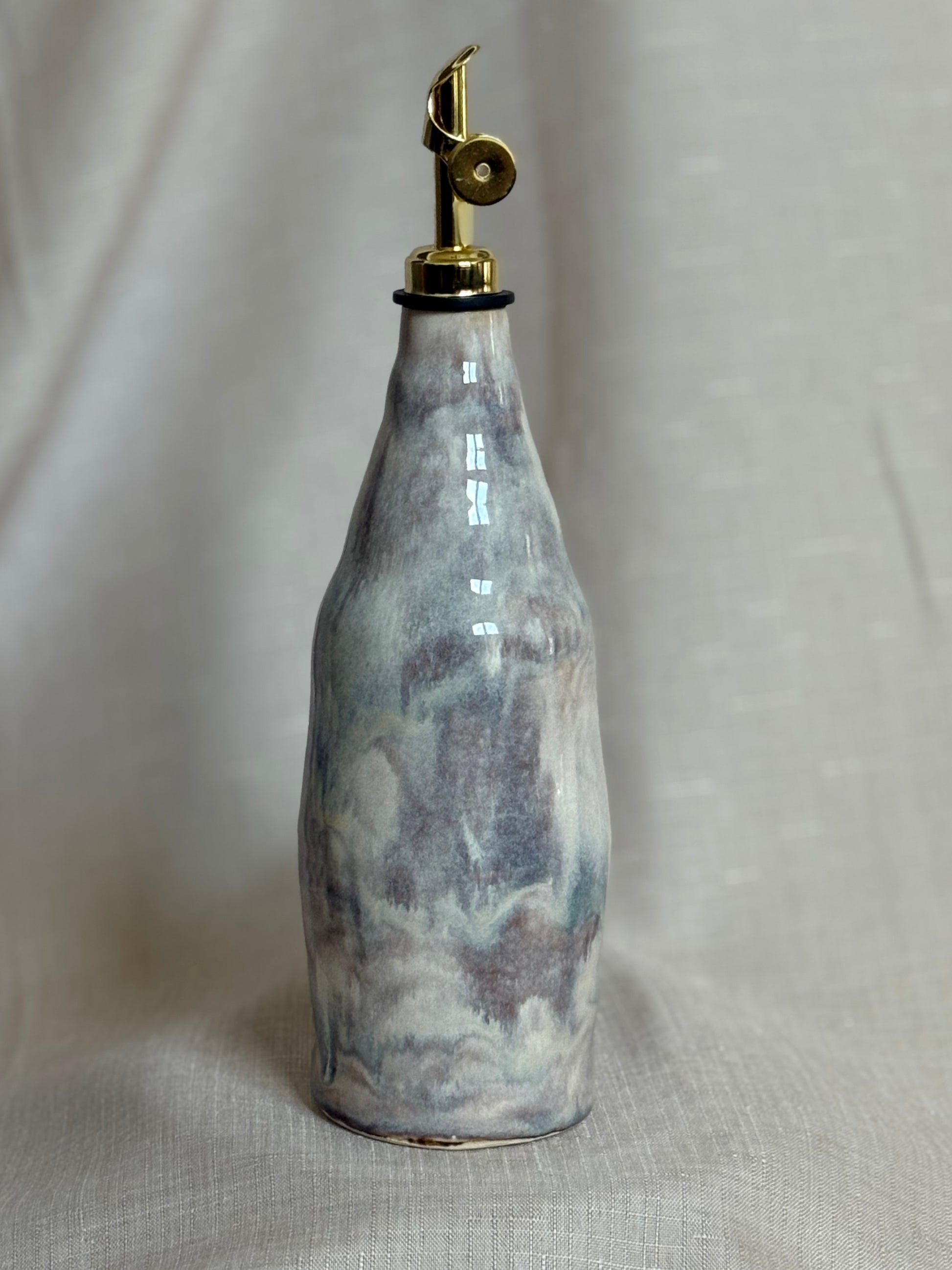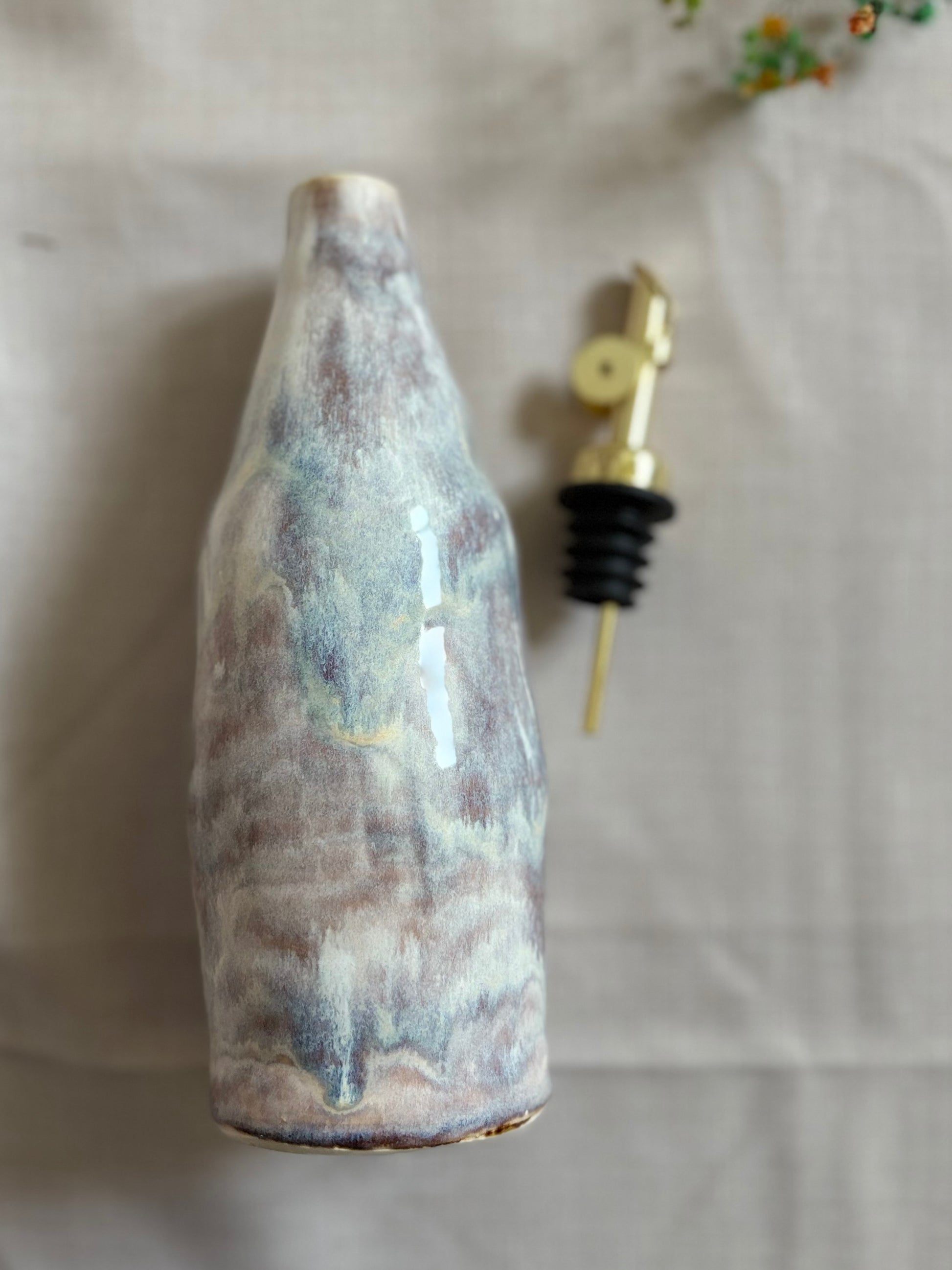 Wheel thrown ceramic olive oil pourers -Thrown with porcelain clay body. Perfect for storing/ using olive oil vinegar or other liquids. Adds artistic charm to the kitchen counter or dining table. It is 21cm tall (27cm with the spout)
