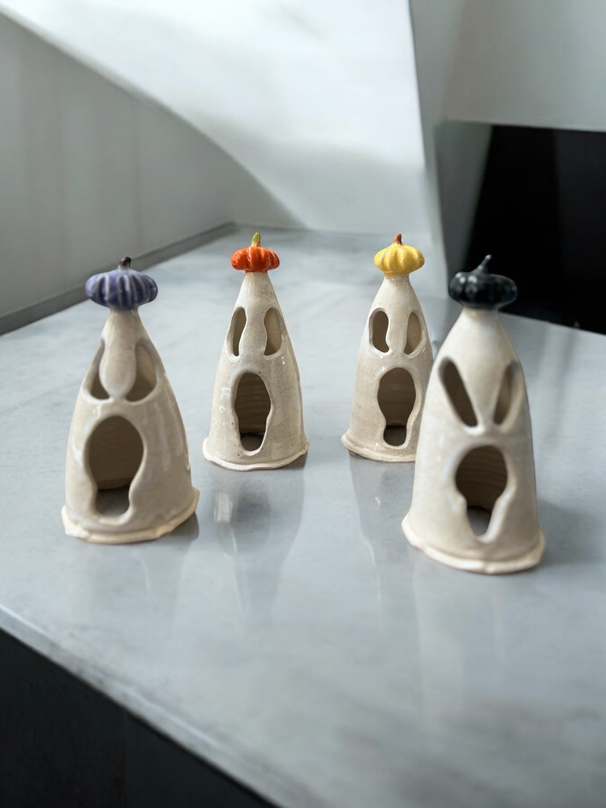 This Pumpkin hat ghost is thrown in a closed form on the wheel. It is later trimmed and carved with a handle built pumpkin. The pumpkin hat is available in different colors.