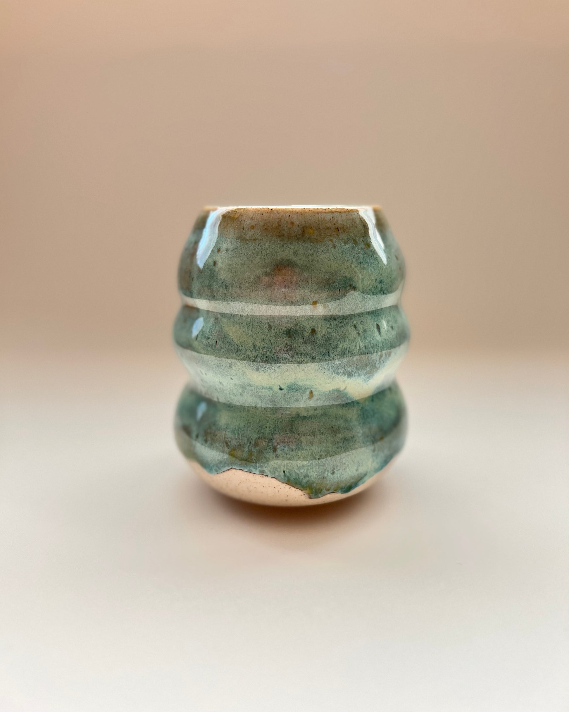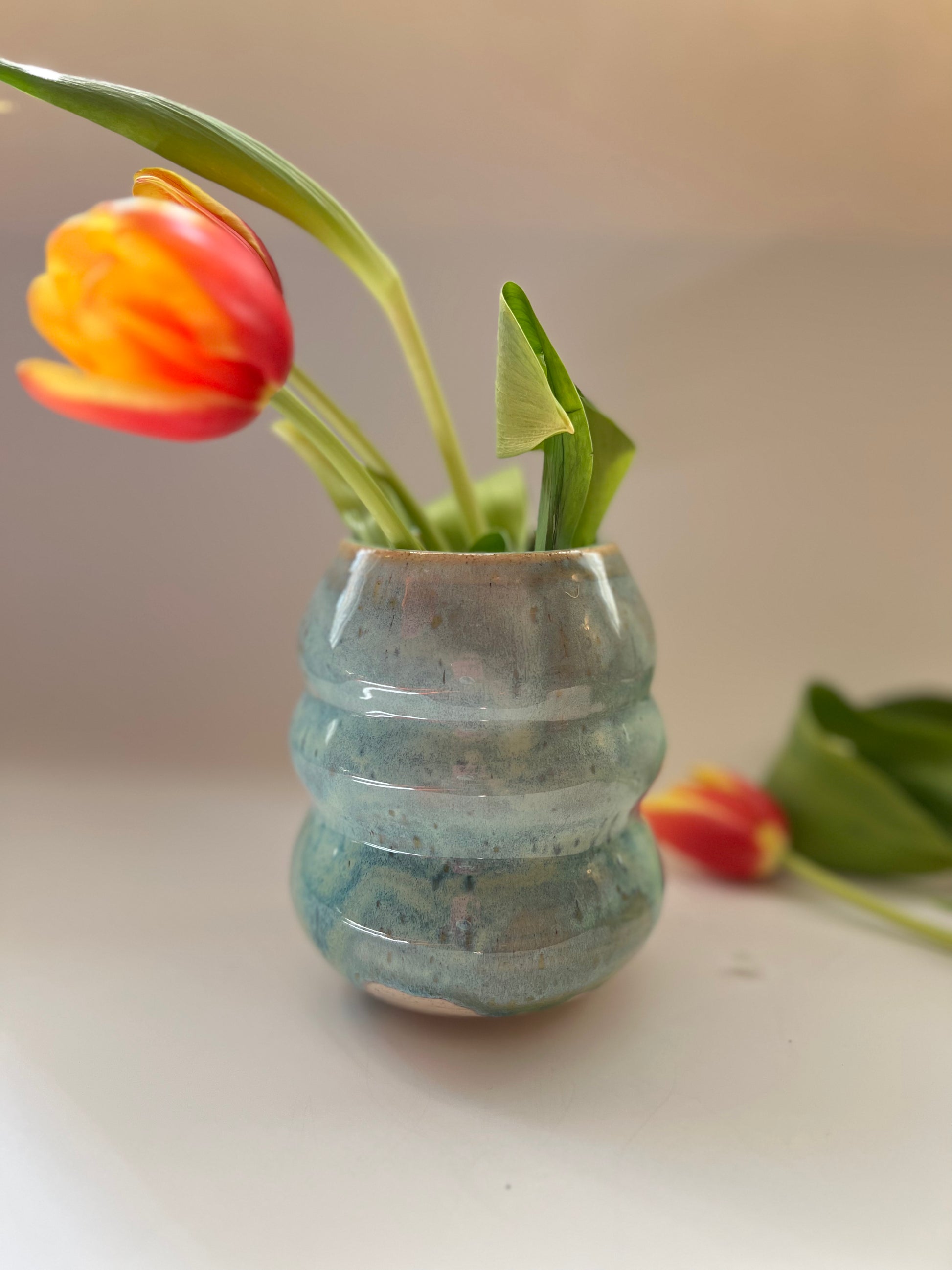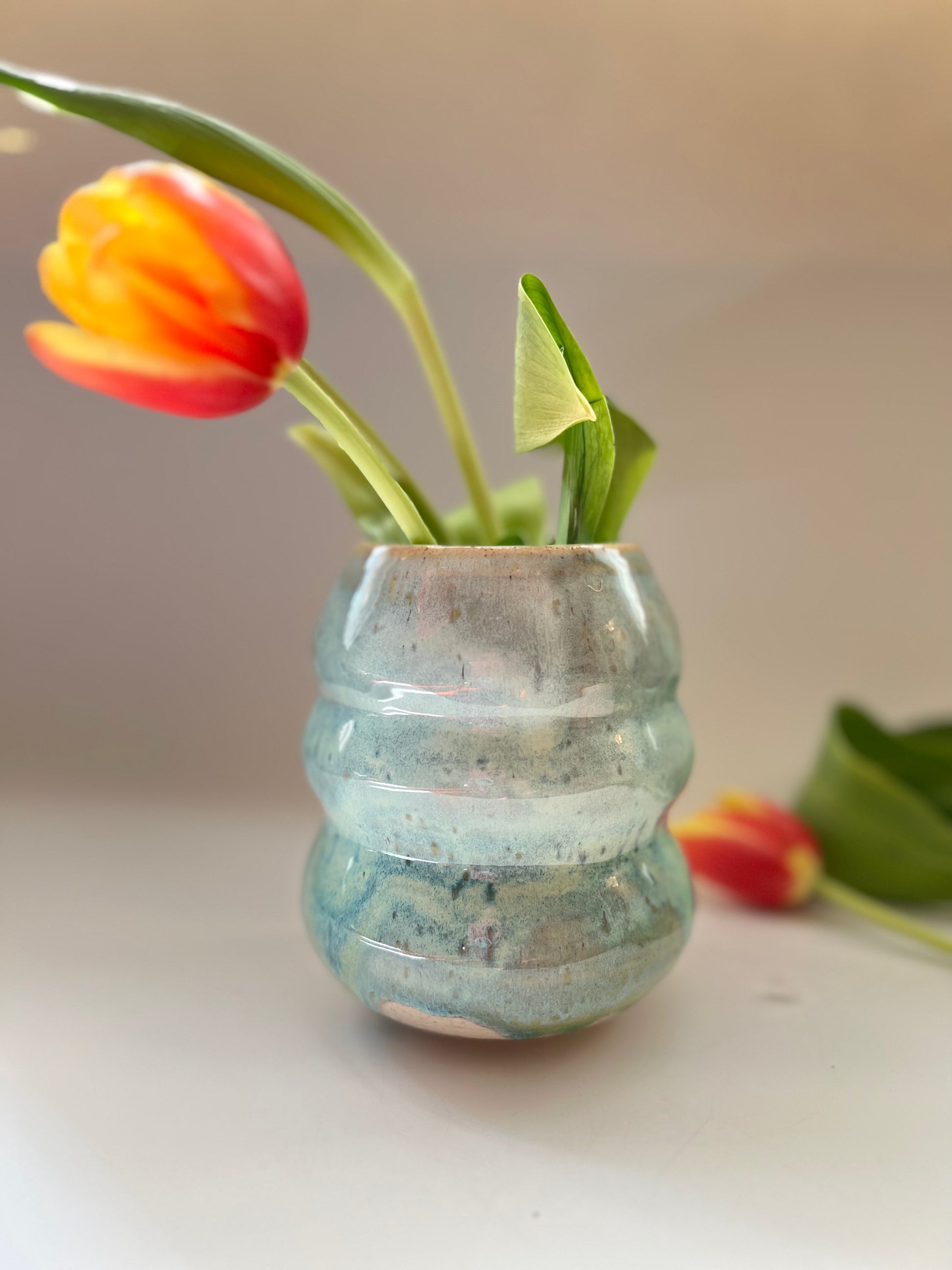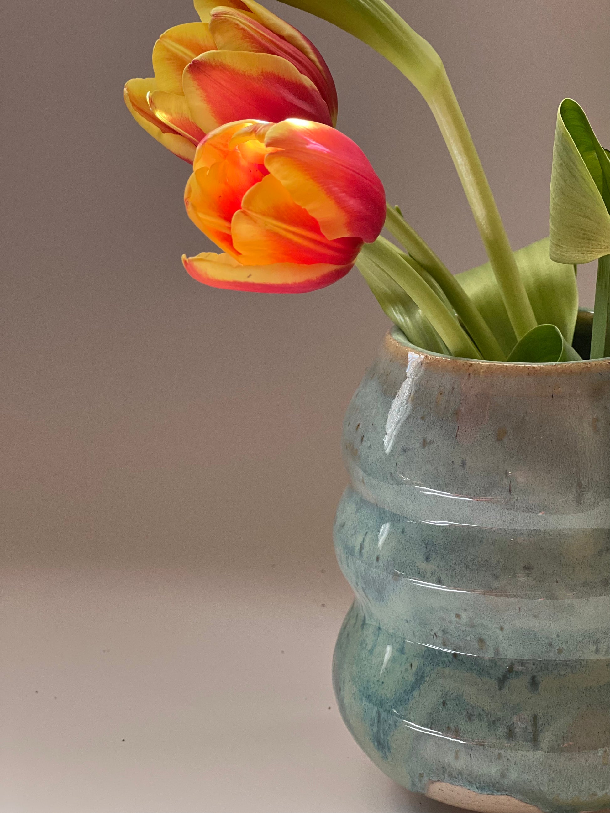 This sea inspired one of a kind vase is made of white stoneware. It is thrown and trimmed on the wheel. It has two different brush on glazes layered to it and fired to a higher temperature. Both the inside and outside are glazed which makes it waterproof and functional.