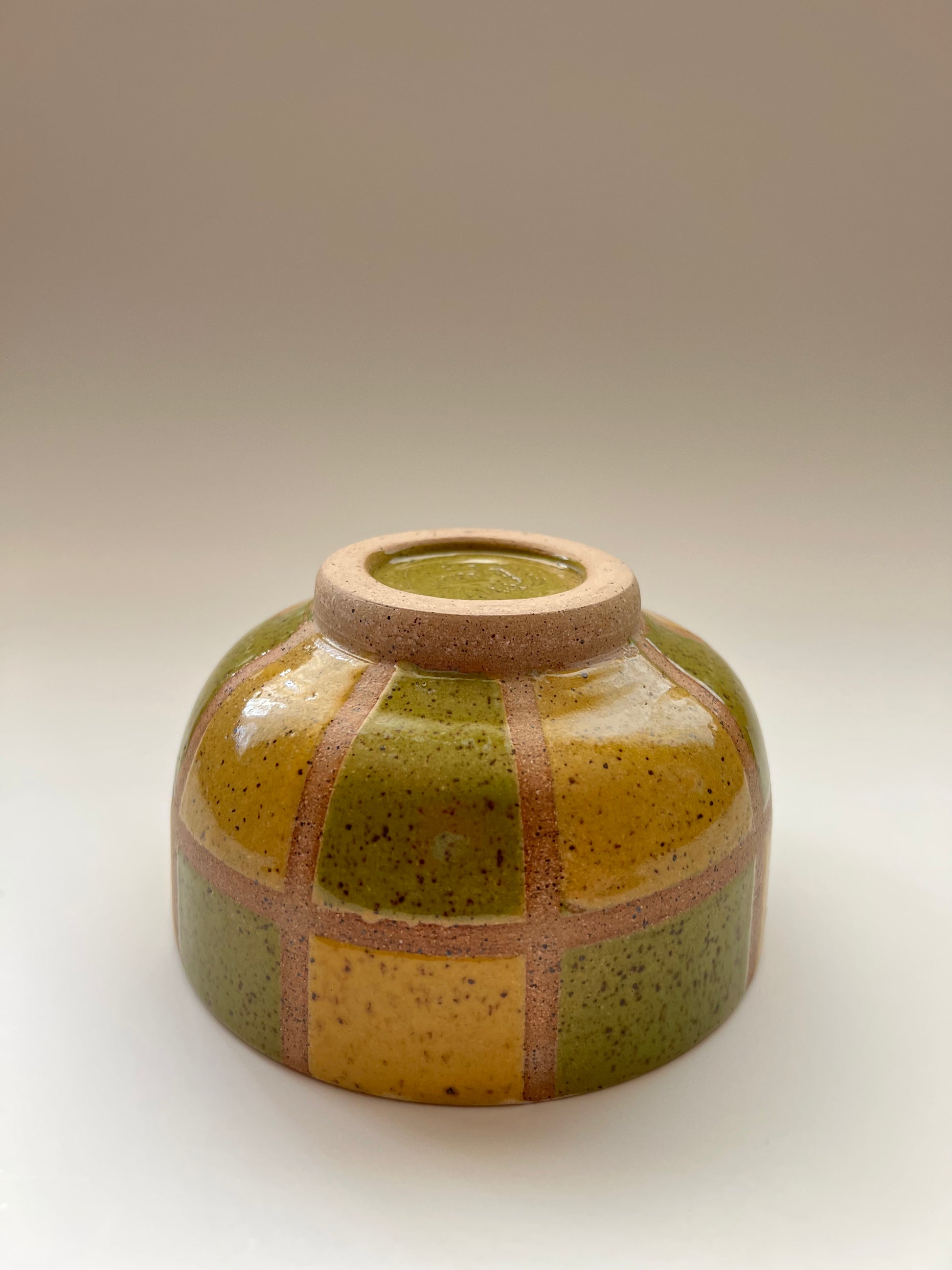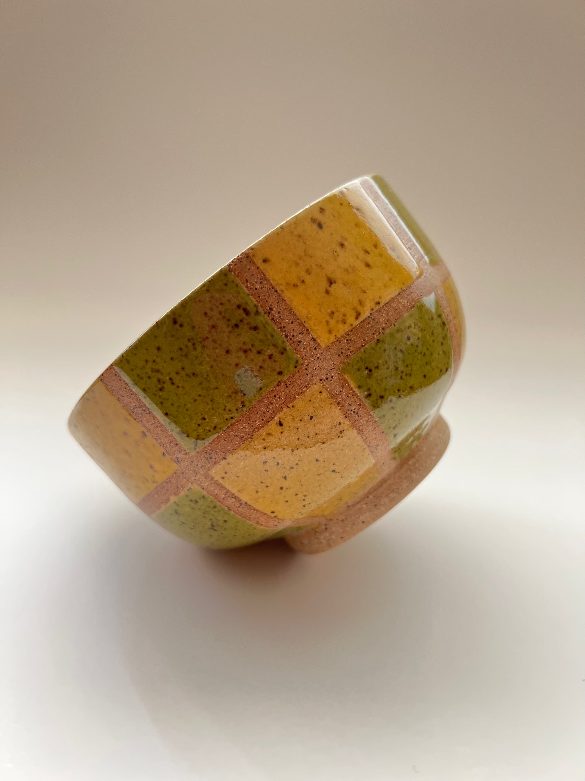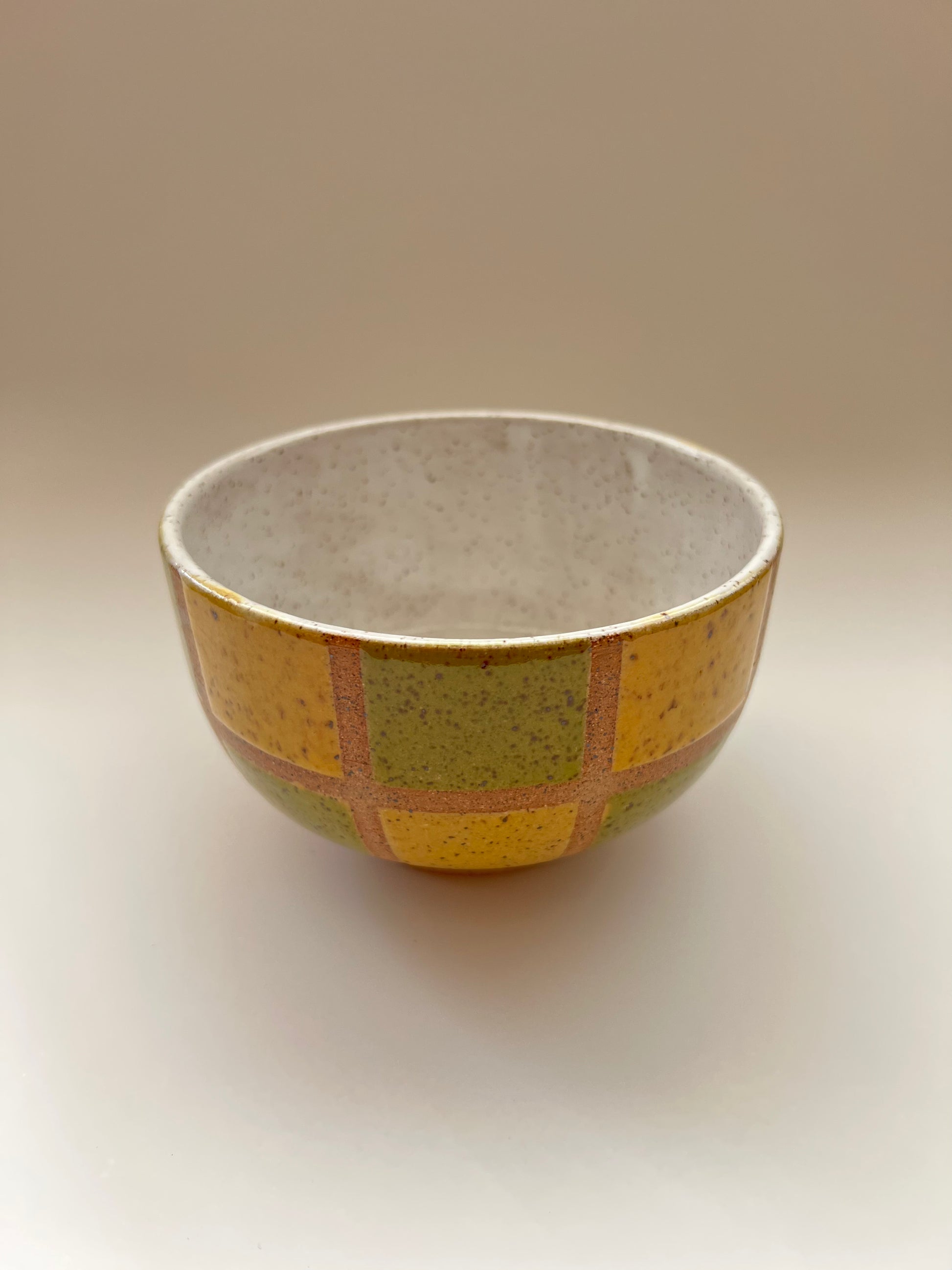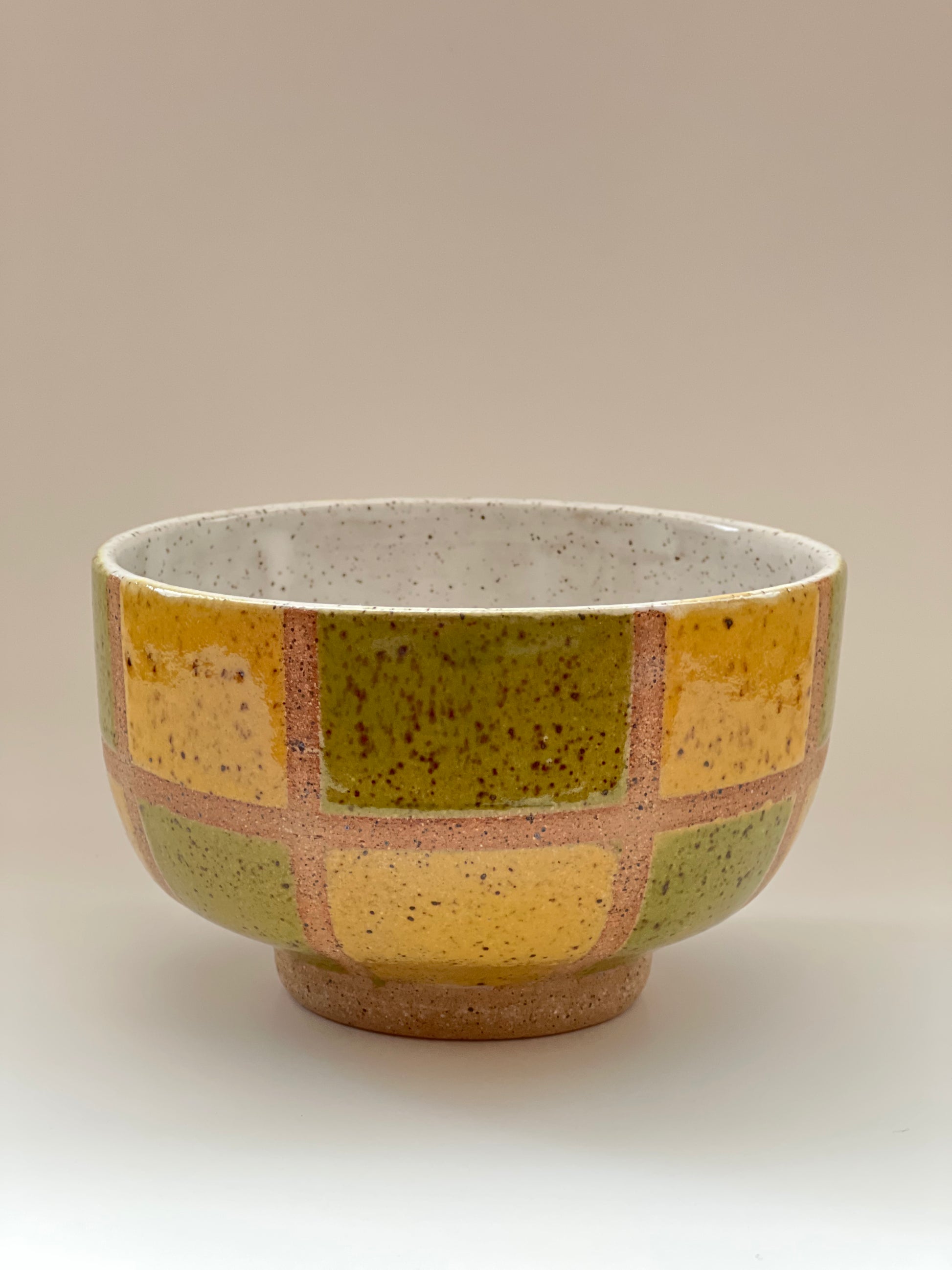 Made with speckled clay and has two different brush on glazes in a checked pattern to give a vibe of spring and summer. Inside has a different brush on glaze. All of the pots are food safe, microwave safe and dishwasher safe .Although handwashing is recommended to make it last long.