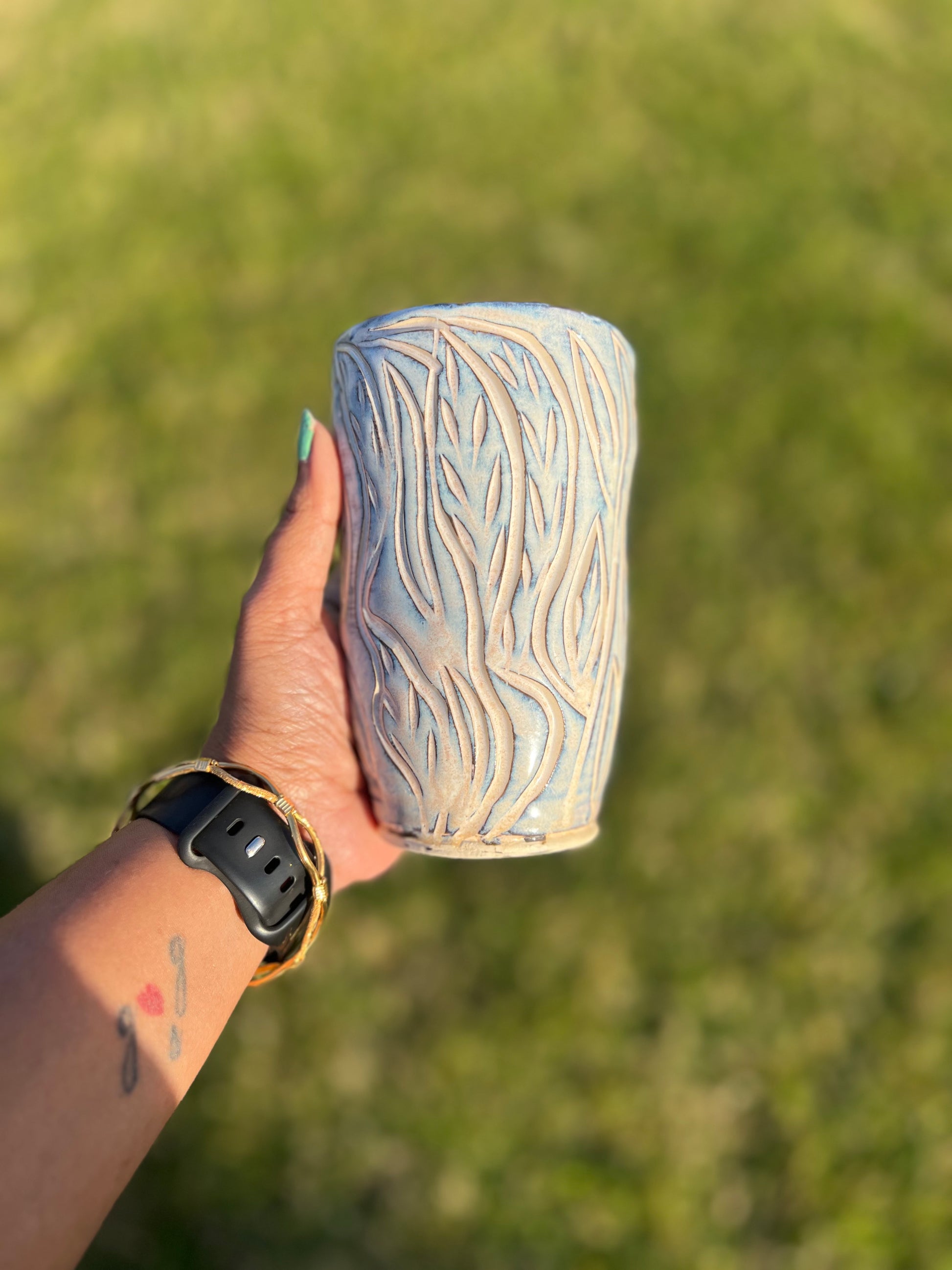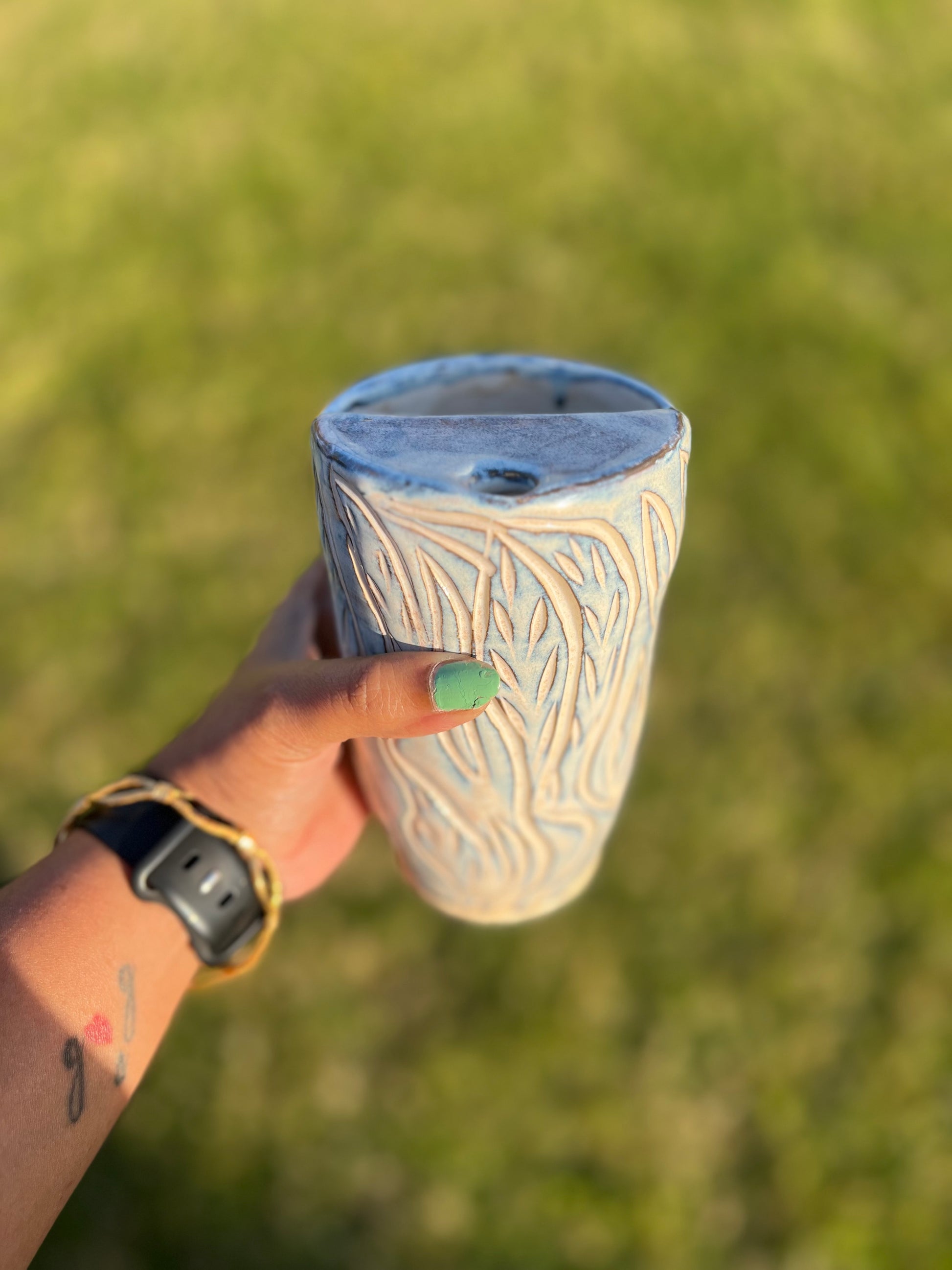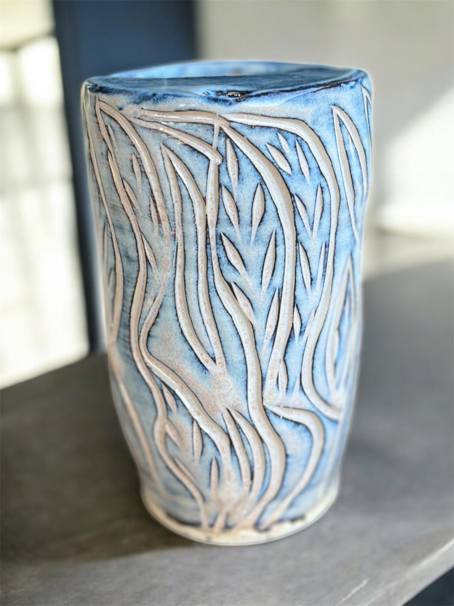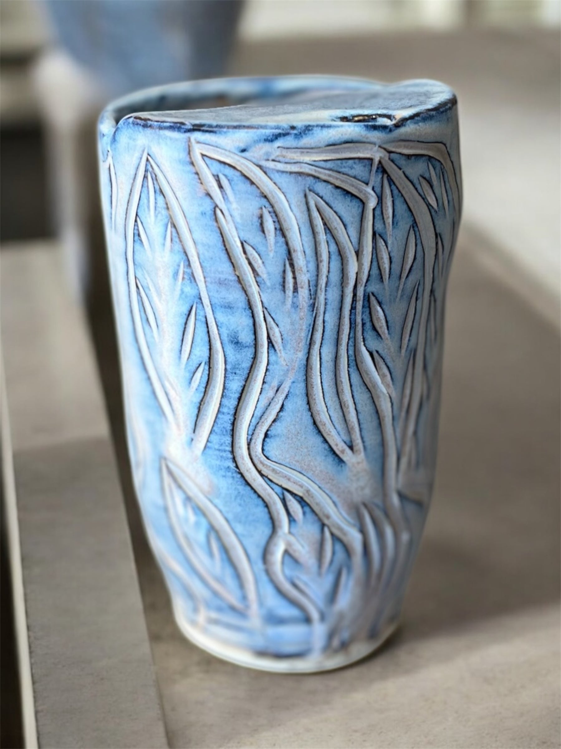 Wheel thrown porcelain coated with black slip! Carved and glazed at cone 6