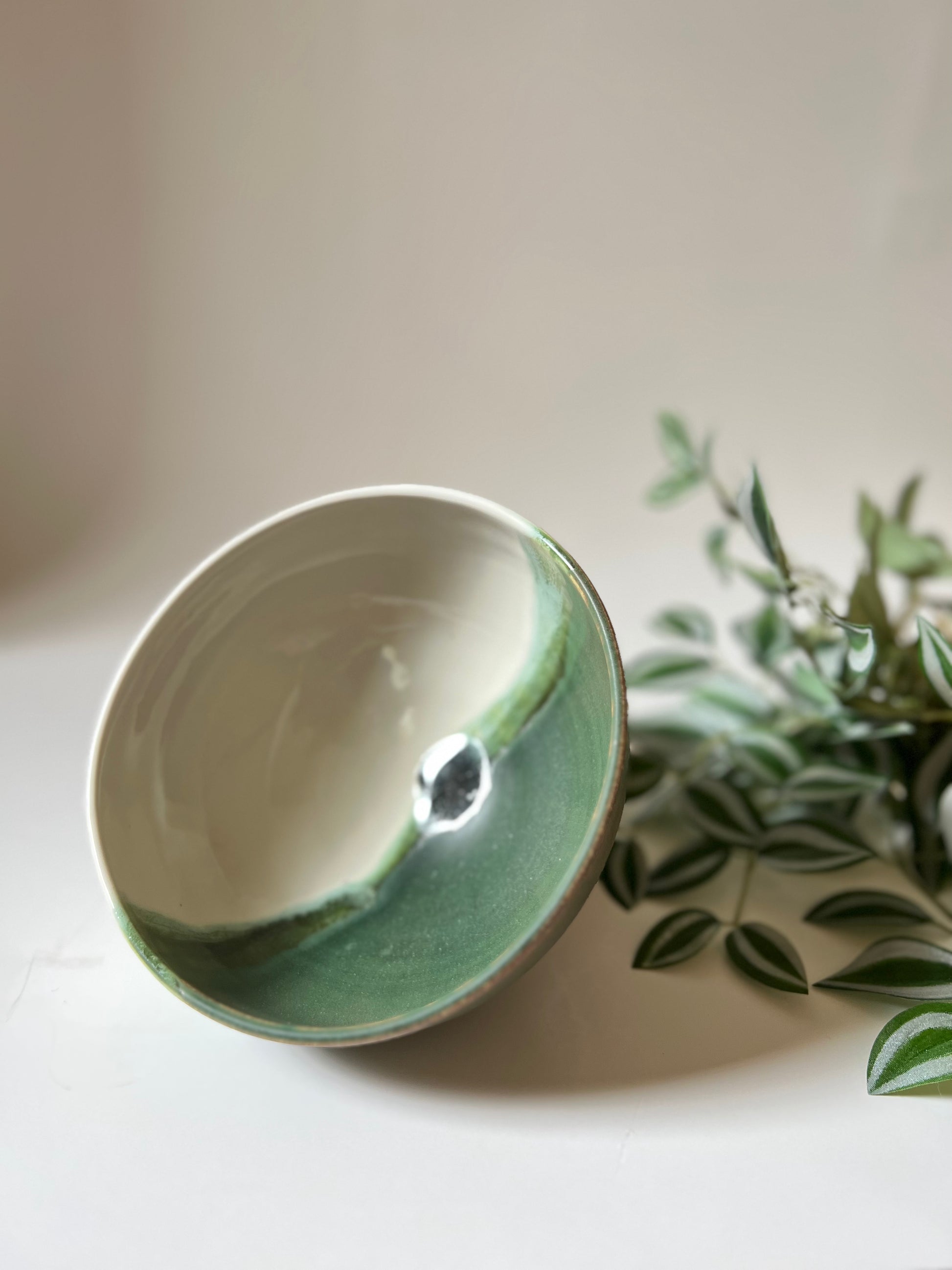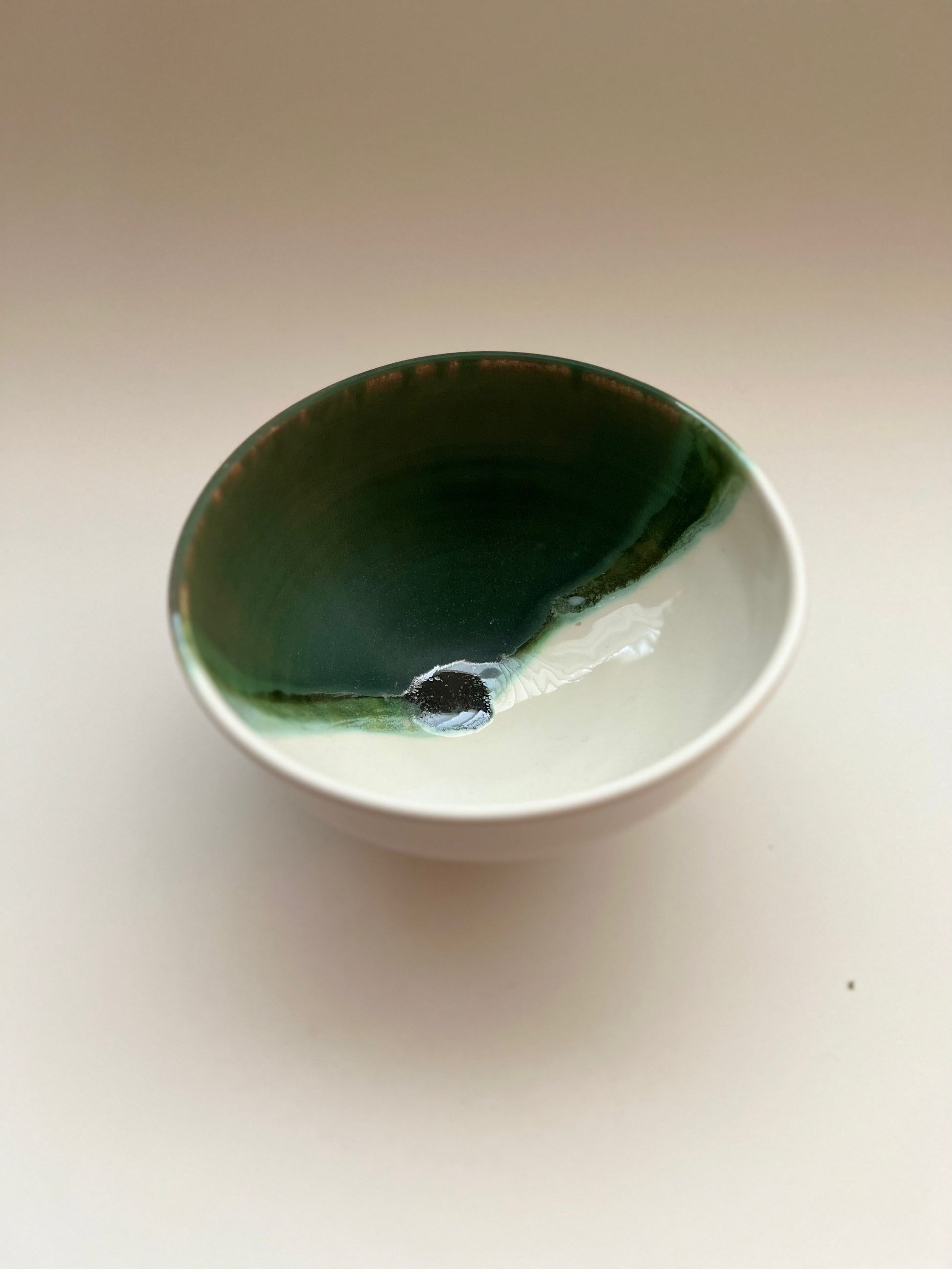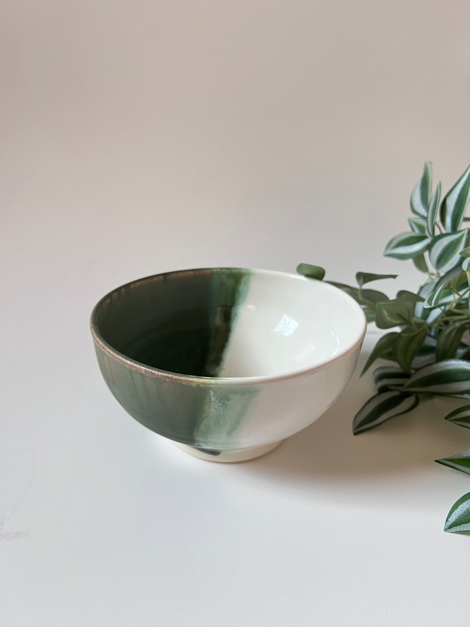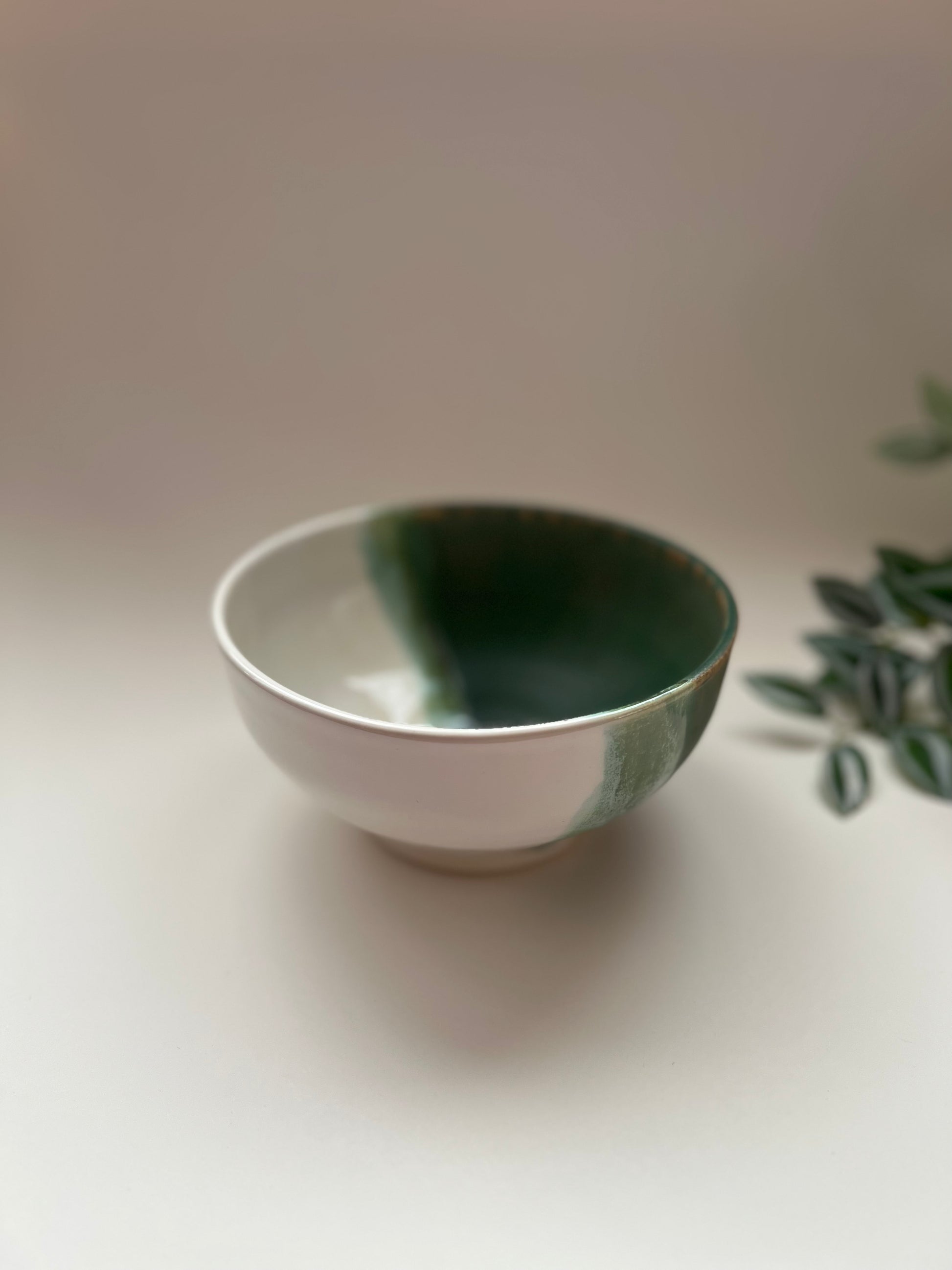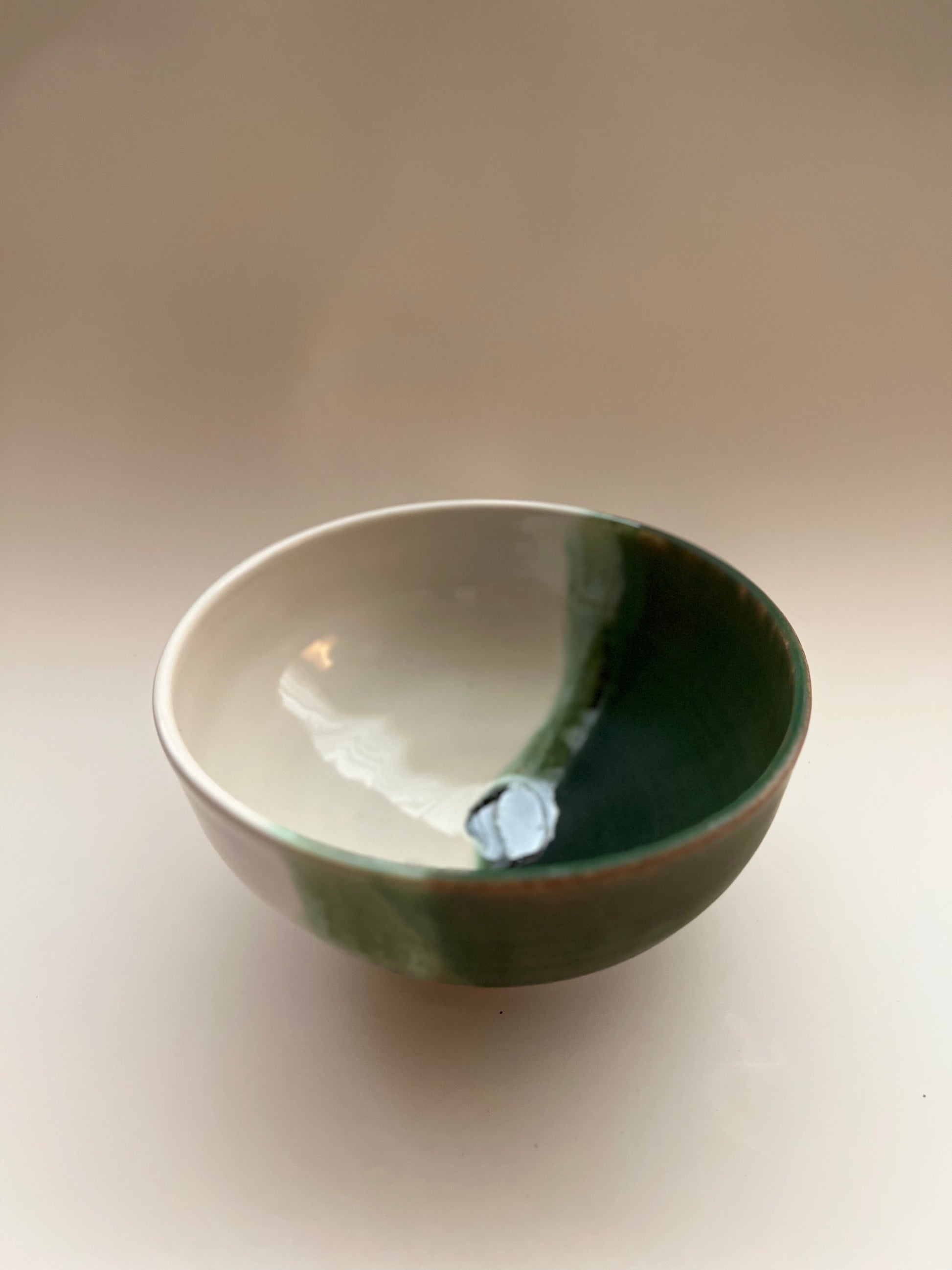 This bowl is made of white stoneware. Thrown and trimmed on the wheel. It is glazed with a matte glaze on one side and glossy glaze on the other side . It creates a interesting overlap where the glazes meet in the middle. All of the pots are food safe, microwave safe and dishwasher safe Although handwashing is recommended to make it last long.